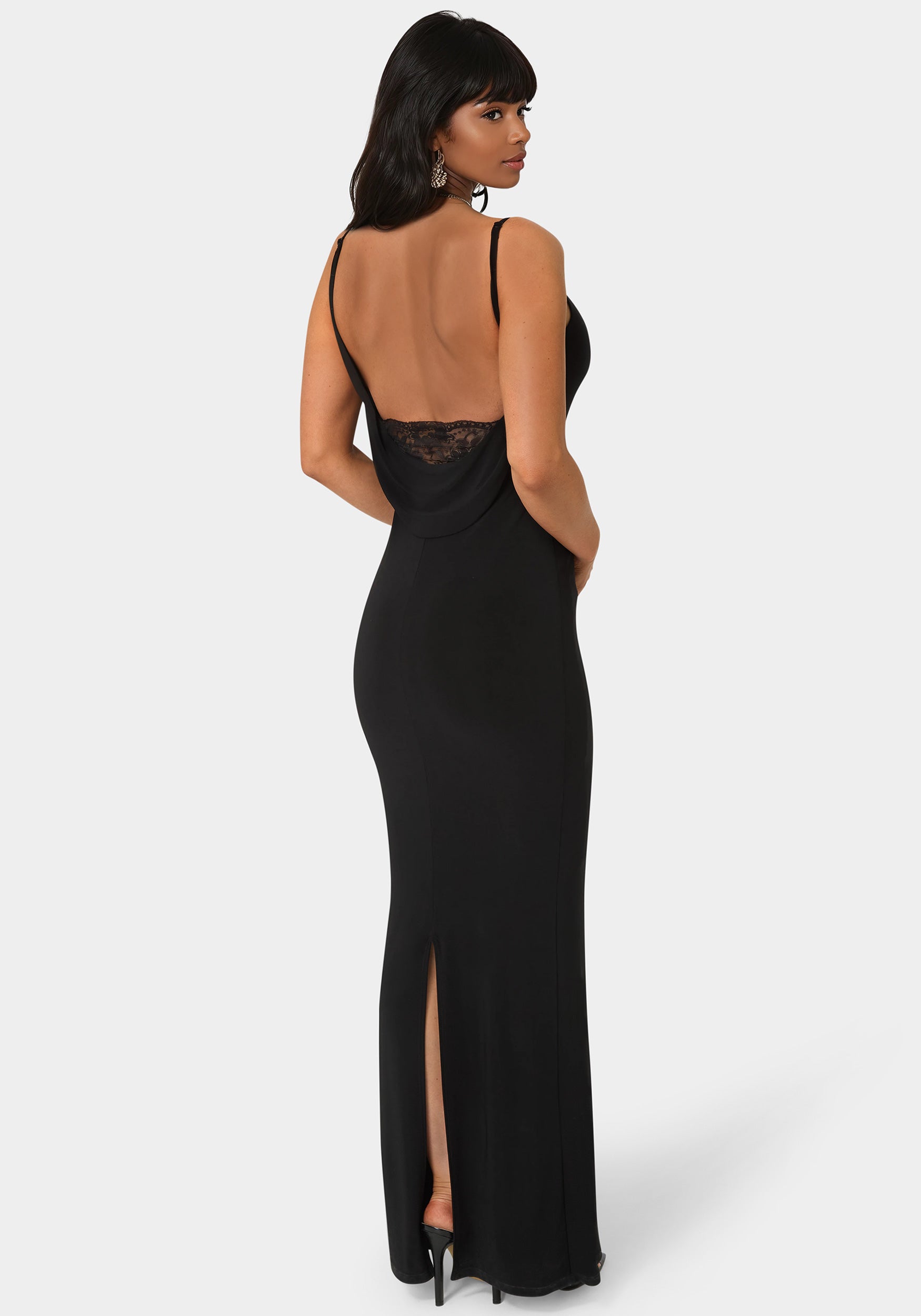 Sultry meets romantic in this backless maxi featuring delicate lace insets. Perfect for intimate dinners or enchanting celebrations. it’s designed to make an impression from every angle.