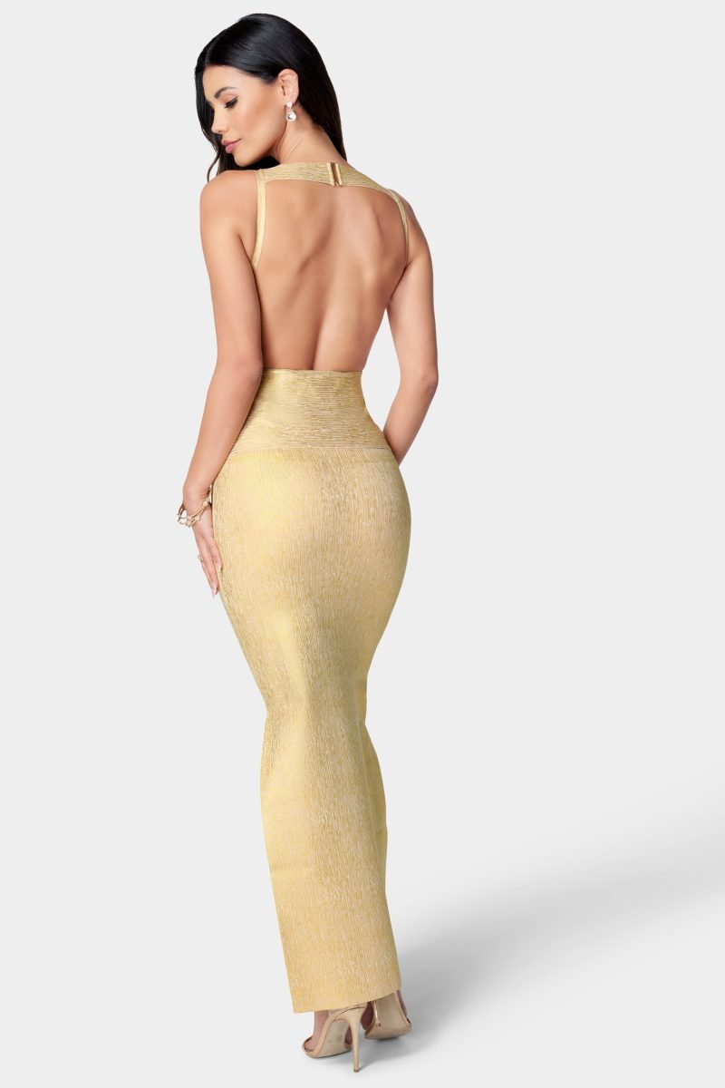 Get ready to dazzle in this luxurious gold bandage dress. With a gorgeous metallic column design. you’ll shine bright at your next special event.