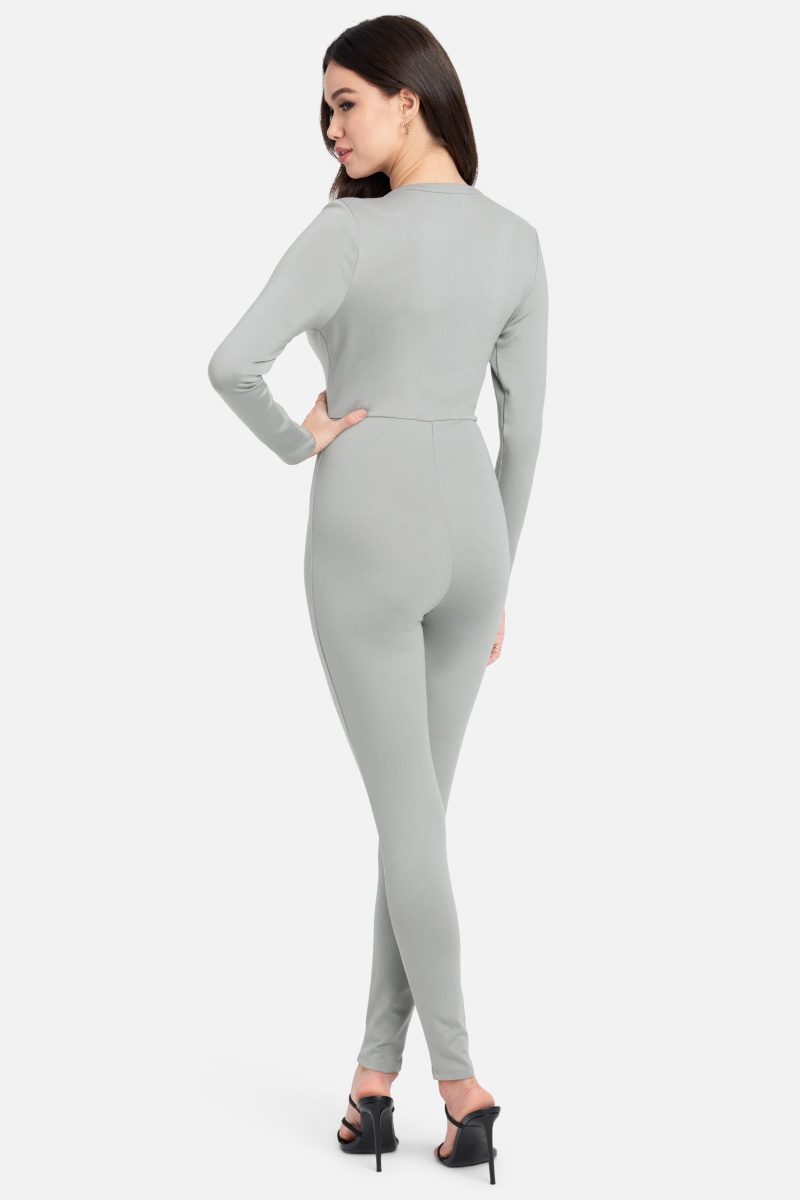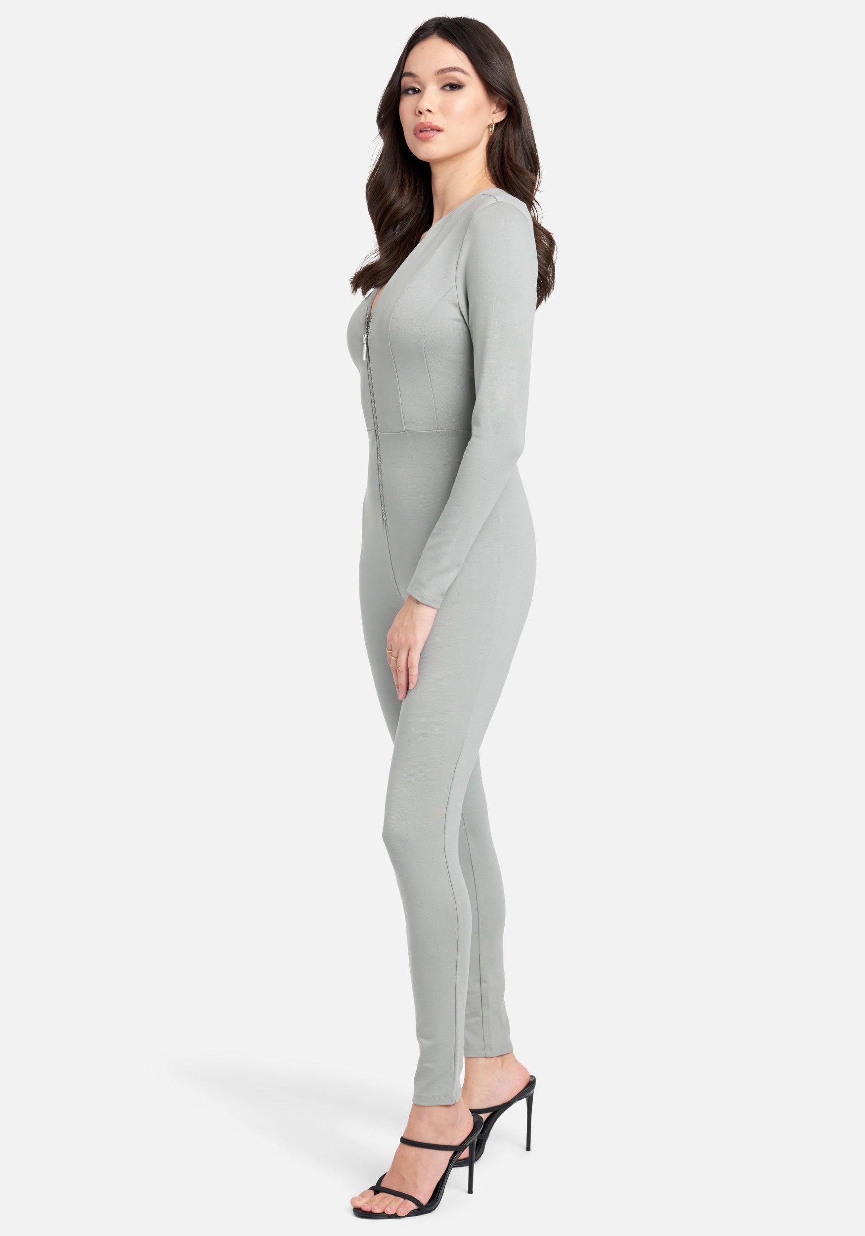 Sleek and sexy. this catsuit gets edgy with moto styling that includes zips. a stand collar and a belt-detailed waist. Comes in a stretchy Ponte that maximizes curves. Exposed front zip closure.