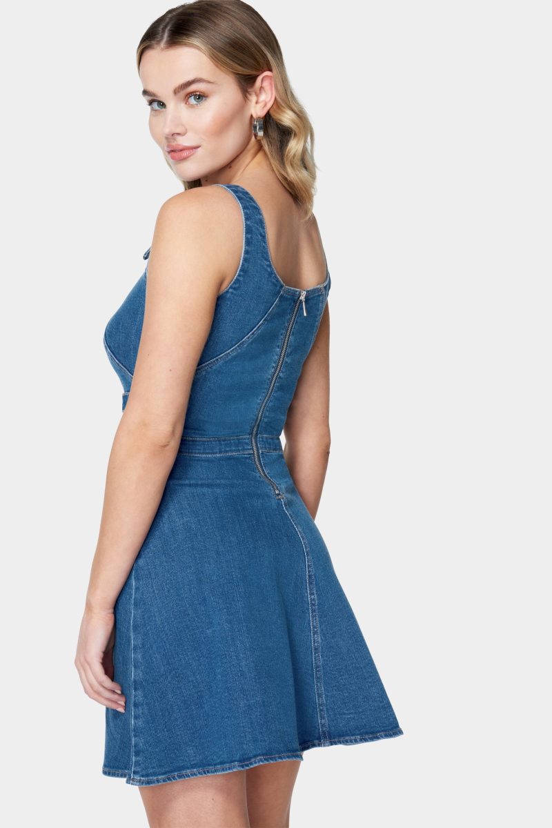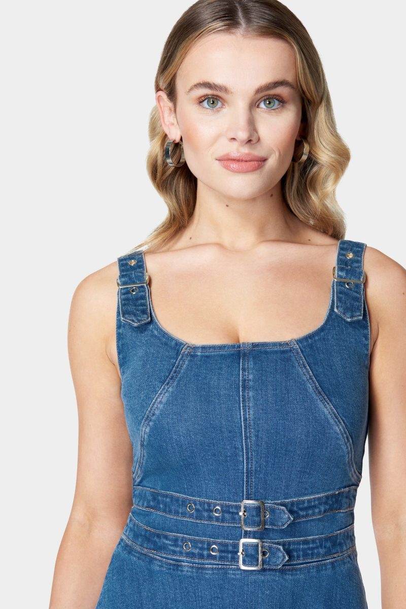 This flare denim dress is giving major vintage vibes. A belt-buckle waist detail and flare skirt create a romantic hourglass silhouette.