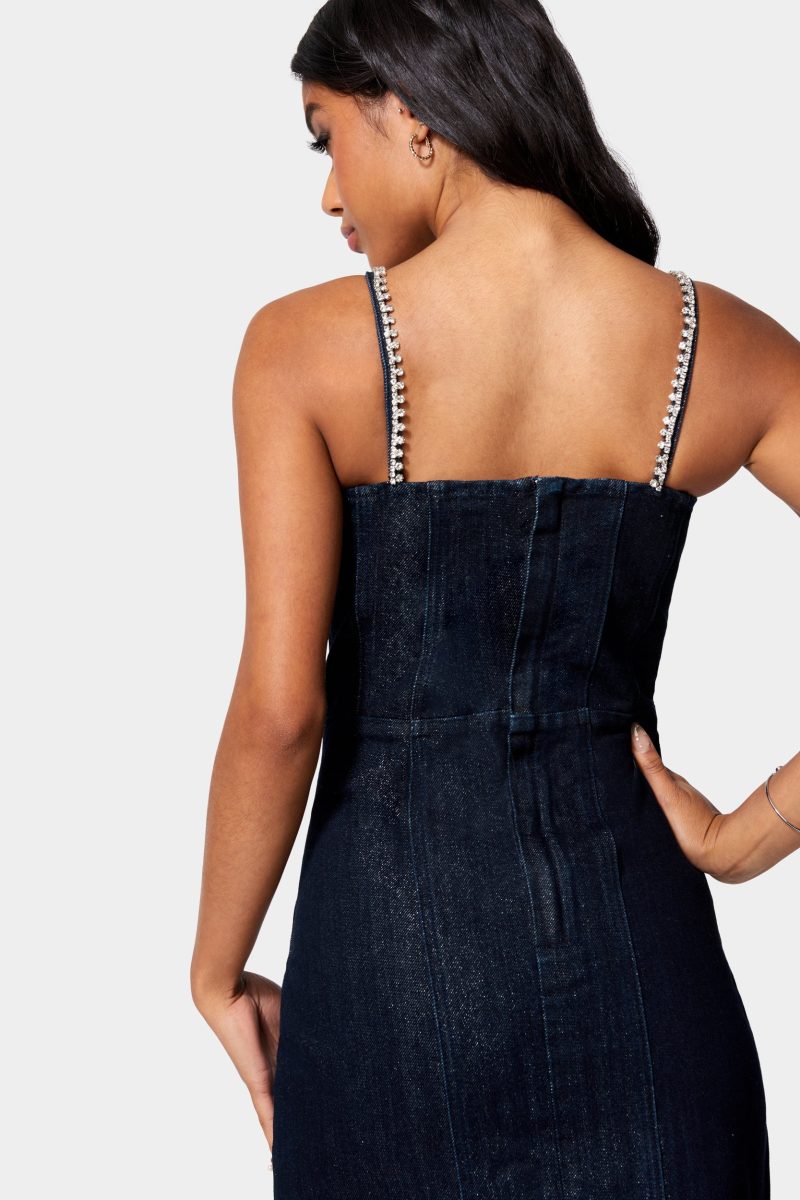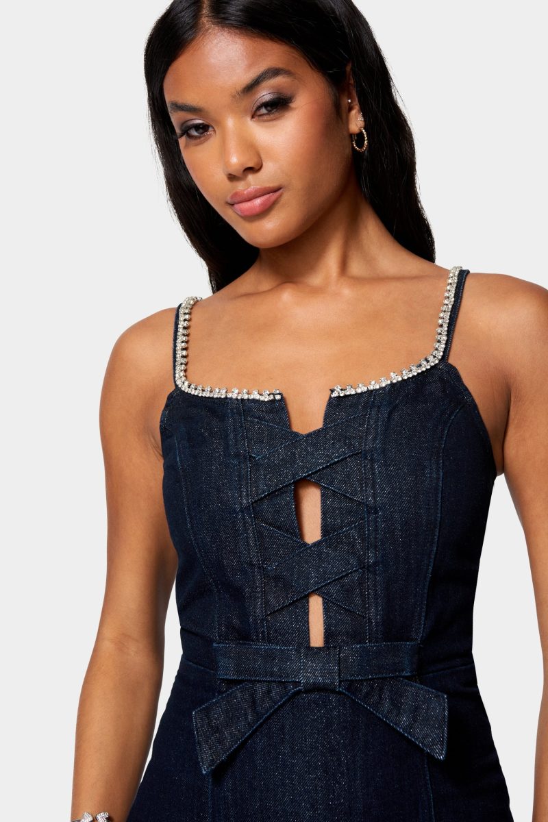 Bow Detail Rhinestone Strap Glitter Denim Dress