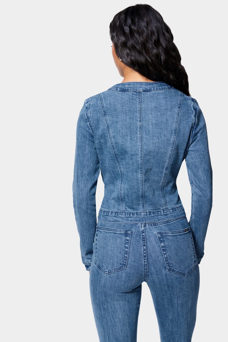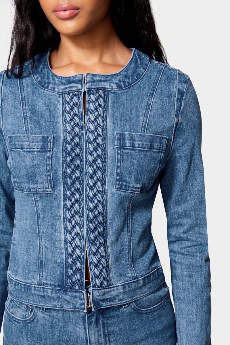 Got the blues. In a true medium wash. this vintage stretch denim jacket features braided trim. seam-stitched details. front pockets. and a fitted silhouette.