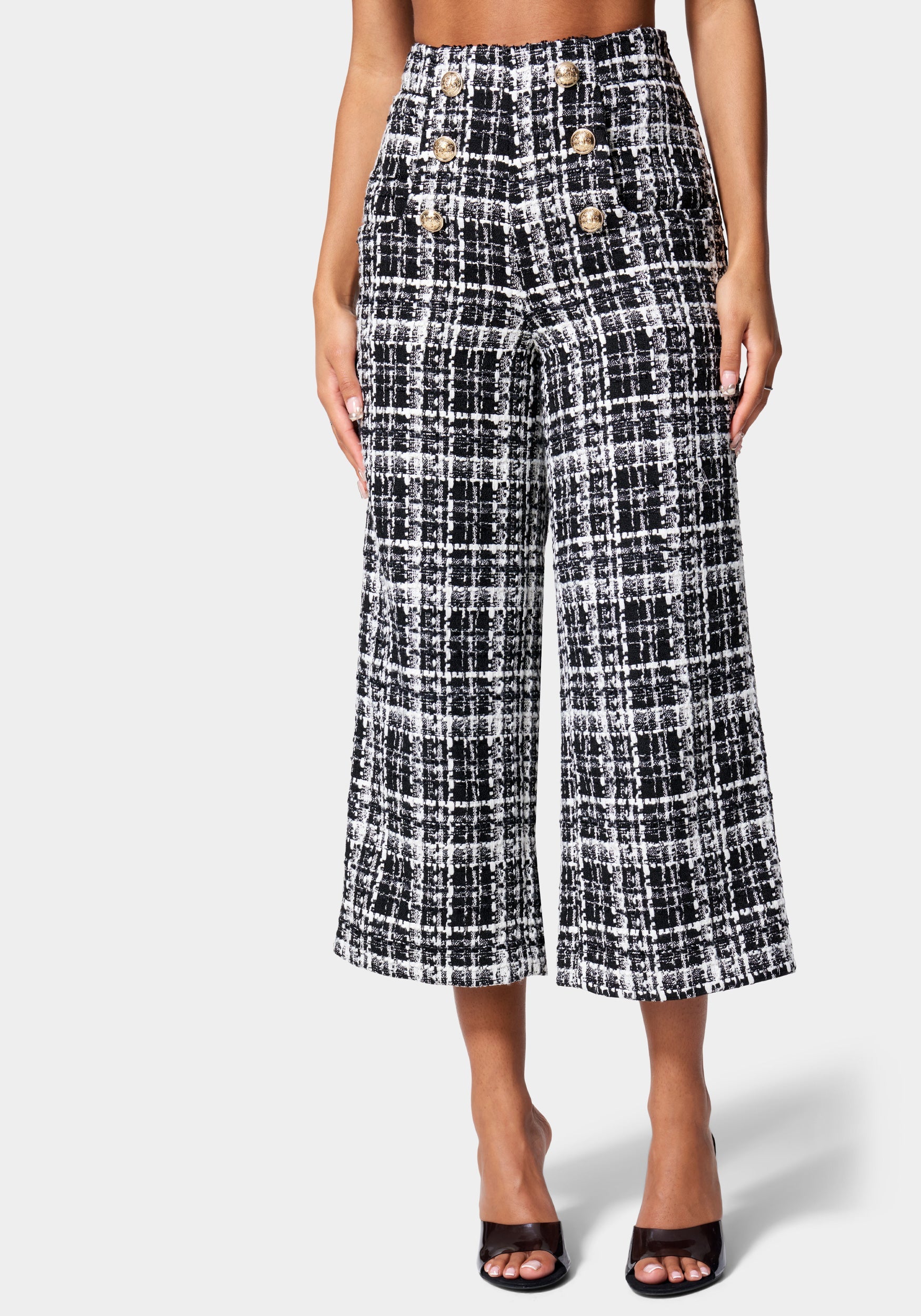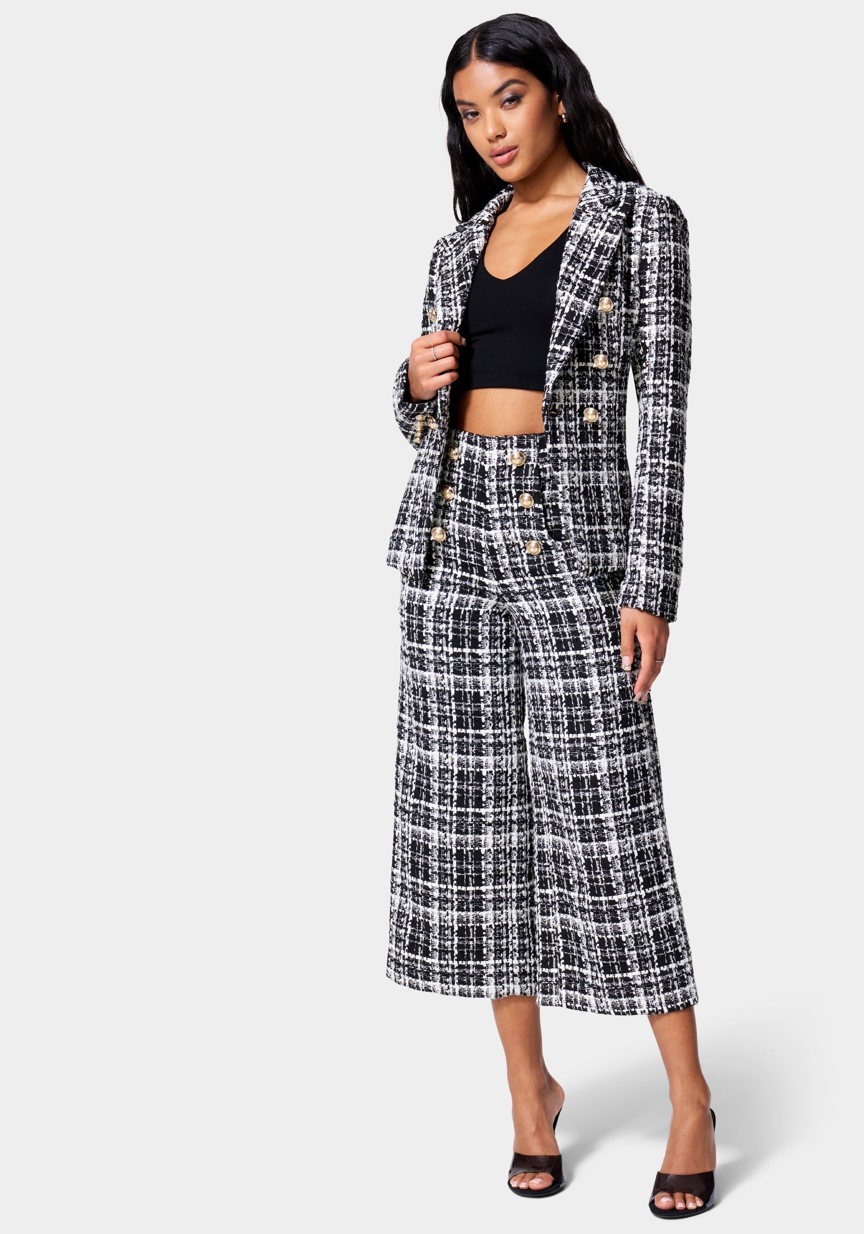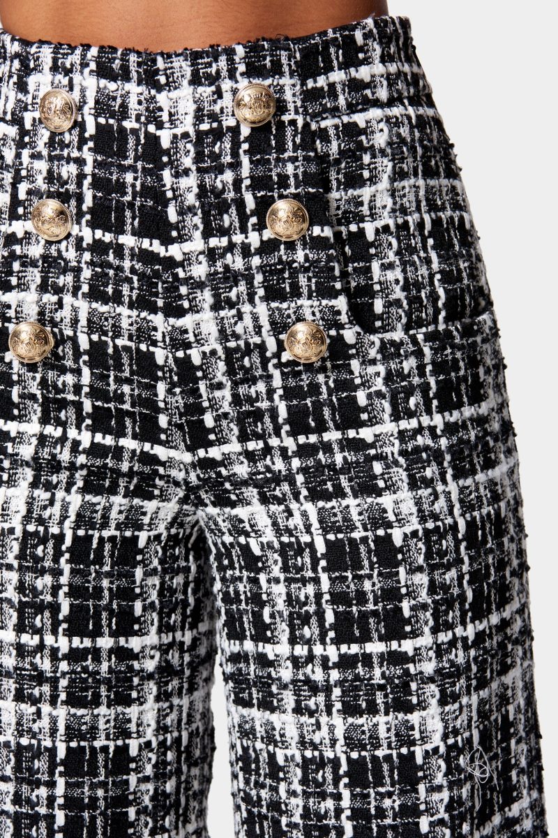 A classic tailored culotte pant gets a fall update with soft boucle and button hardware details. Pair it with the matching blazer jacket for the ultimate prep style.