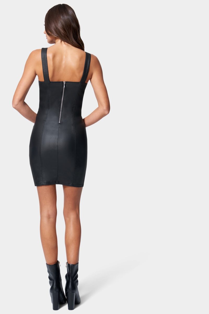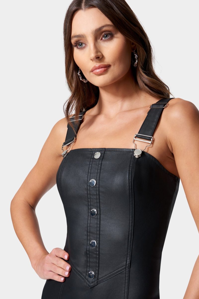 Embrace the season in this sultry coated denim dress. Designed with seam-stitched details. button front hardware. back zipper and adjustable straps. this dress pairs perfectly with your fall booties for a night out.