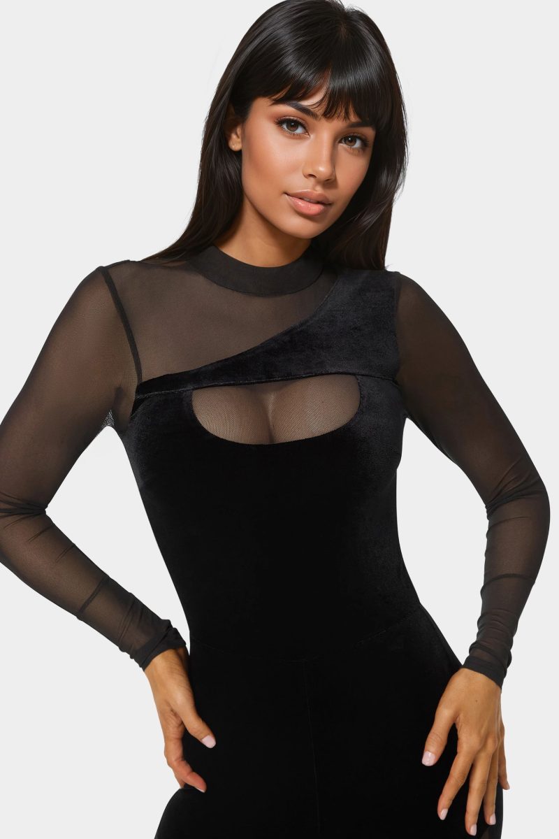 Dive into a fusion of texture and form with a catsuit that’s as daring as it is sleek. Velour wraps your curves in luxury. while strategic mesh inserts tease a glimpse of skin. This piece is all about owning your power and moving with a seductive confidence that commands attention.