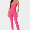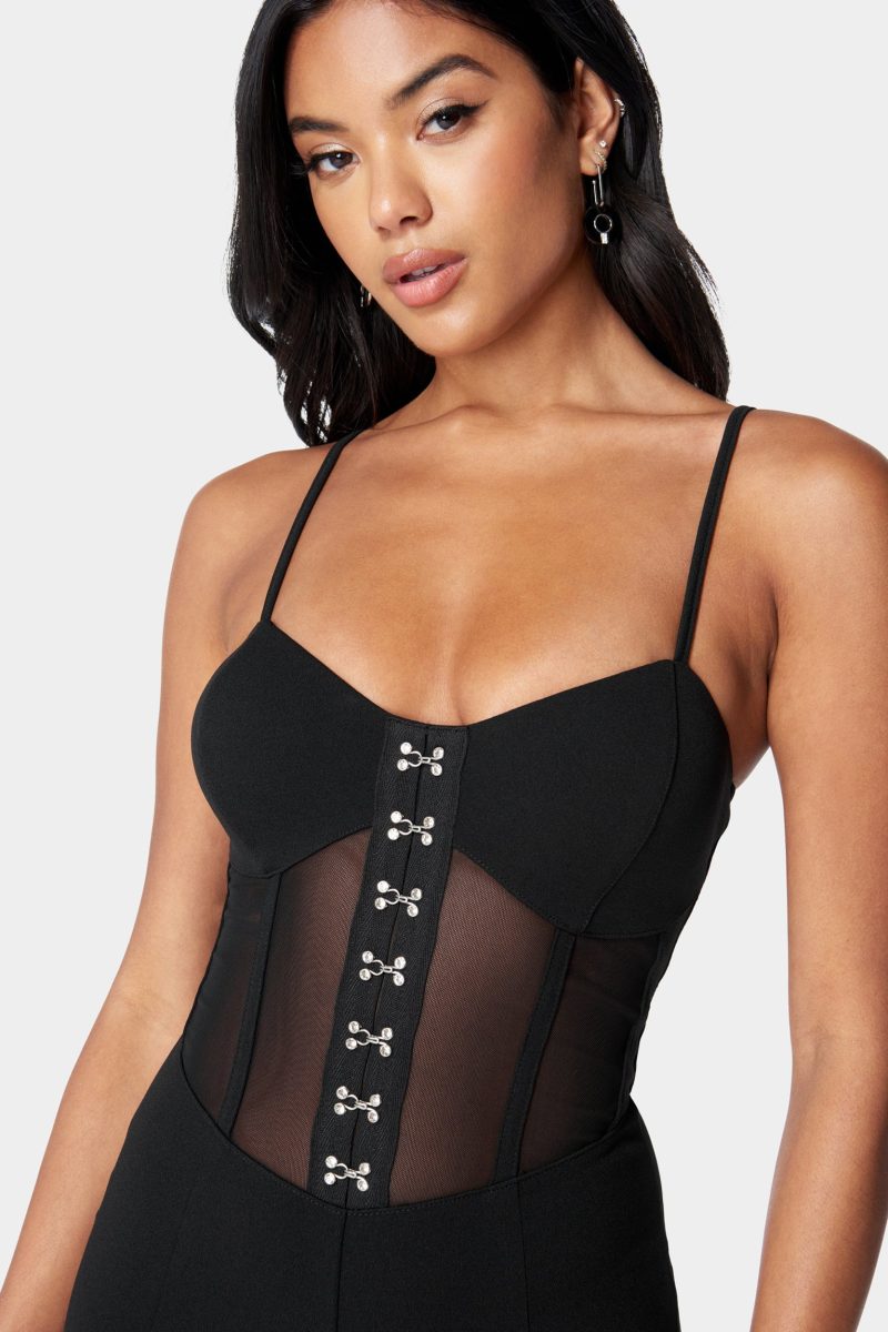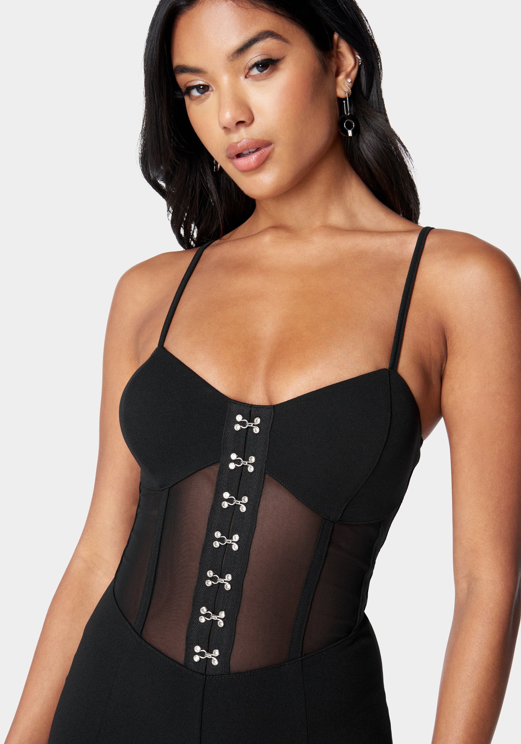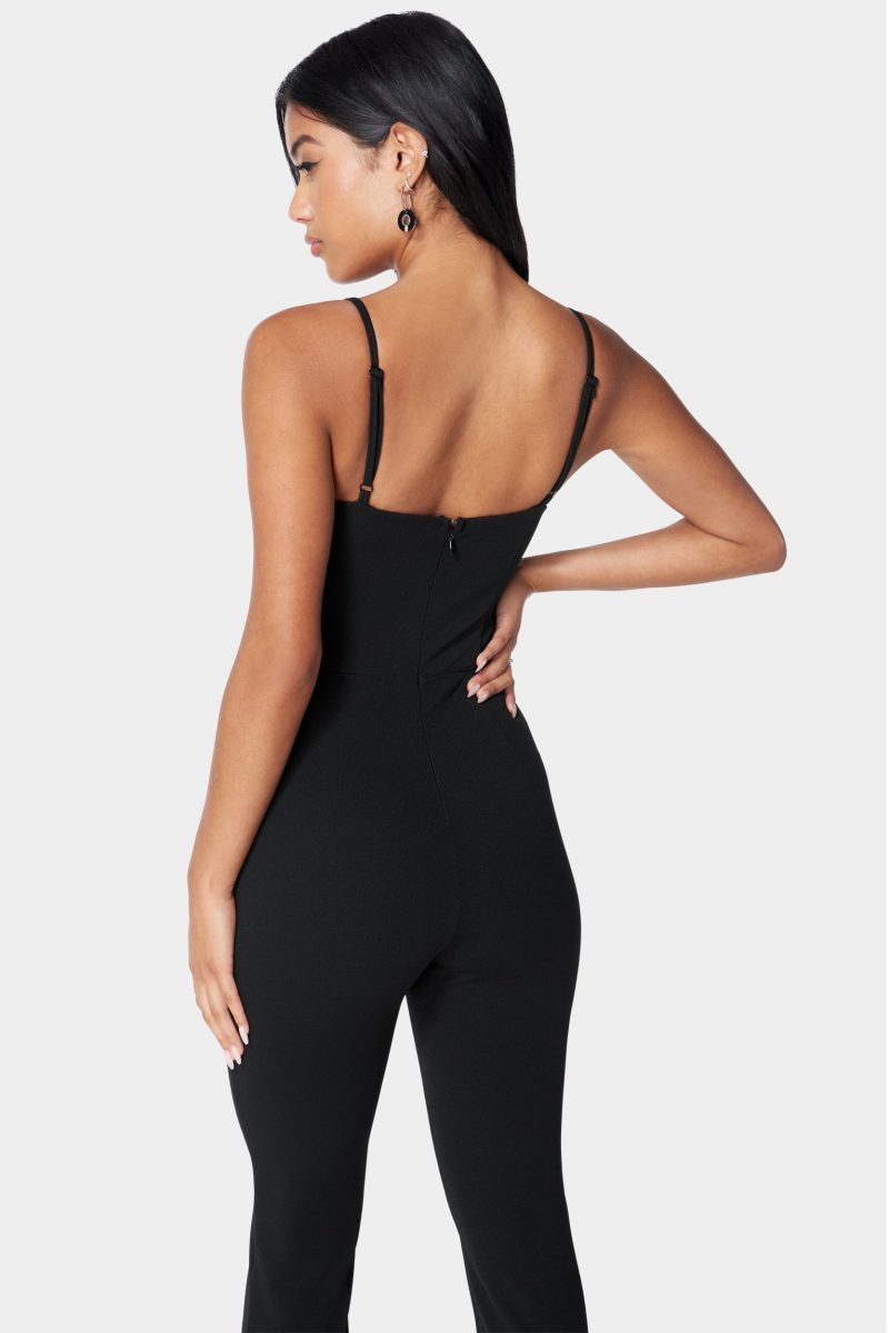 A jumpsuit like no other. this all-in-one fit features a sultry corset waist and slim leg fit that creates a curve-hugging silhouette. Pair with your favorite bebe heels for a sexy date night look.