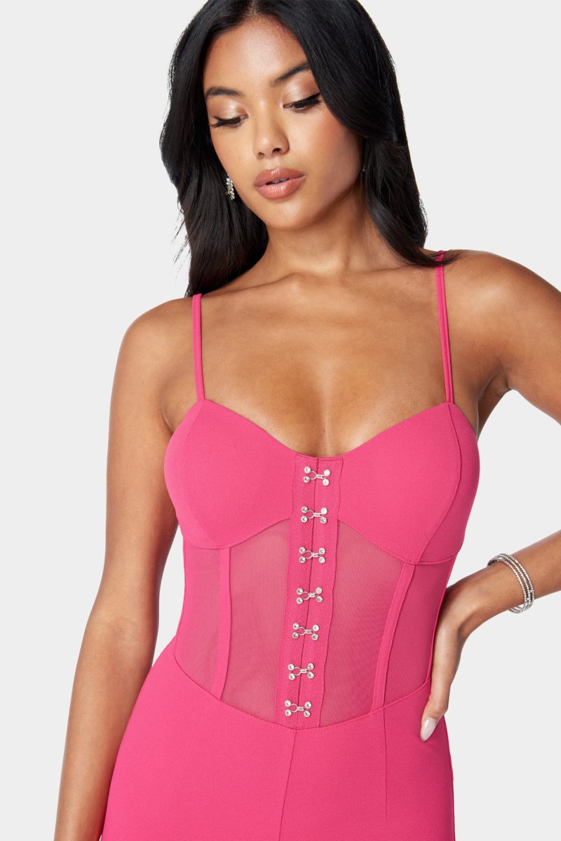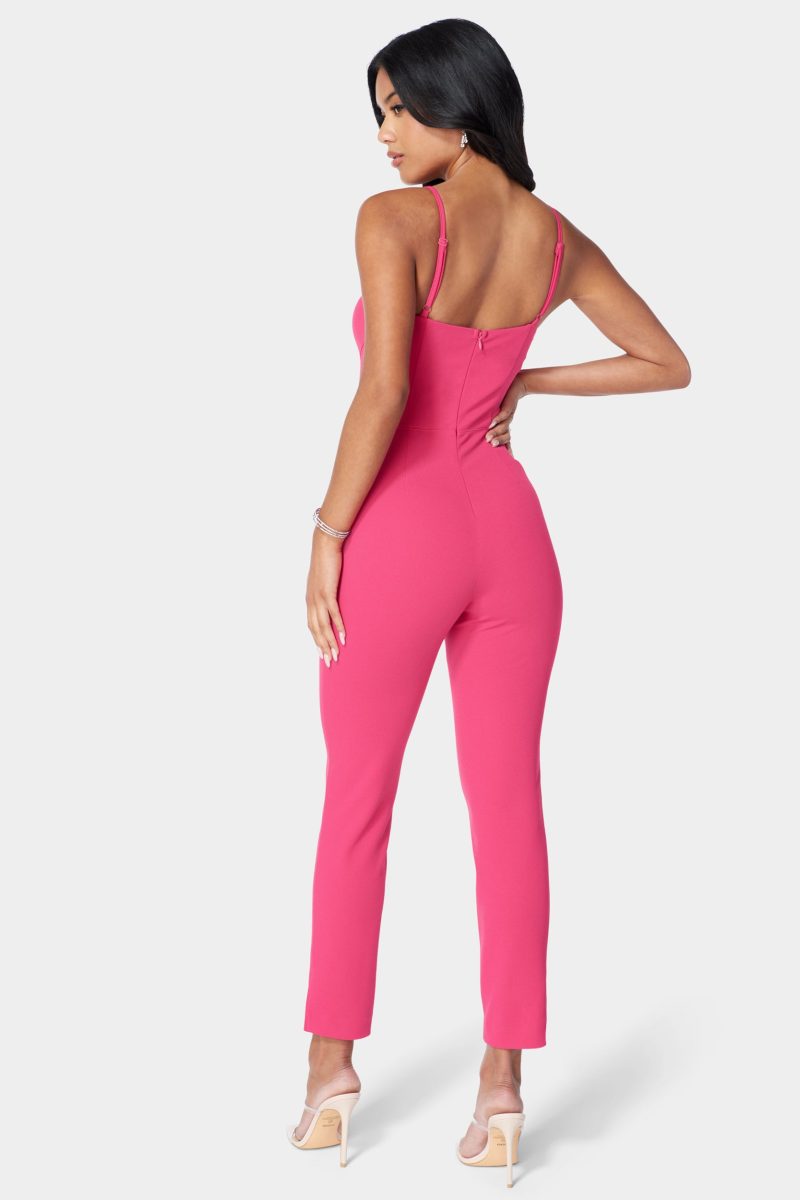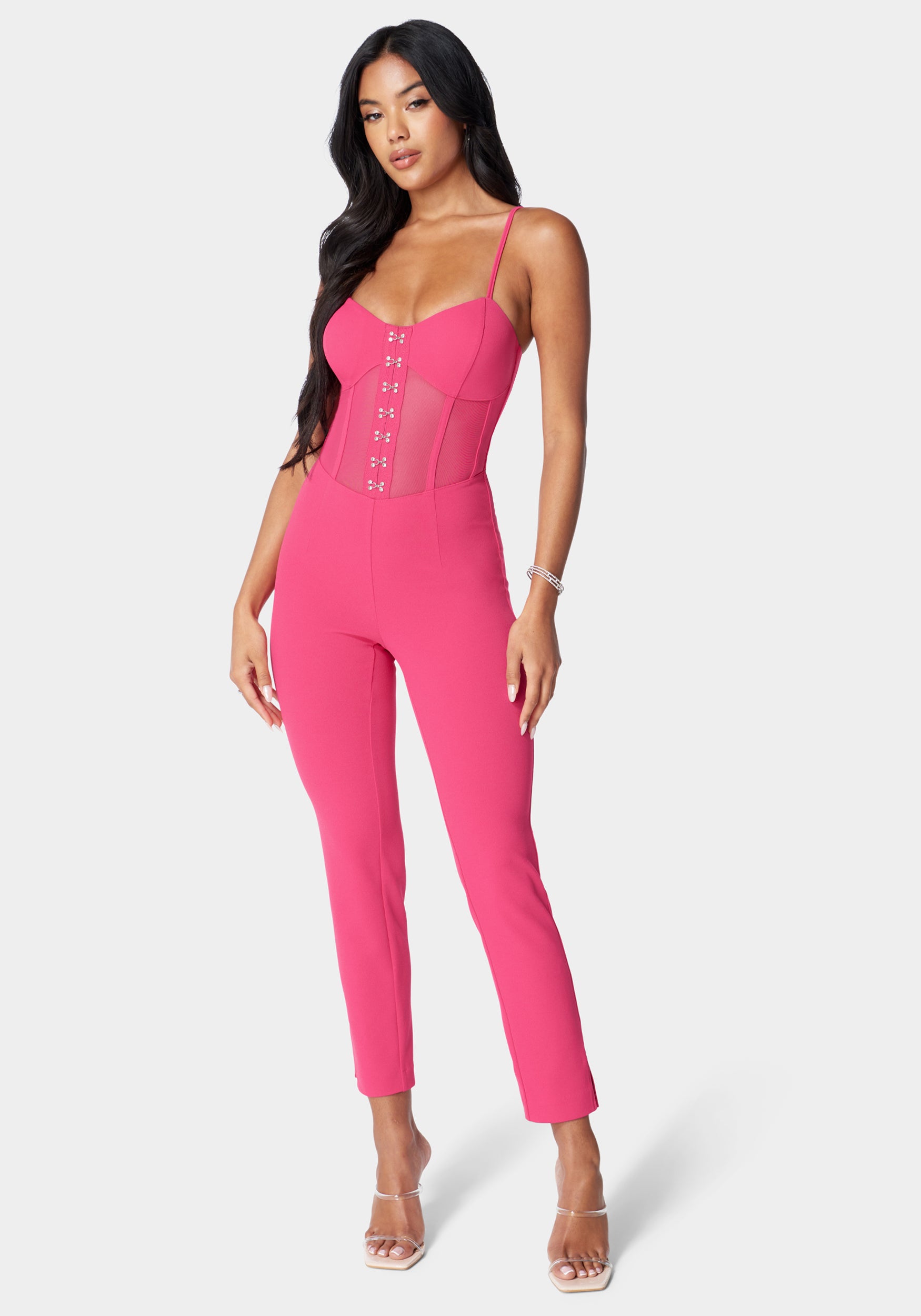A jumpsuit like no other. this all-in-one fit features a sultry corset waist and slim leg fit that creates a curve-hugging silhouette. Pair with your favorite bebe heels for a sexy date night look.