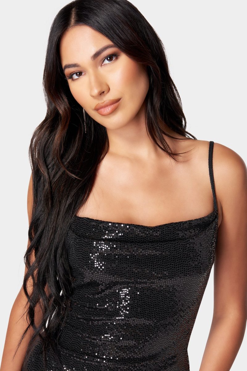 Shine at any party in this dazzling sequin dress. Featuring a cowl neckline. it’s ideal for nightlife events or glam gatherings where you want to make a statement.