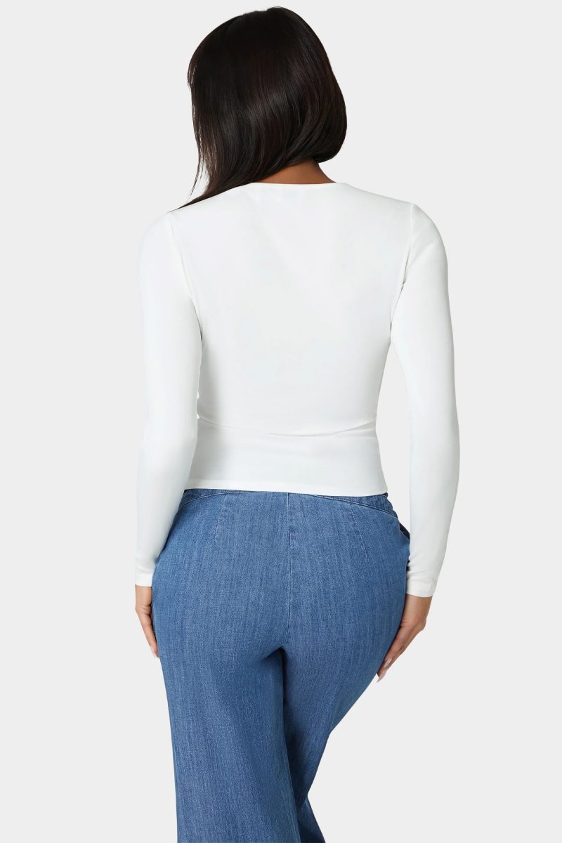 Add a touch of elegance to your look. A figure-hugging top features a distinctive cut-out detail and charming flower embellishment.