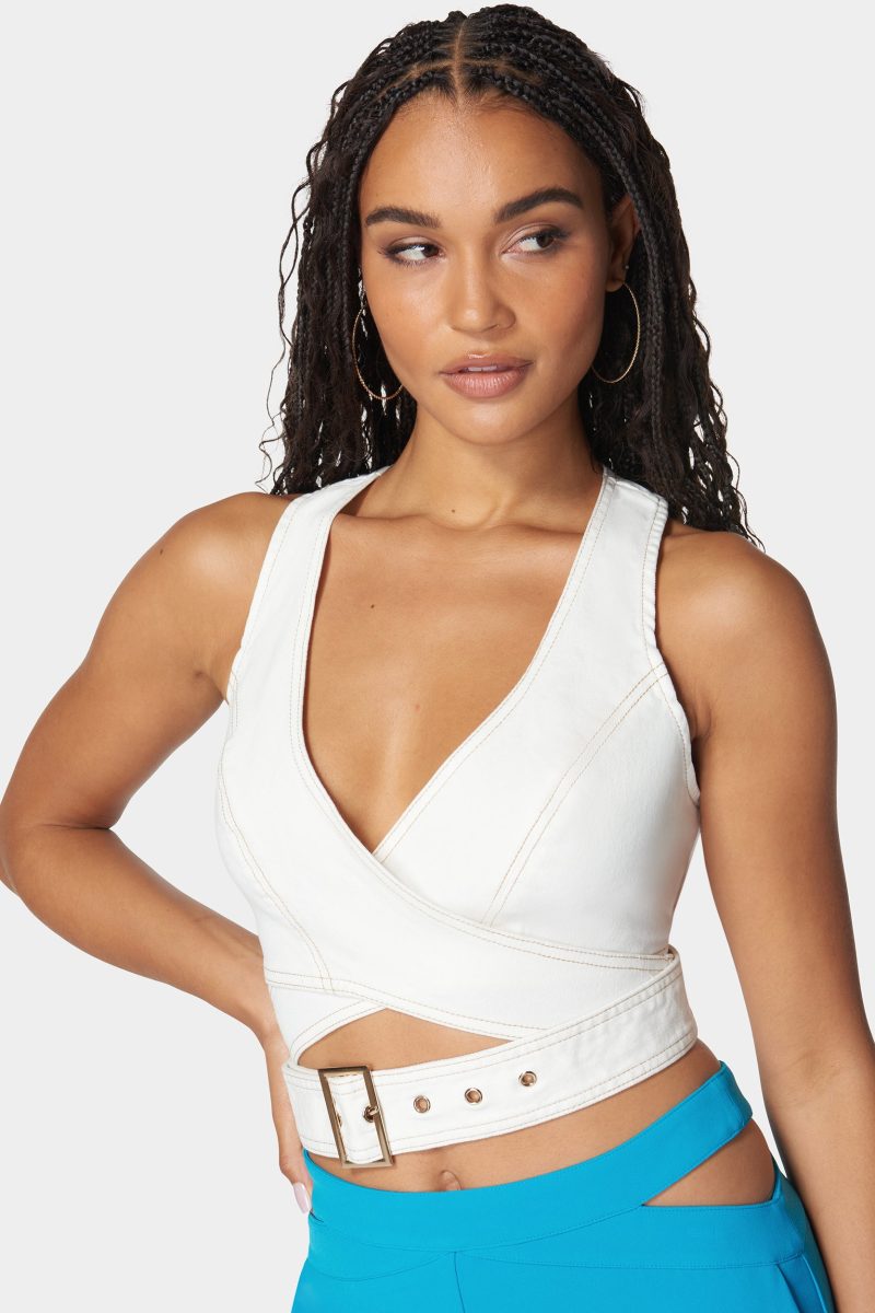 Featuring a flattering wrap design. this top cinches at the waist for a custom fit while offering the relaxed. casual vibe of denim. It’s an ideal piece for creating versatile looks that transition effortlessly from day to night.