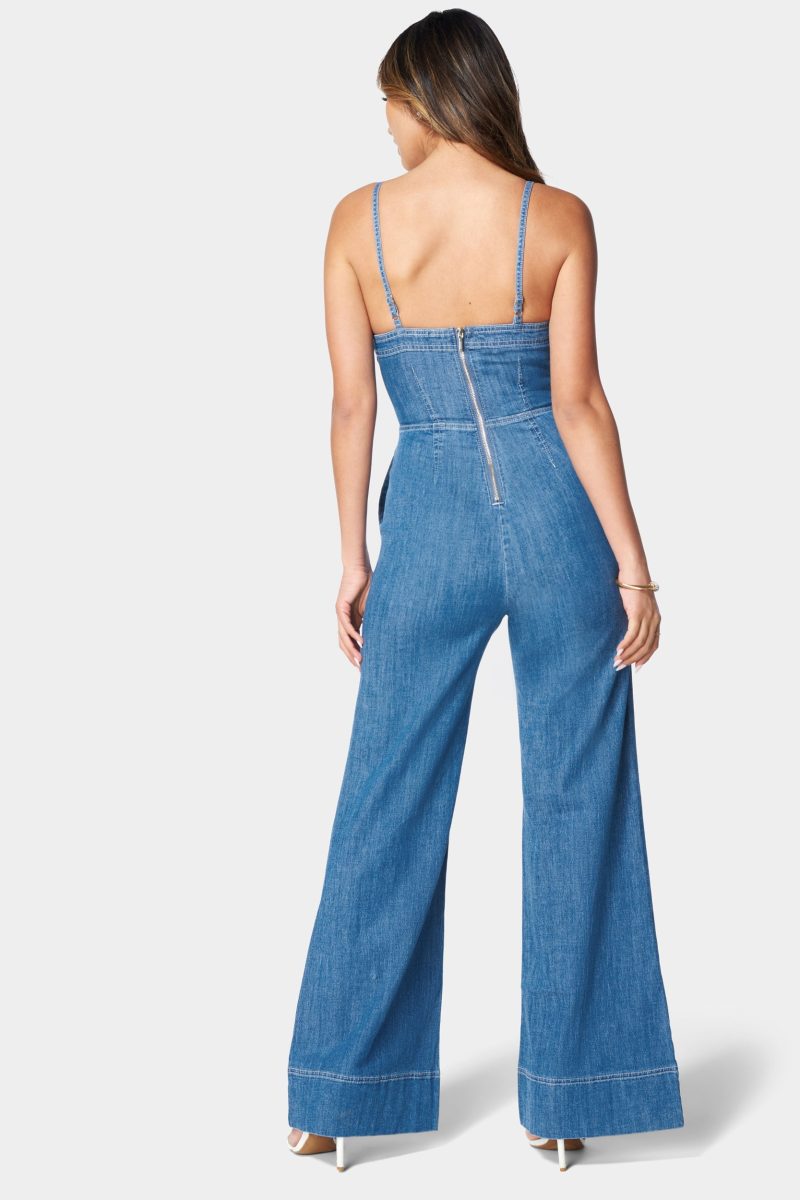 A denim jumpsuit is given a trendy twist with a double ruched front band. perfect for summer. The palazzo denim provides a boho-chic silhouette you’ll love.