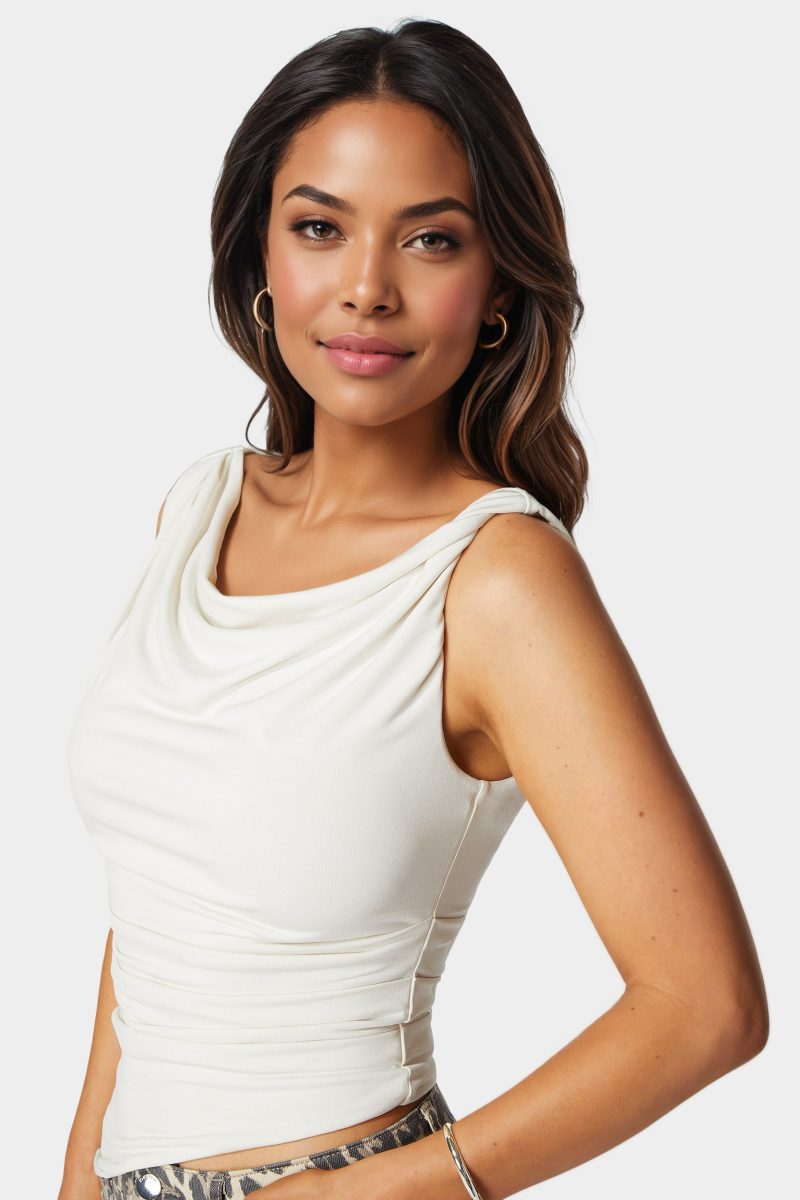 Accentuate your look with this eye-catching design. The flowing drape and asymmetric hem create a look that’s bold yet versatile for day or night.