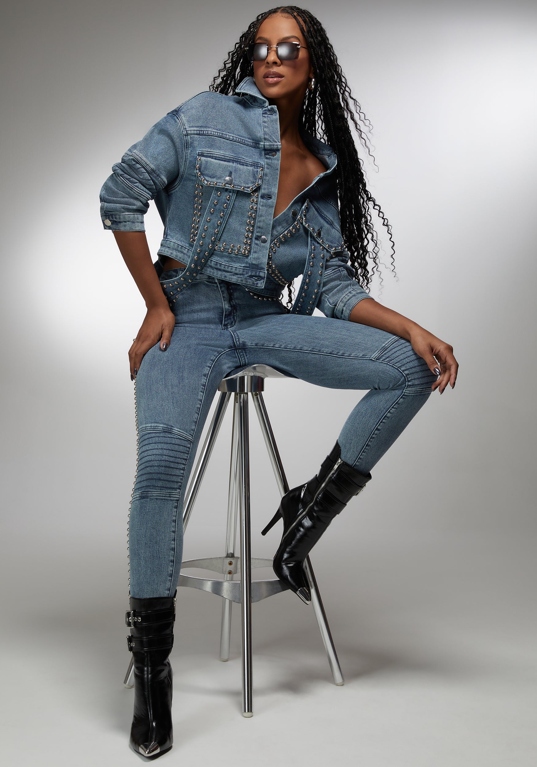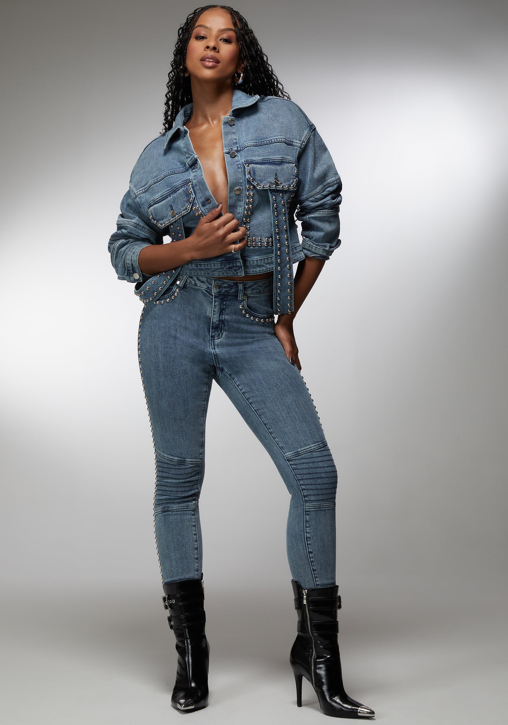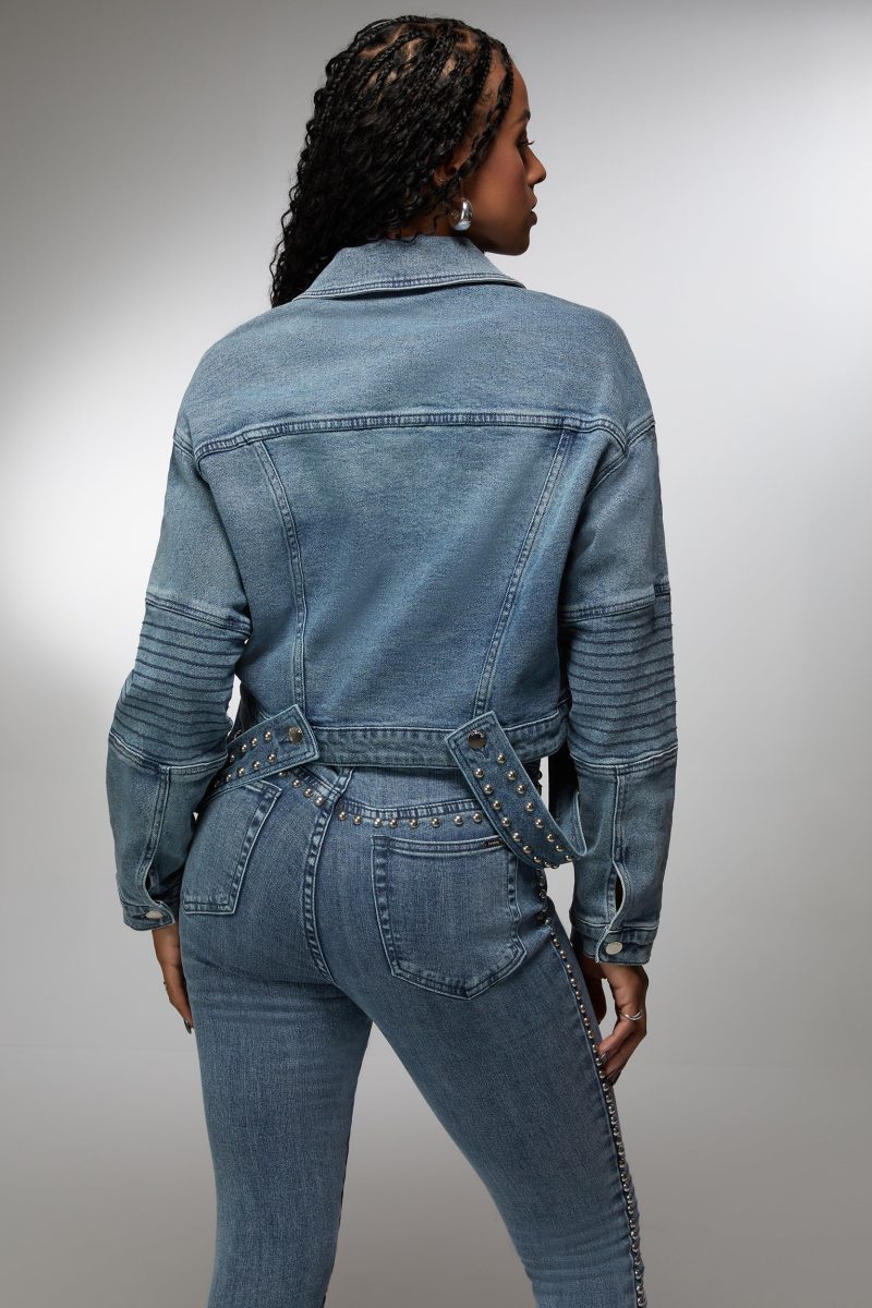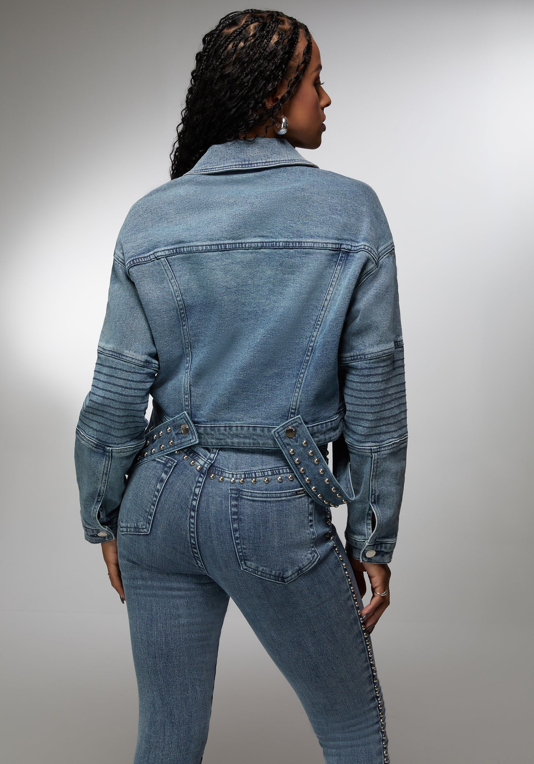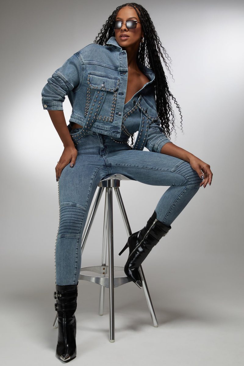 Make a bold impression with the bebe x Ciara drop shoulder studded denim jacket. This jacket redefines the classic denim look with its relaxed drop shoulders and an array of studs that add an instant pop of rock ‘n’ roll glam. It’s an iconic piece designed for those who love to stand out from the crowd.