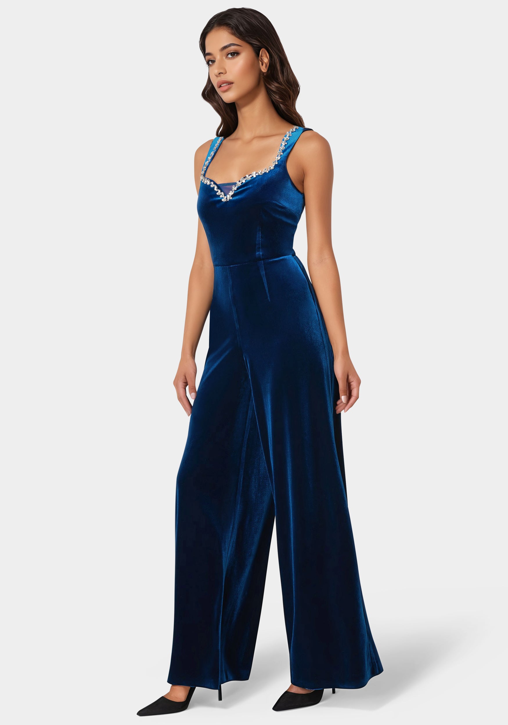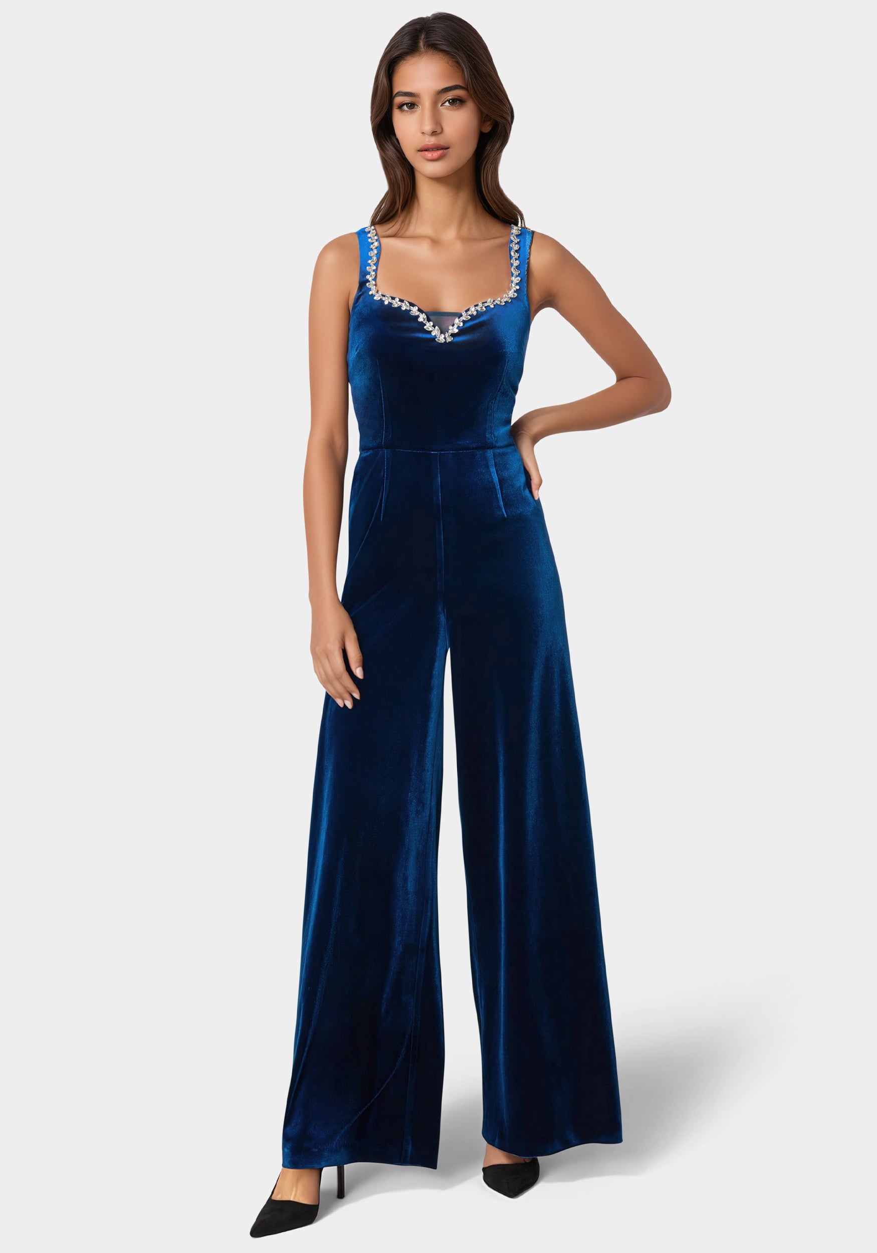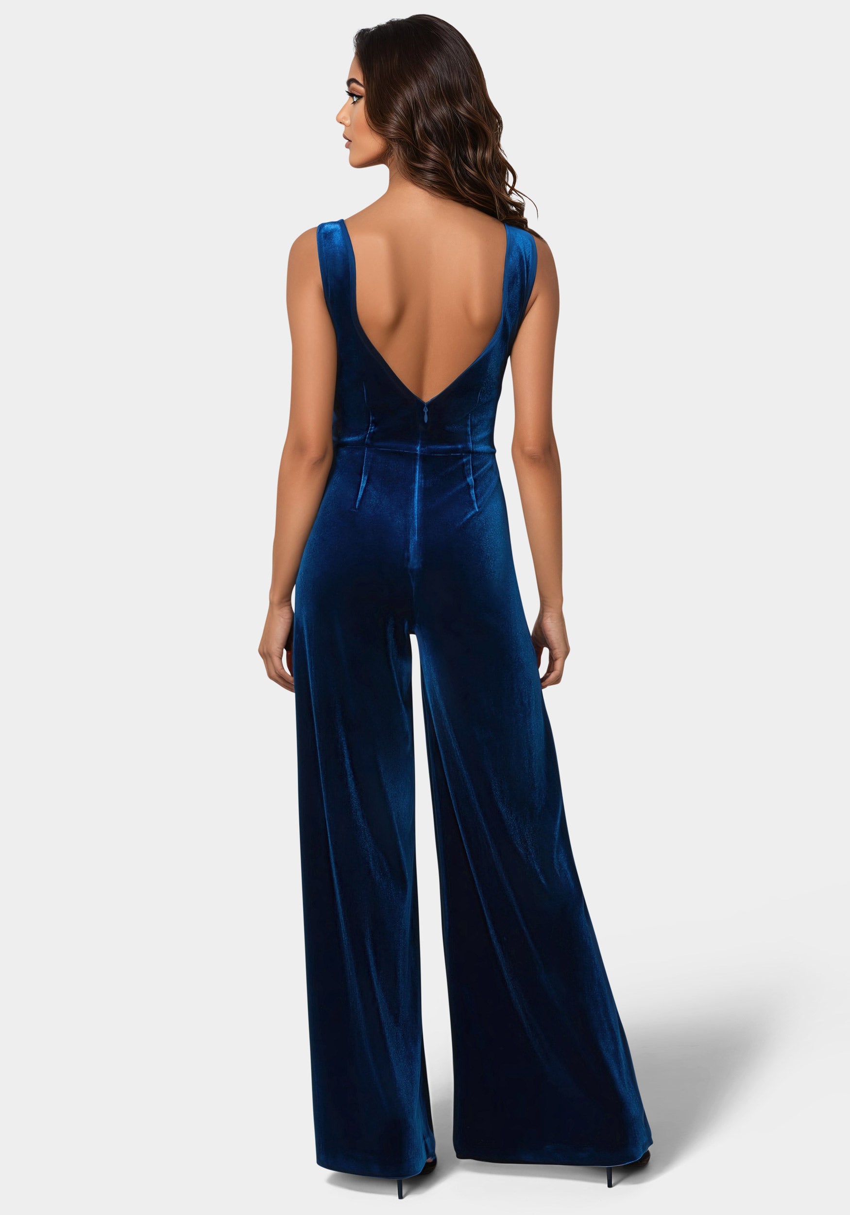 Elevate your ensemble with this luxurious velour bebe jumpsuit. Its sleek jewel neckline and dramatic wide-leg pants make it your go-to for an effortlessly elegant look.