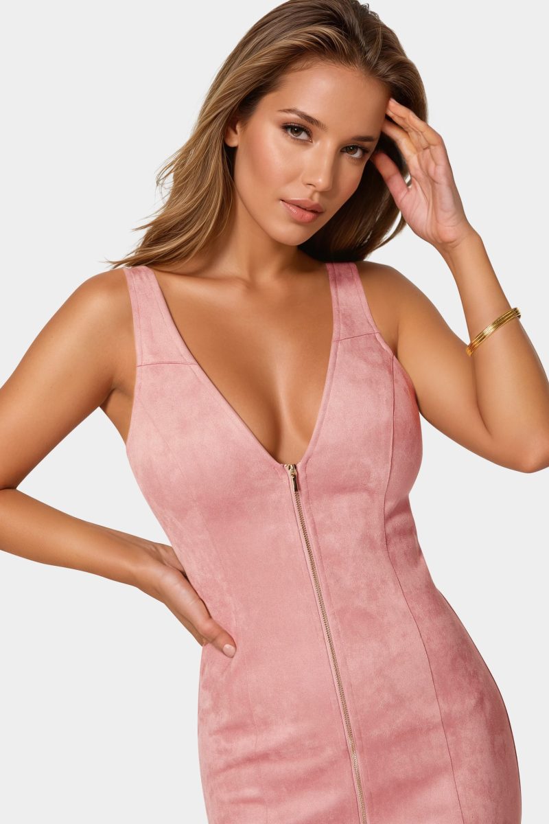 Look effortlessly stylish in this faux suede knee-length pencil dress with zip front. suitable for work or casual outings.