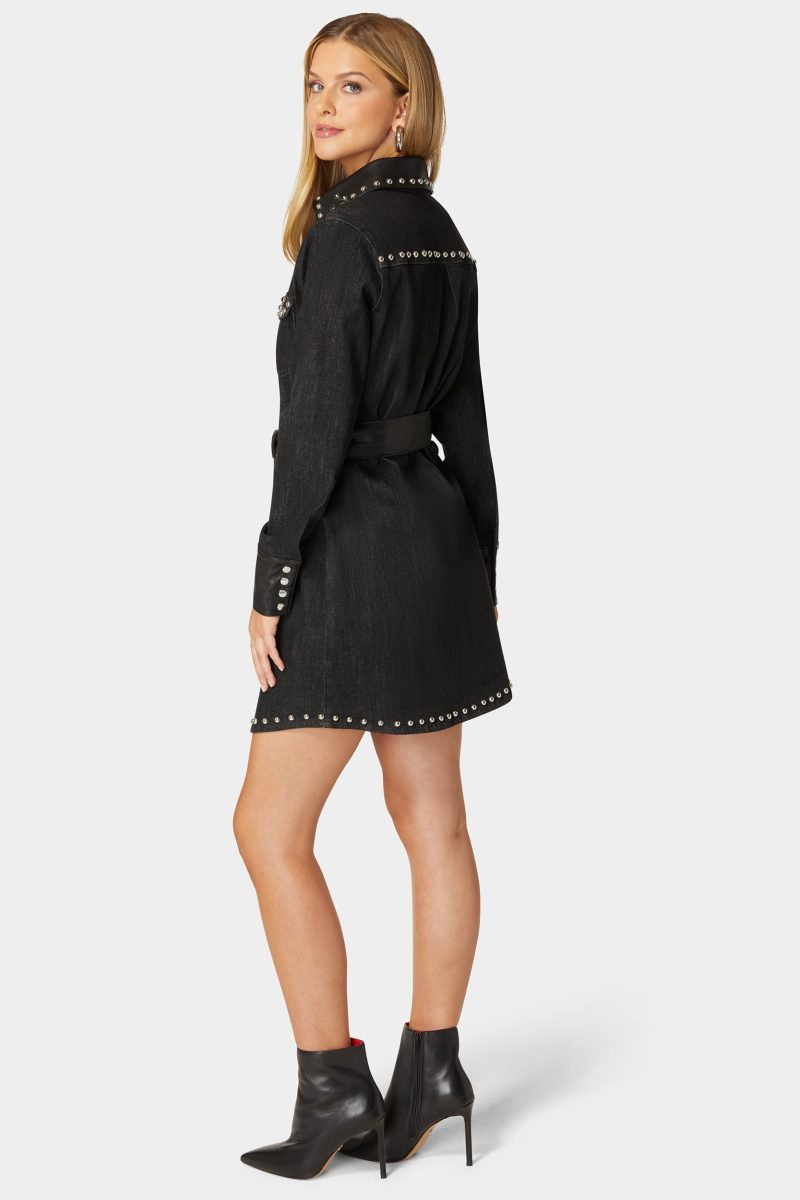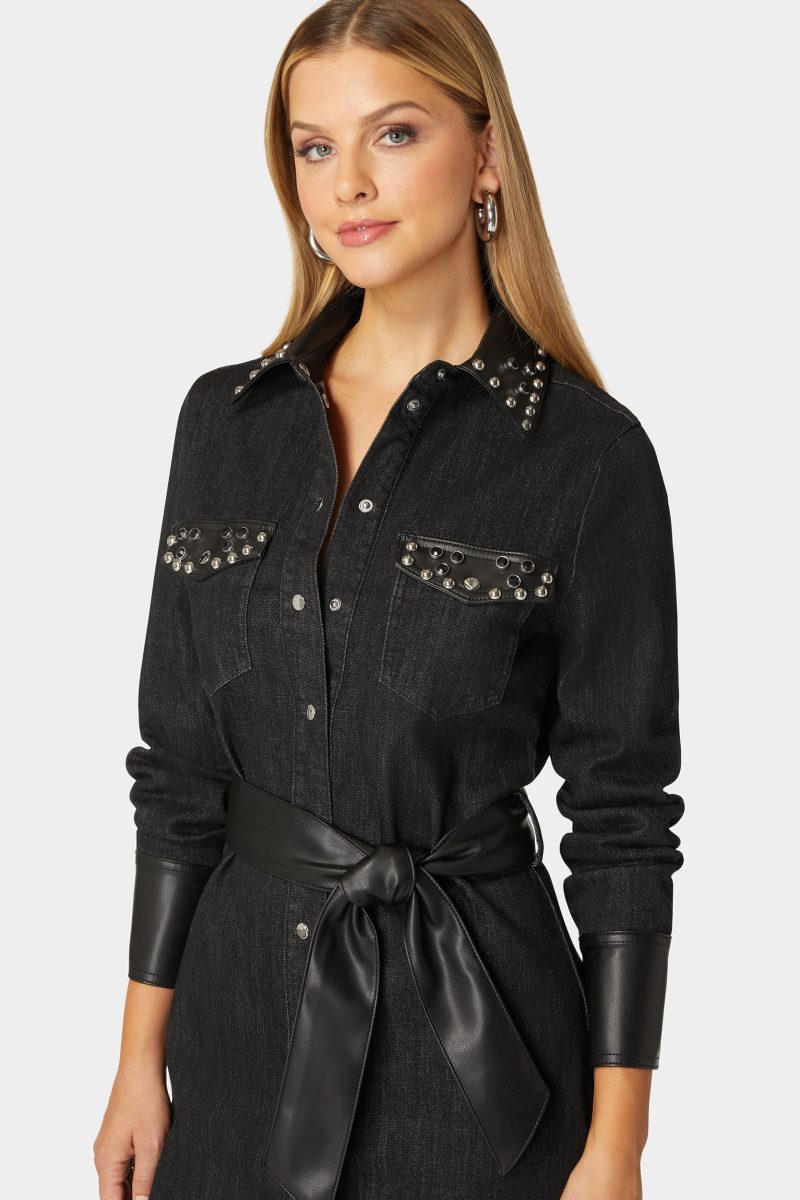 Command attention in this fitted shirt dress that marries studded detailing with vegan leather and denim. A versatile piece for taking center stage at casual-chic gatherings or modern art unveilings.