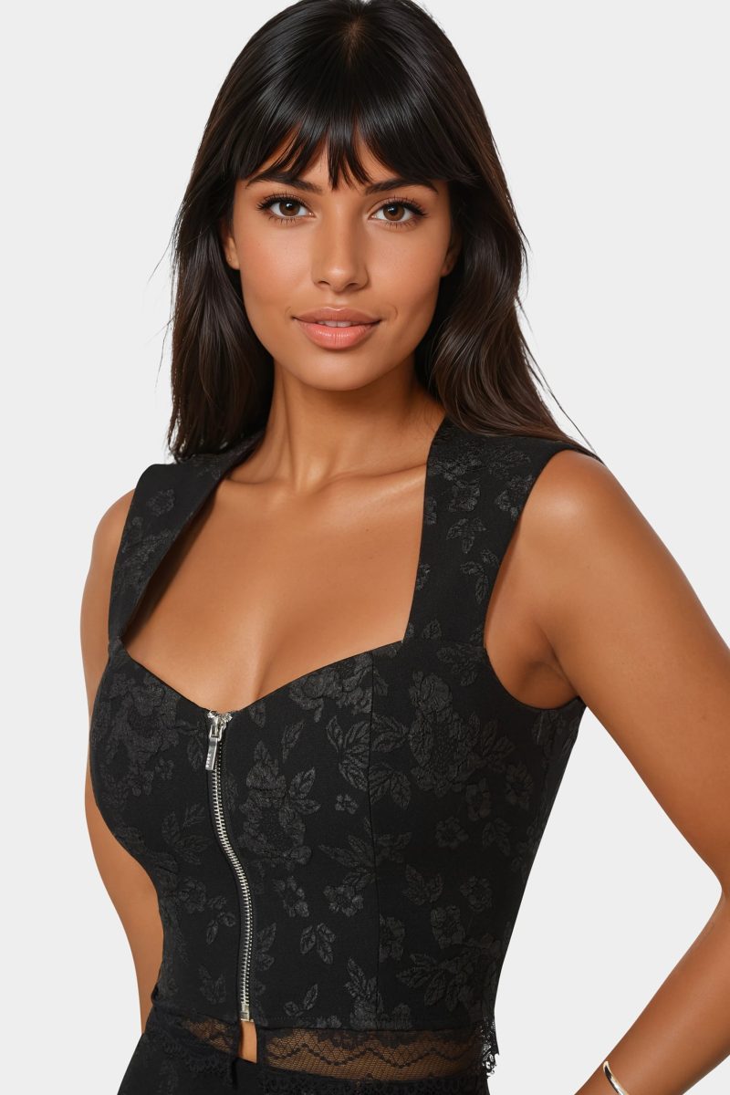 Sleeveless with silver hardware and lace details. this fitted top brings structure for upscale cocktail hours or romantic outings.