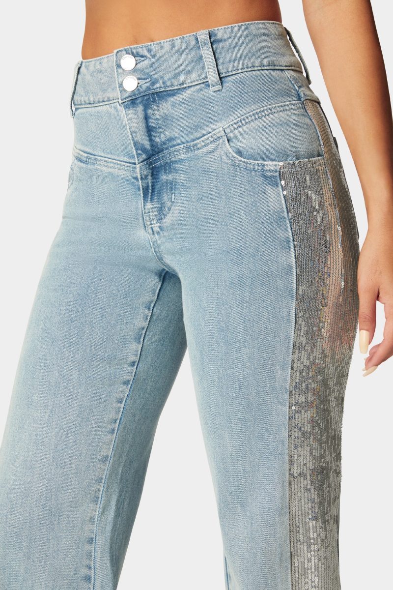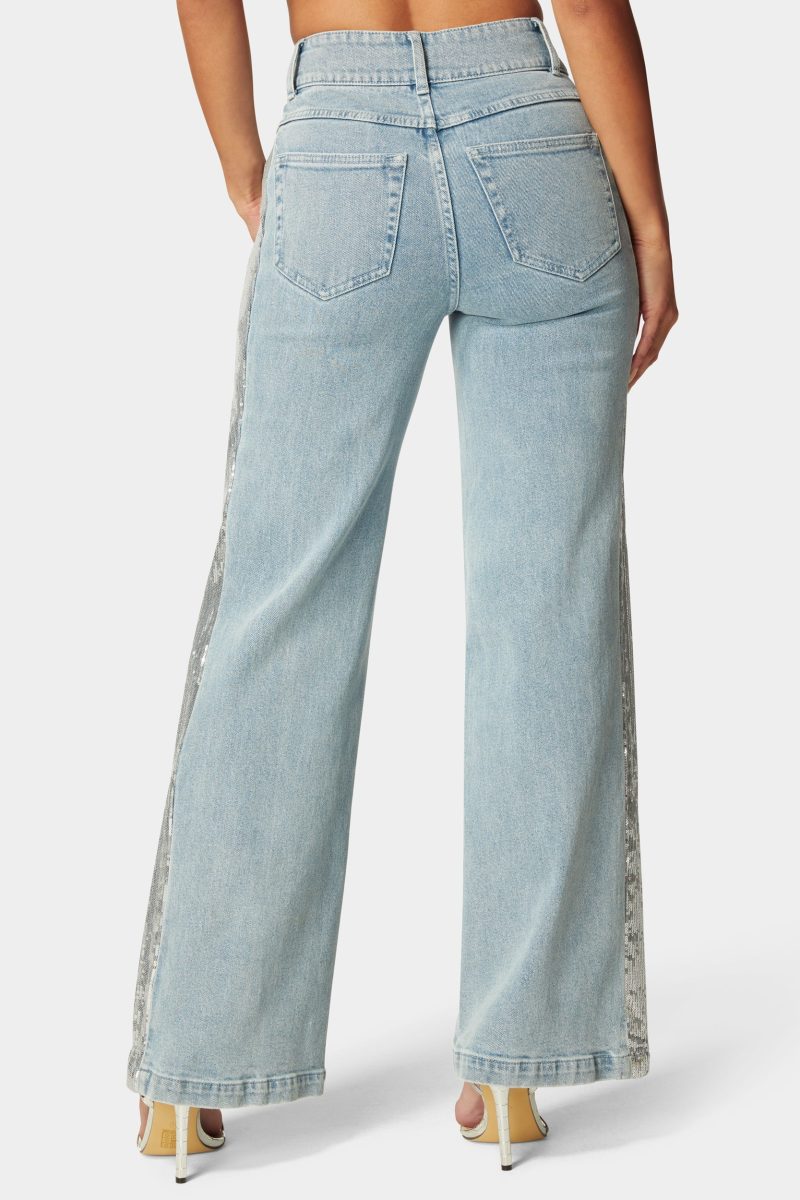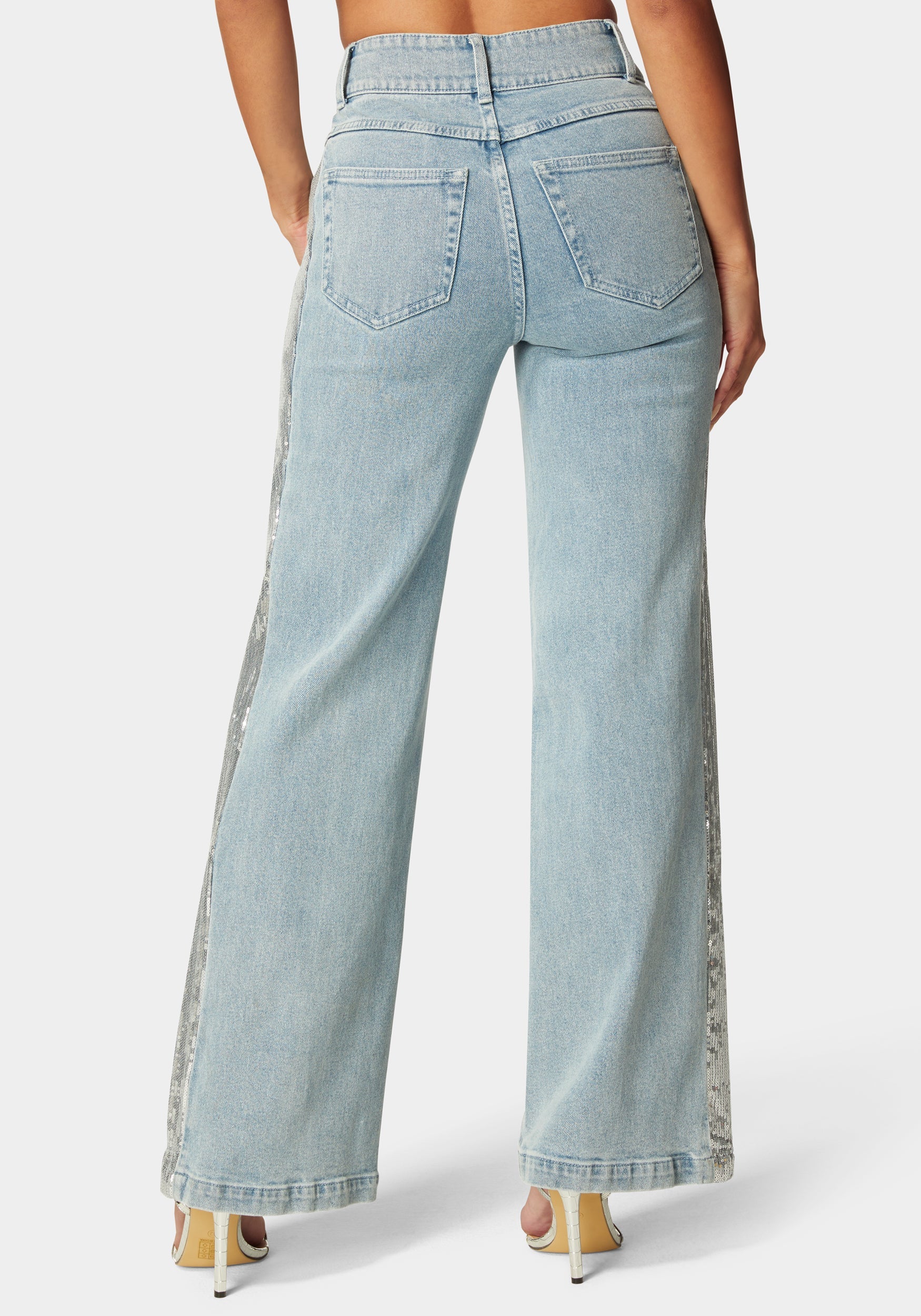 Elevate your denim game with these high-waist sequin wide-leg jeans. They offer a glamorous twist on a classic silhouette.