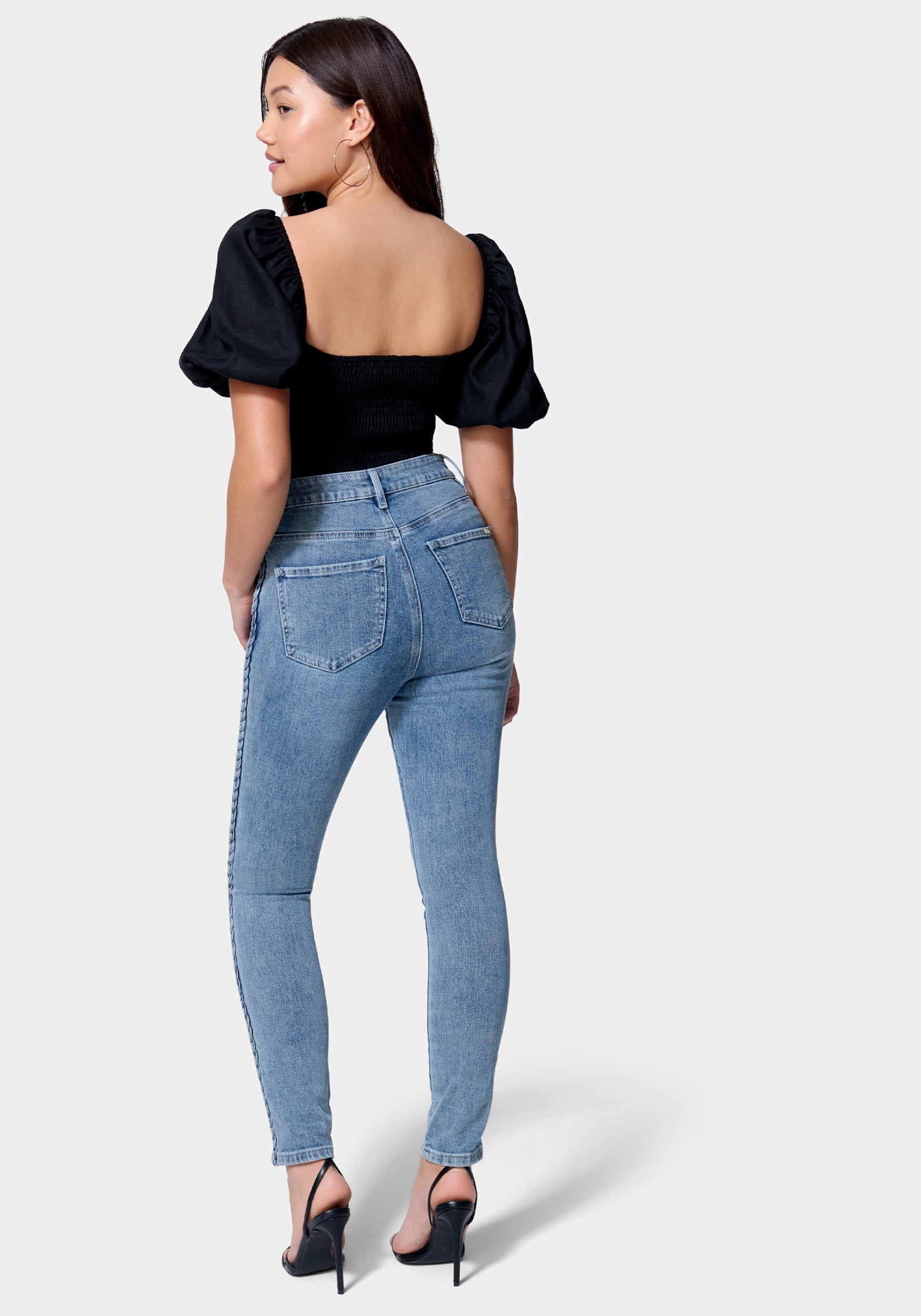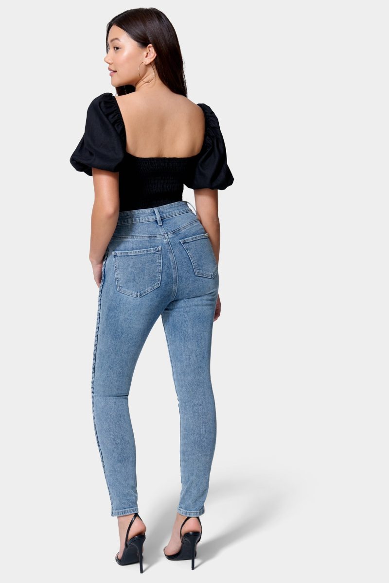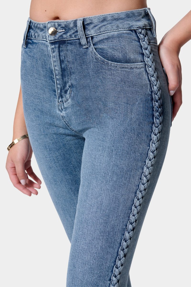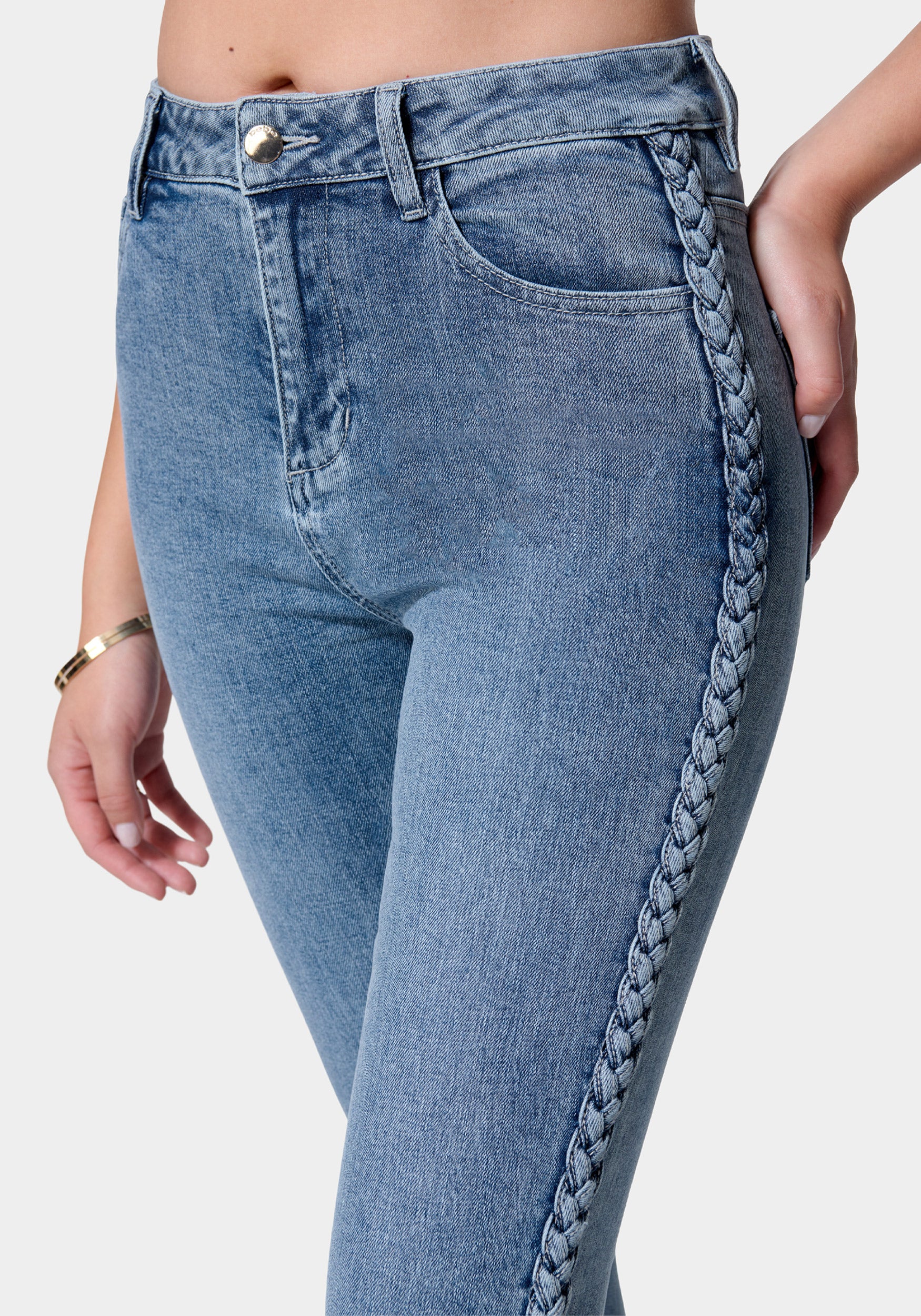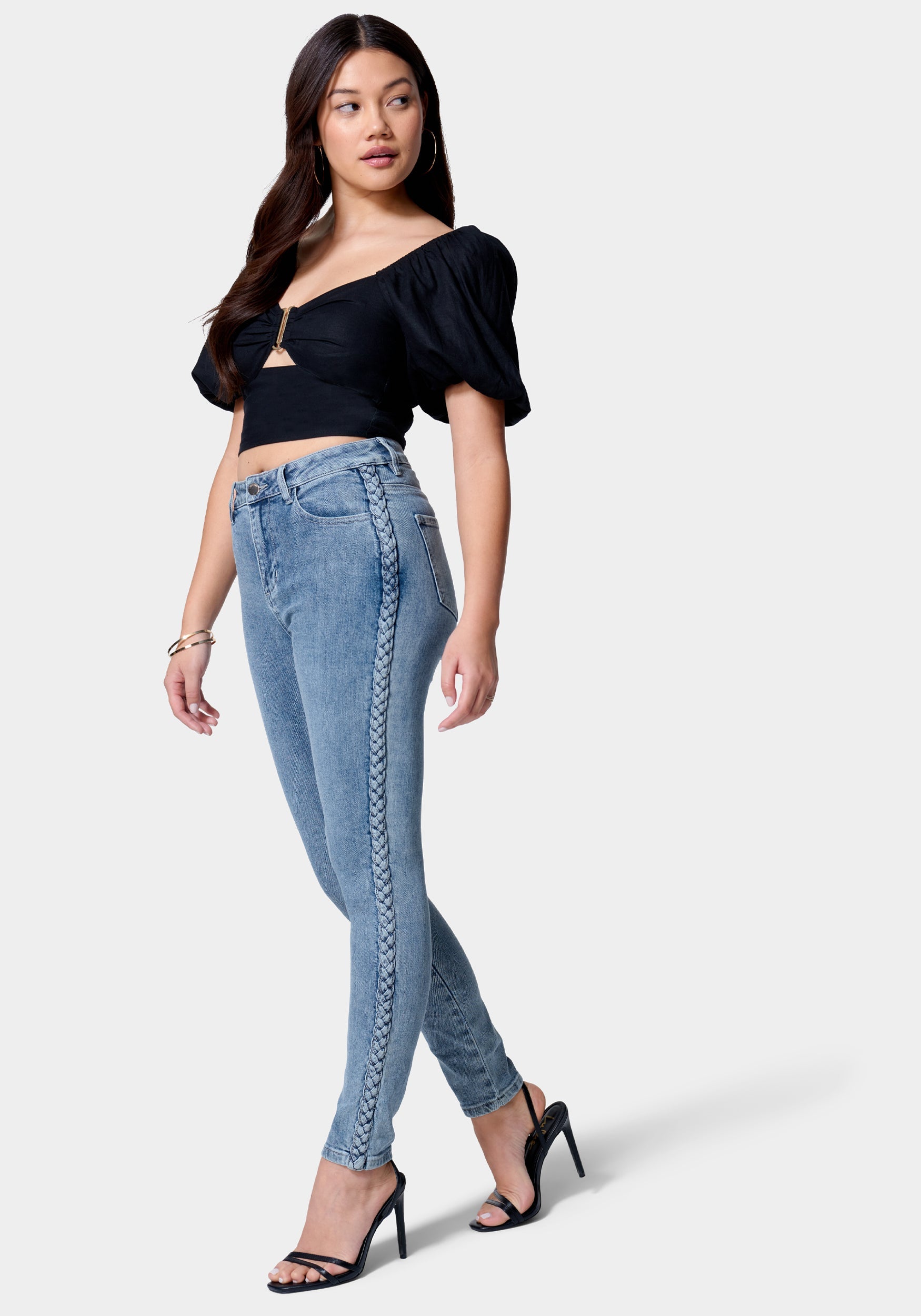 A modern take on skinnies. these on-trend jeans elevate your look with sleek braided side panels that run down the legs. Their high waist is comfortable and flattering. while the skinny leg is flattering to all figures.