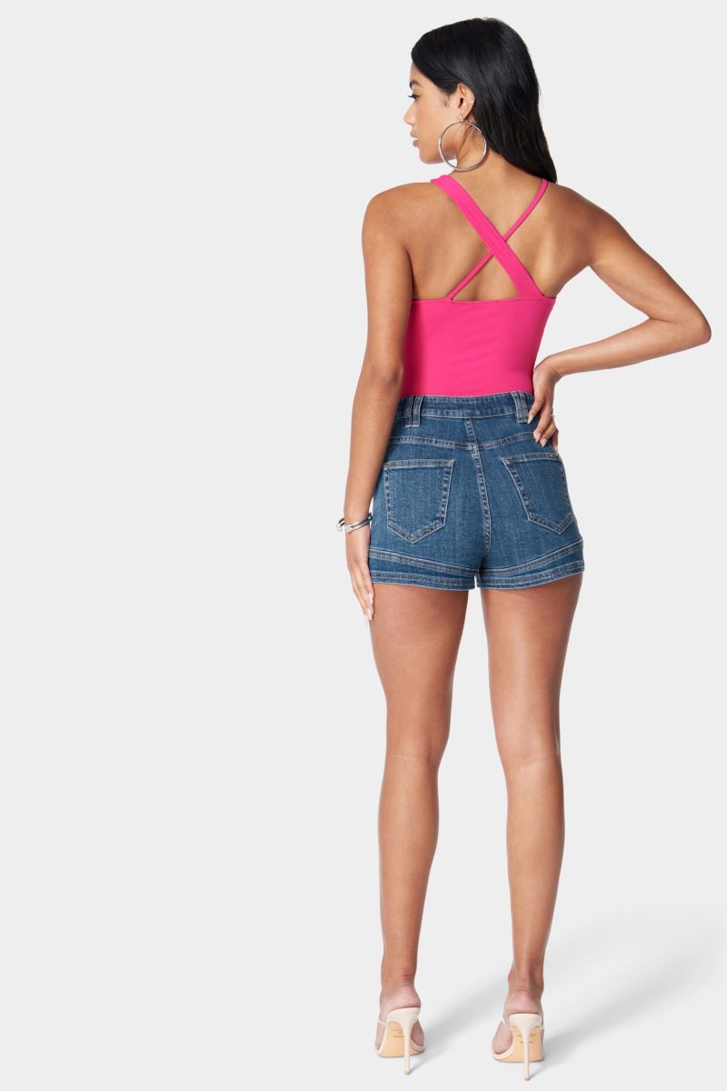 True blue denim short feature a curve-hugging fit that pairs perfectly with the bebe bodysuit of your choosing. A high waist meets a sophisticated stitch detail for the perfect pair of summer shorts.