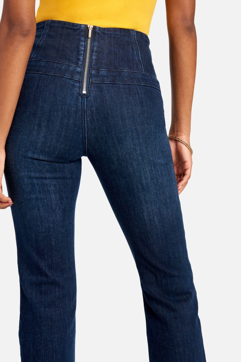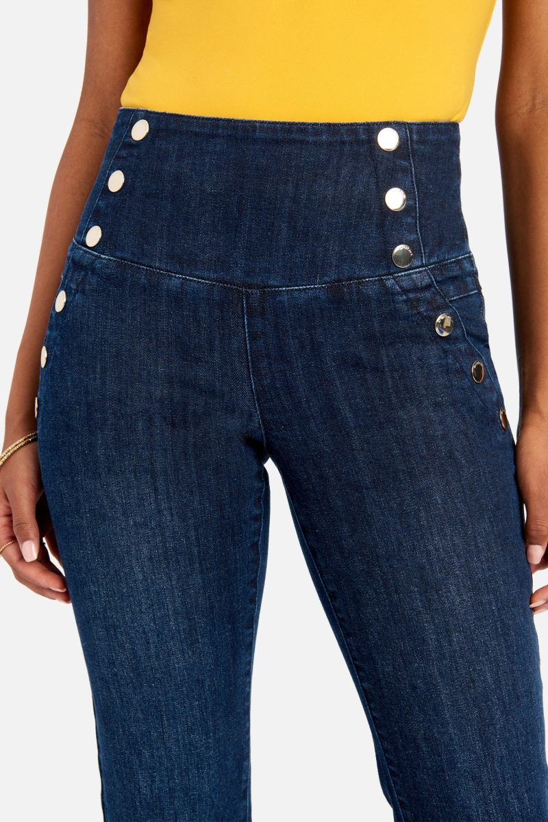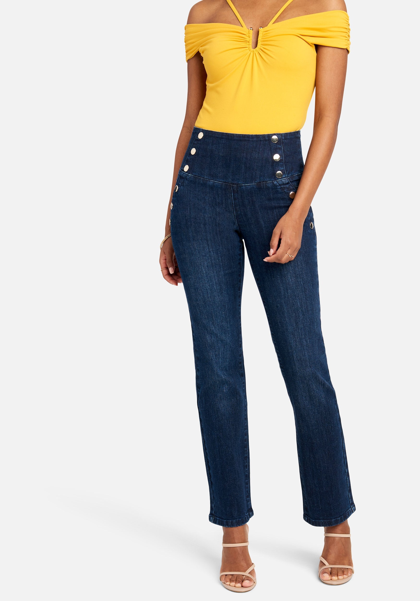 Meet your new favorite jeans. This high-waisted. straight-leg jean features button hardware at the sides. an exposed zipper detail in the back. and a form-fitting silhouette that flatters every curve. Pair with your favorite off-shoulder top for that spring-ready look.