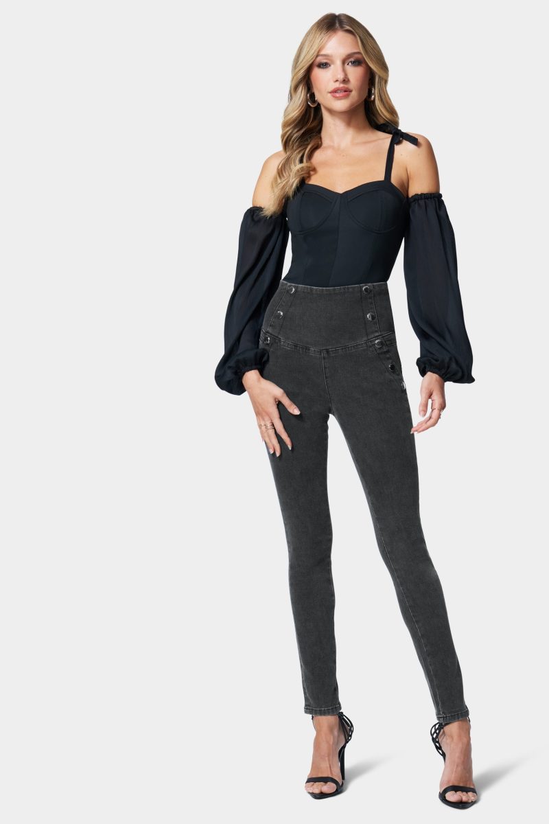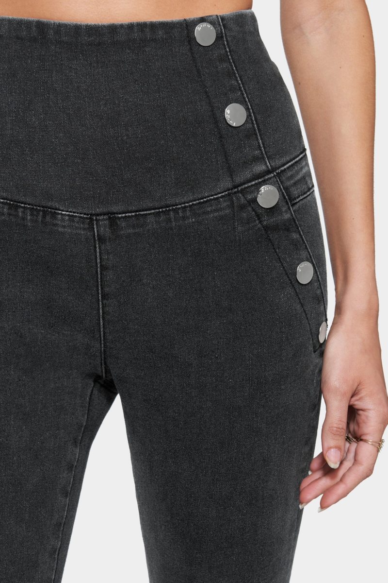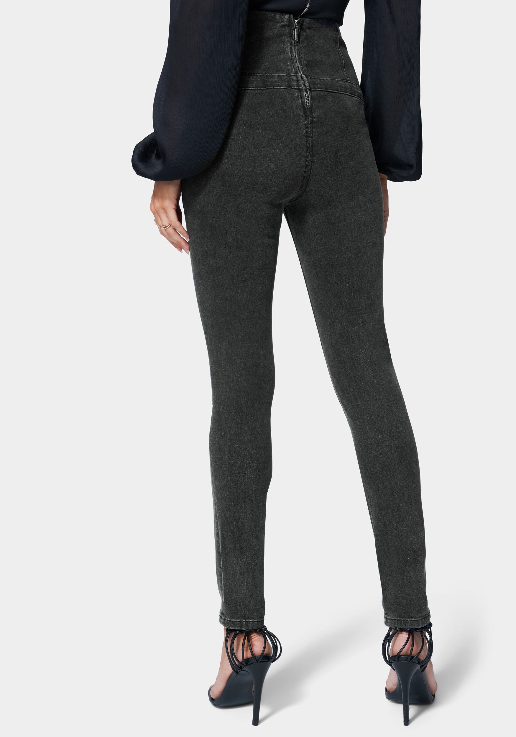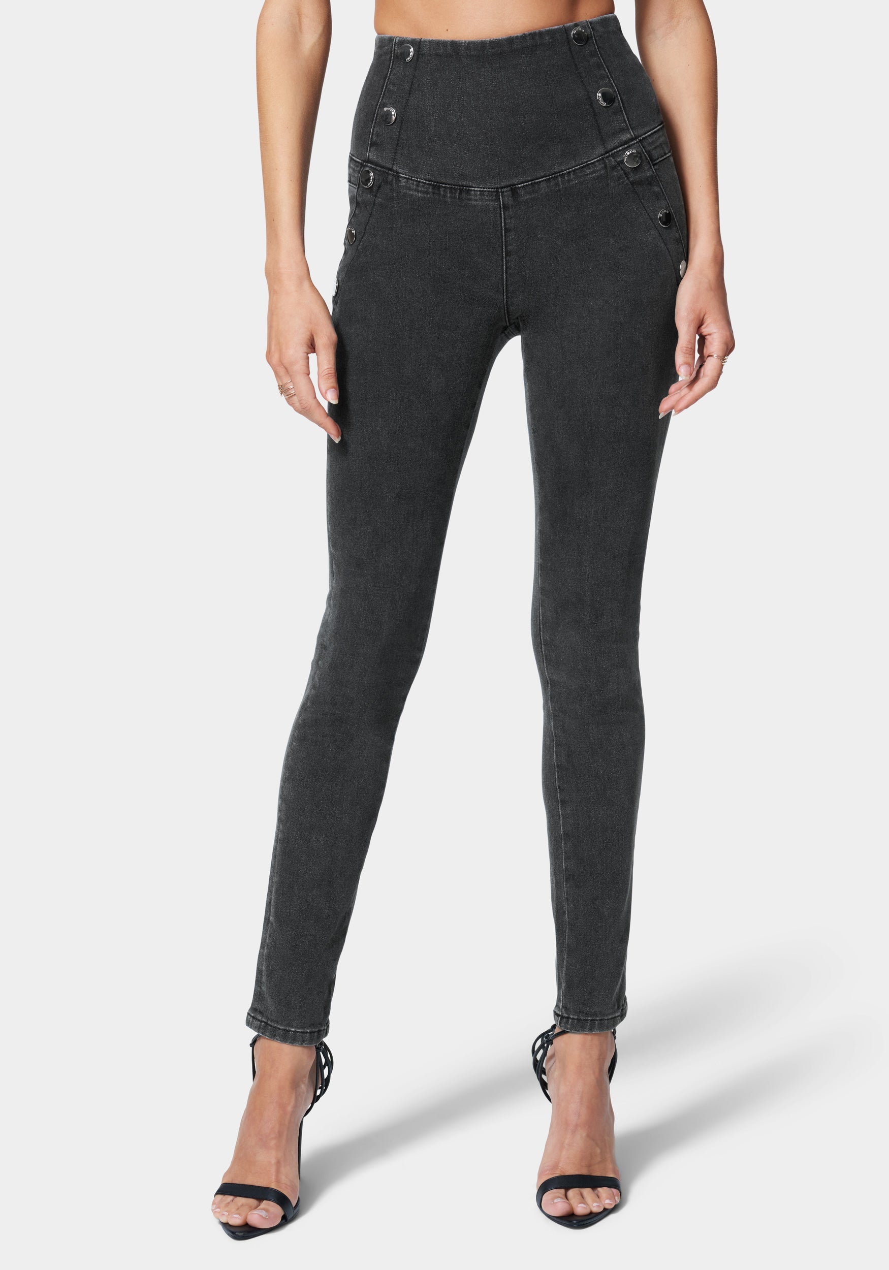 All buttoned up. Our comfort stretch knit skinny jean features button hardware. a curve-hugging fit. sky-high waist. back zip closure. and seam-stitched details.