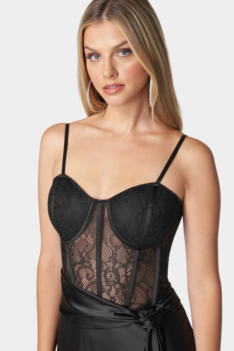 Our Lace And Satin Bustier Gown is a masterpiece of romance and sophistication. This gown features a stunning combination of delicate lace and smooth satin. creating a sensuous contrast that’s both visually appealing and delightful to the touch. The bustier top provides support and shape. while the flowing skirt adds a touch of drama to your movements. Perfect for those occasions when you want to leave a lasting impression.