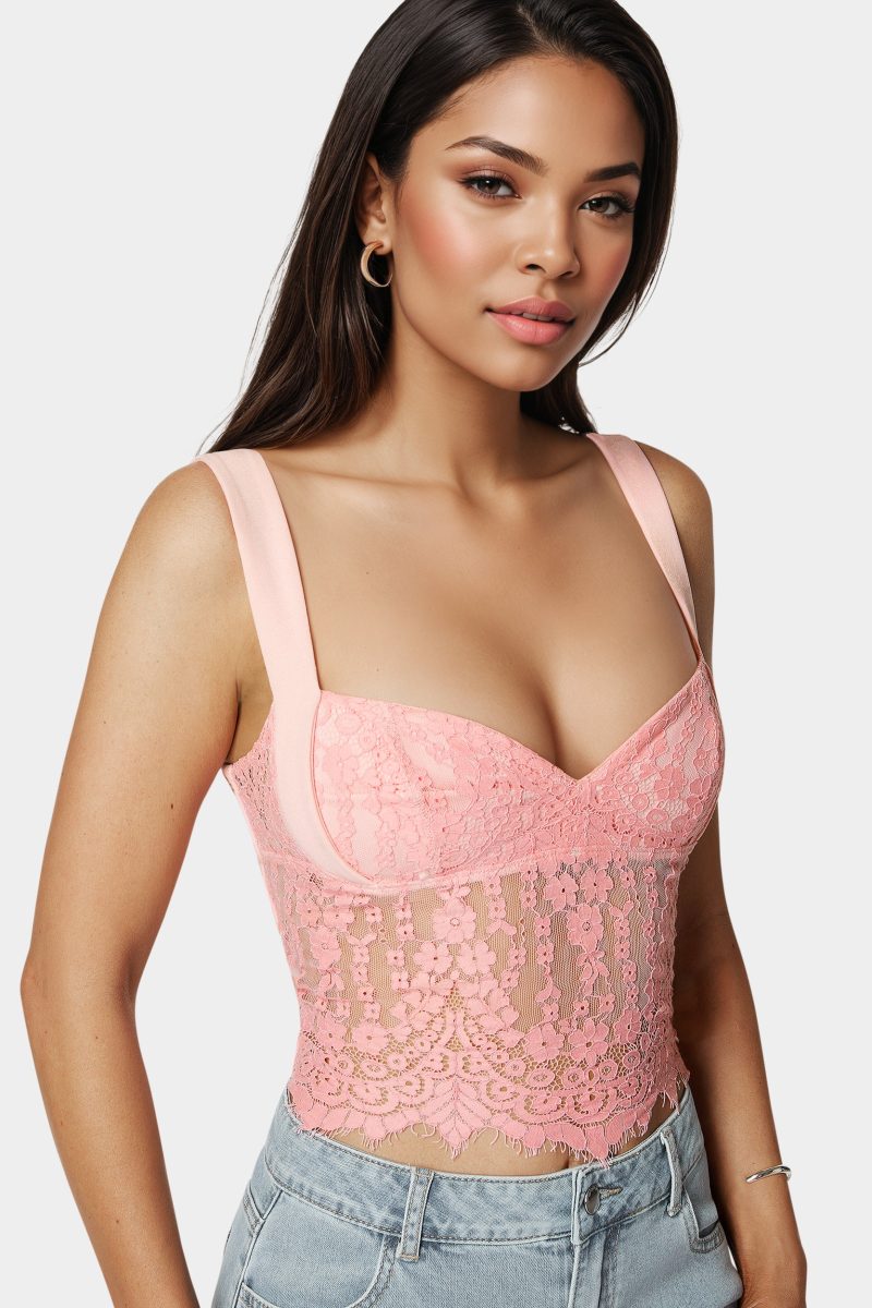 It’s the flirty piece your wardrobe’s been missing. Delicate lace and a sweetheart neckline create romantic edge. while scalloped details add an unexpected twist.