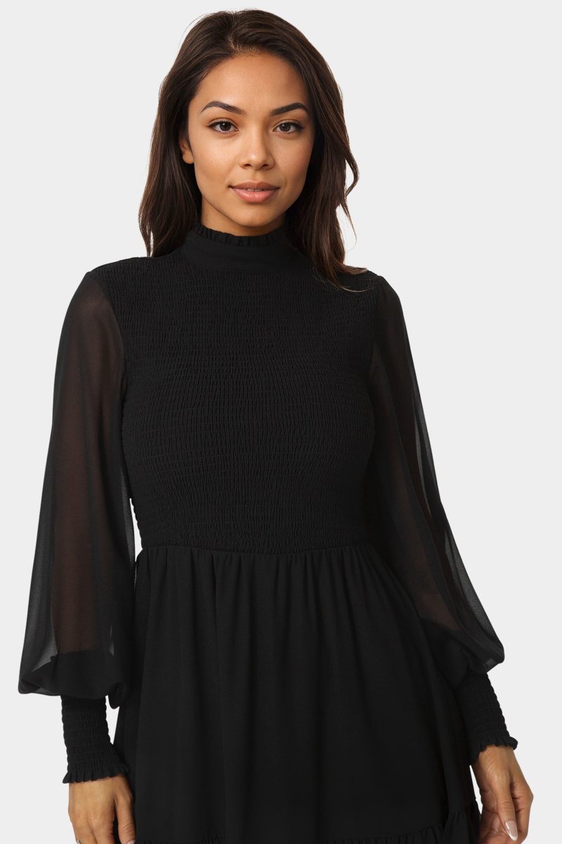 Balance comfort and style with this chiffon mini dress featuring a mock neck and smocked details. Ideal for daytime outings or polished work events. it’s breathable yet refined.