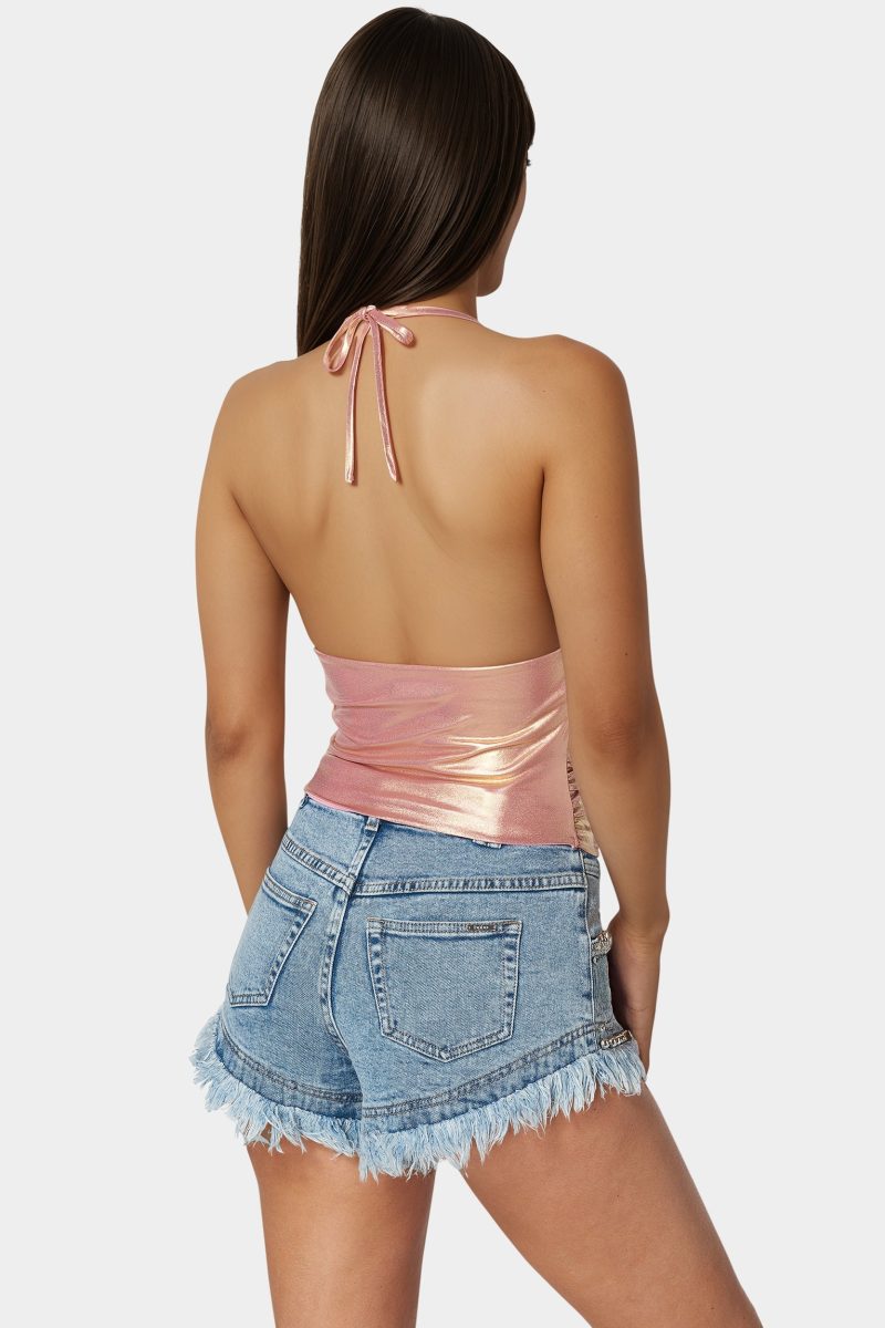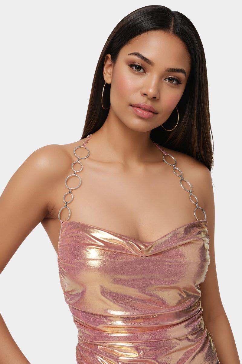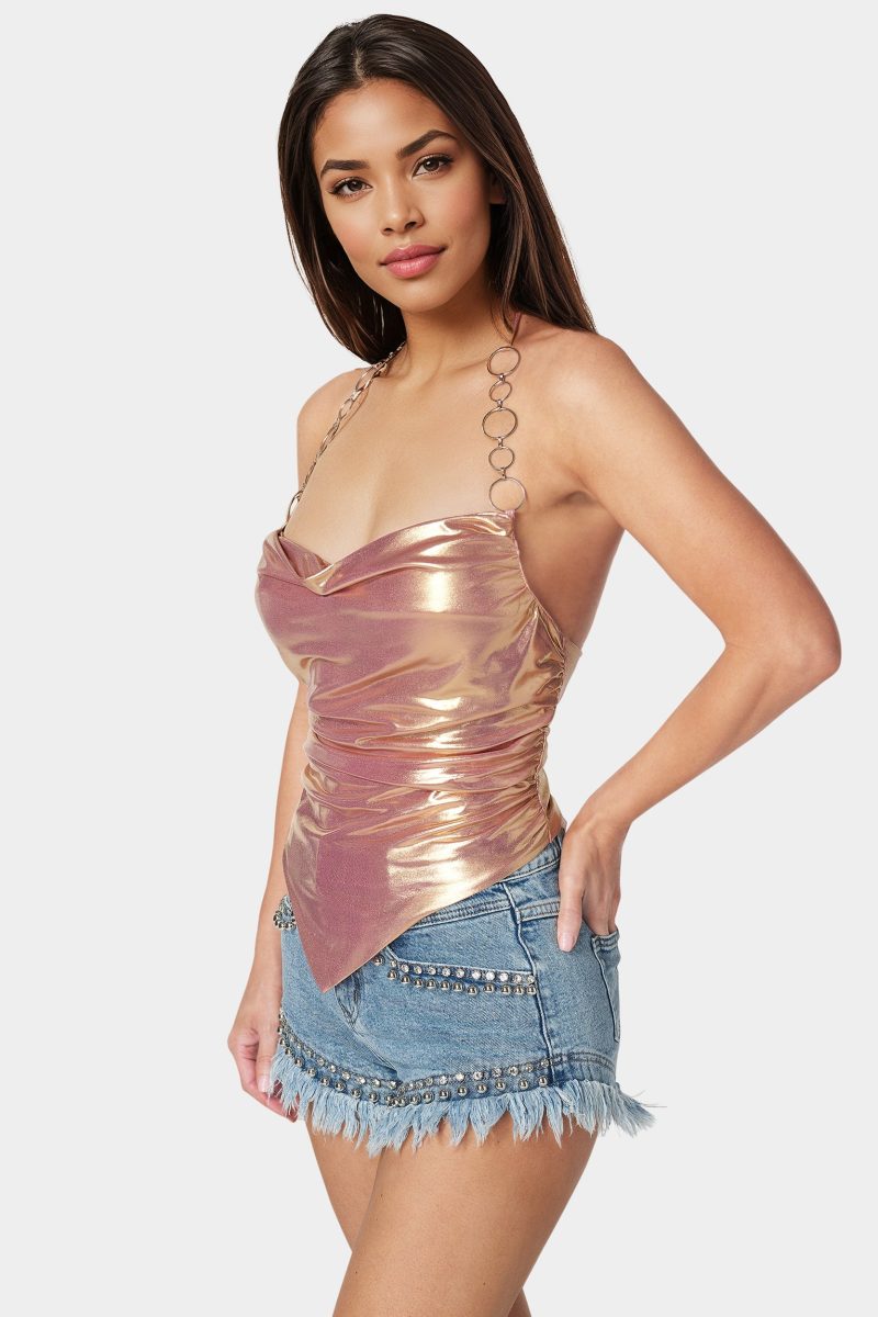 Stand out in a metallic handkerchief top. Designed to dazzle with a flowing silhouette and shimmering finish.