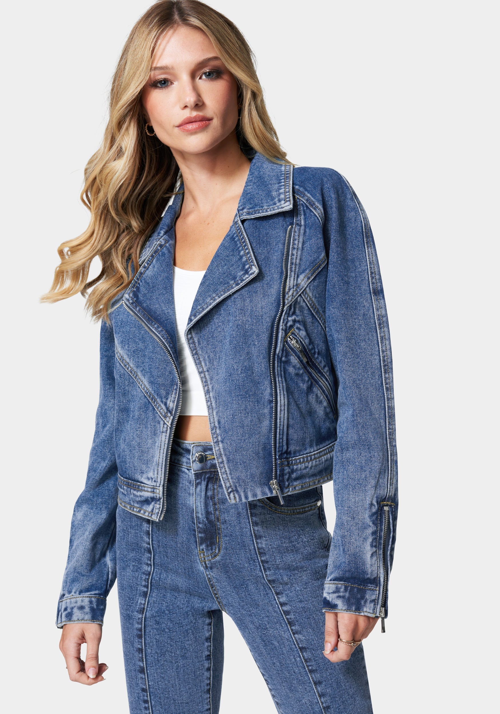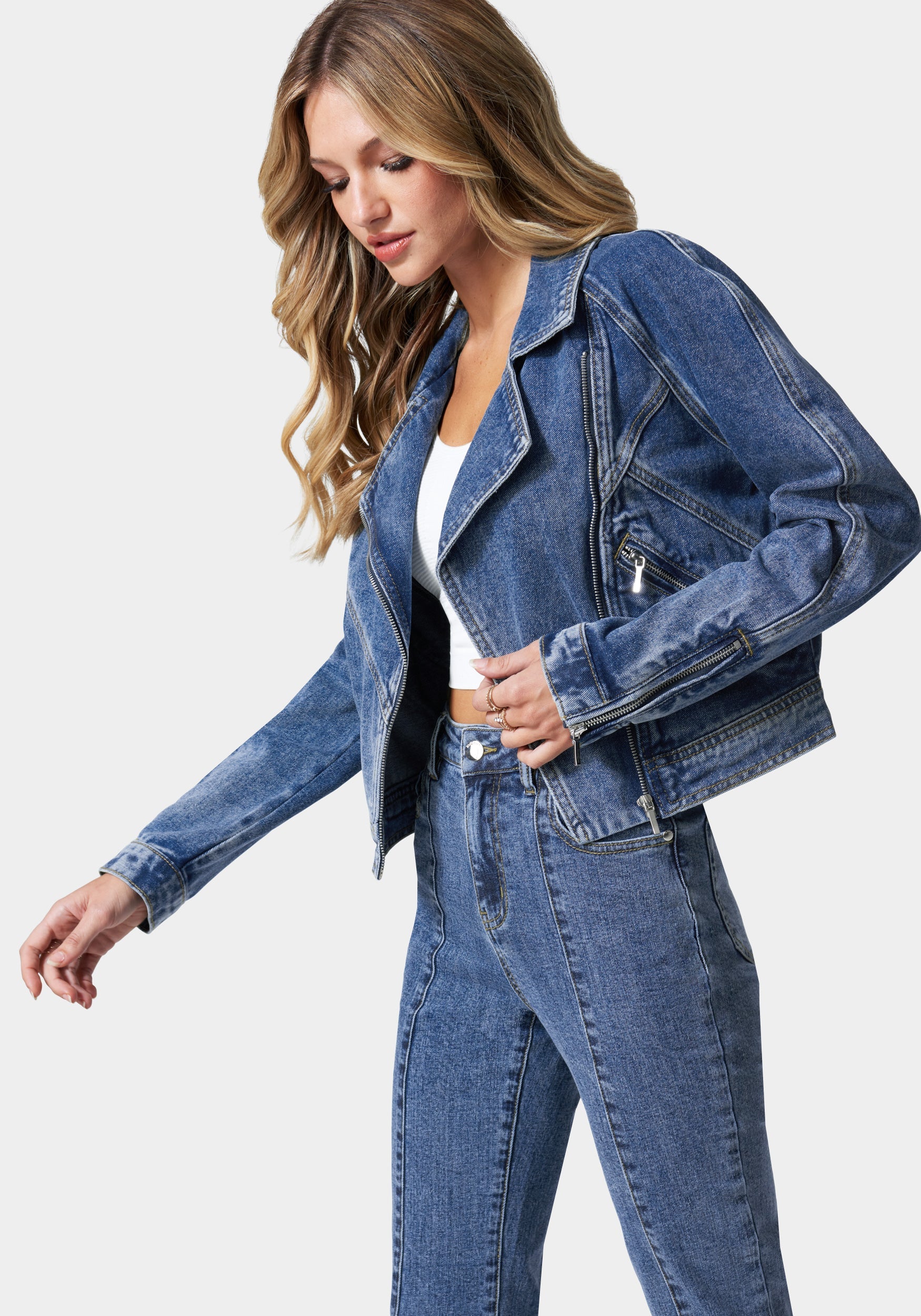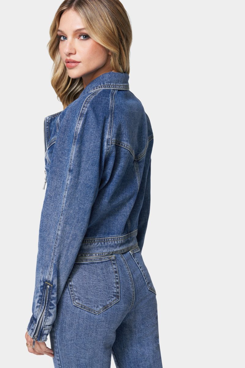Your perfect layering piece. Pair this Moto Denim Jacket over your favorite tops this fall and complete the look with jeans for the ultimate style. Made in vintage stretch denim featuring a moto look with zipper detail.