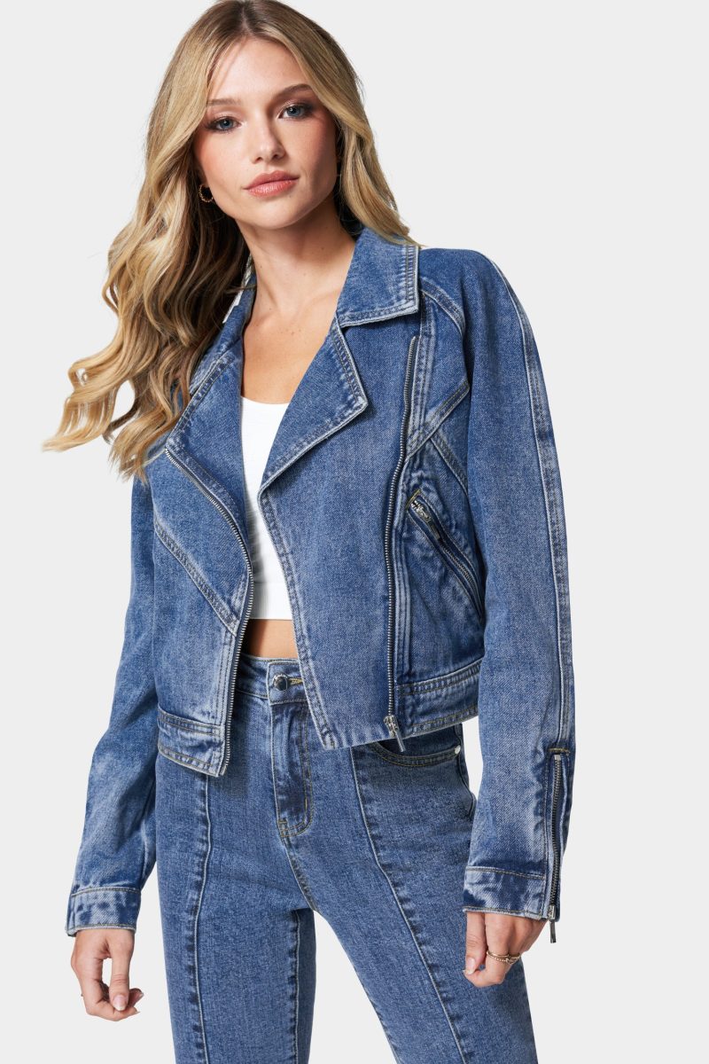 Your perfect layering piece. Pair this Moto Denim Jacket over your favorite tops this fall and complete the look with jeans for the ultimate style. Made in vintage stretch denim featuring a moto look with zipper detail.