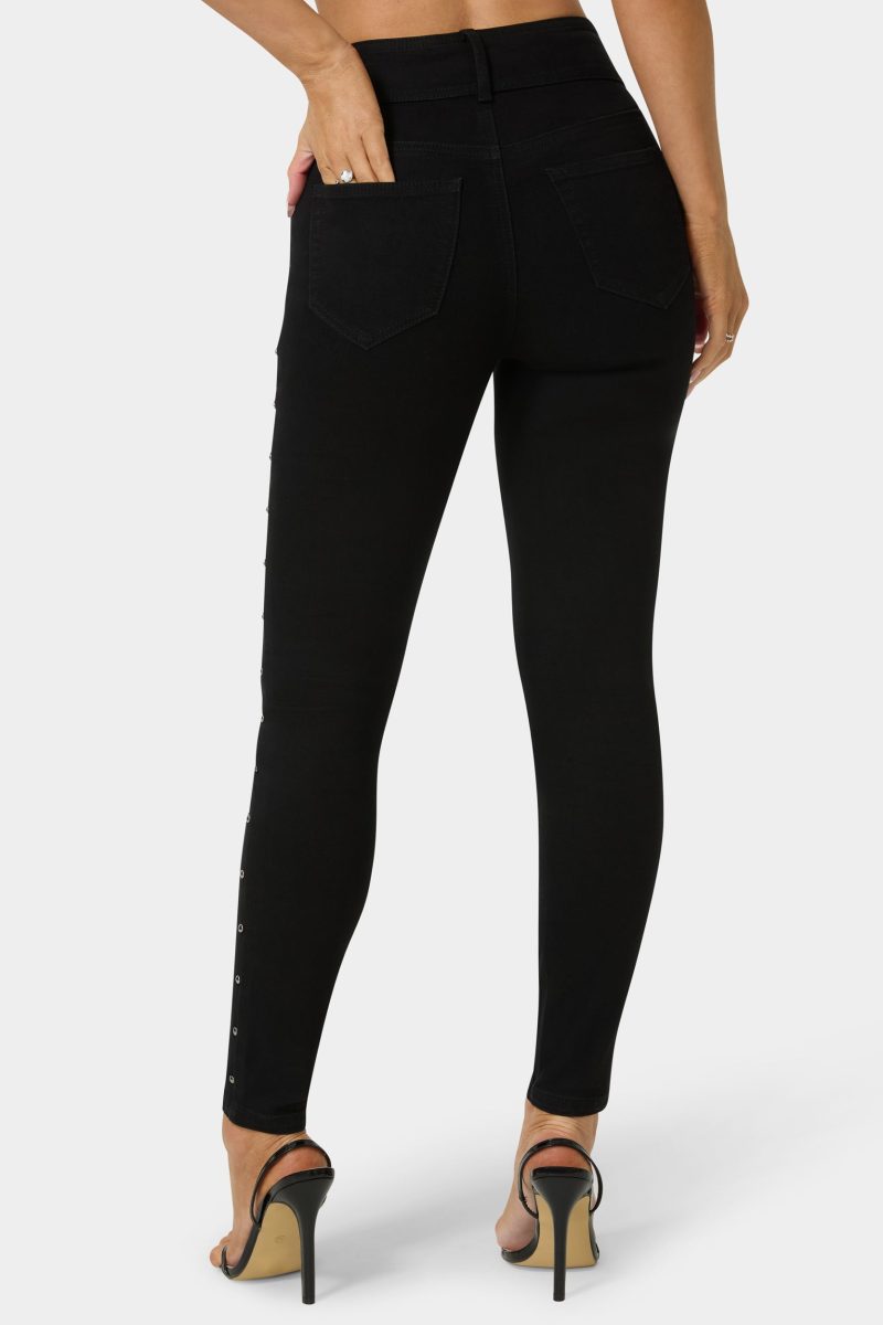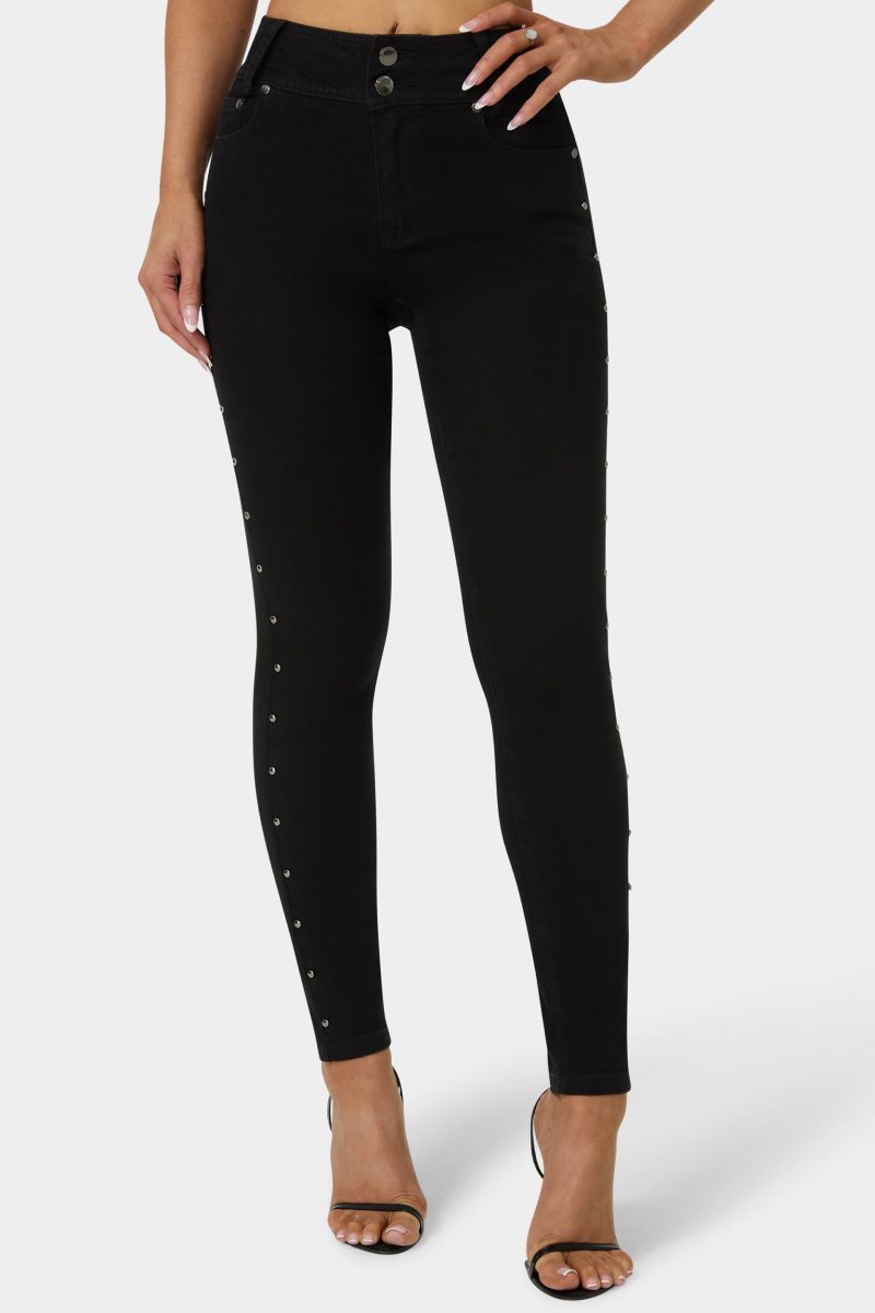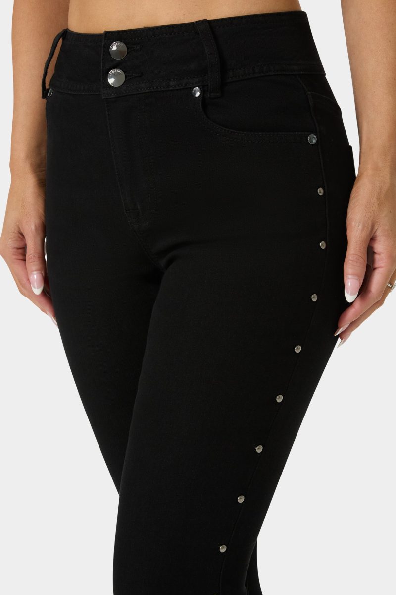 Studded details add a unique edge to these skinny jeans; perfect for jazzing up casual ensembles.