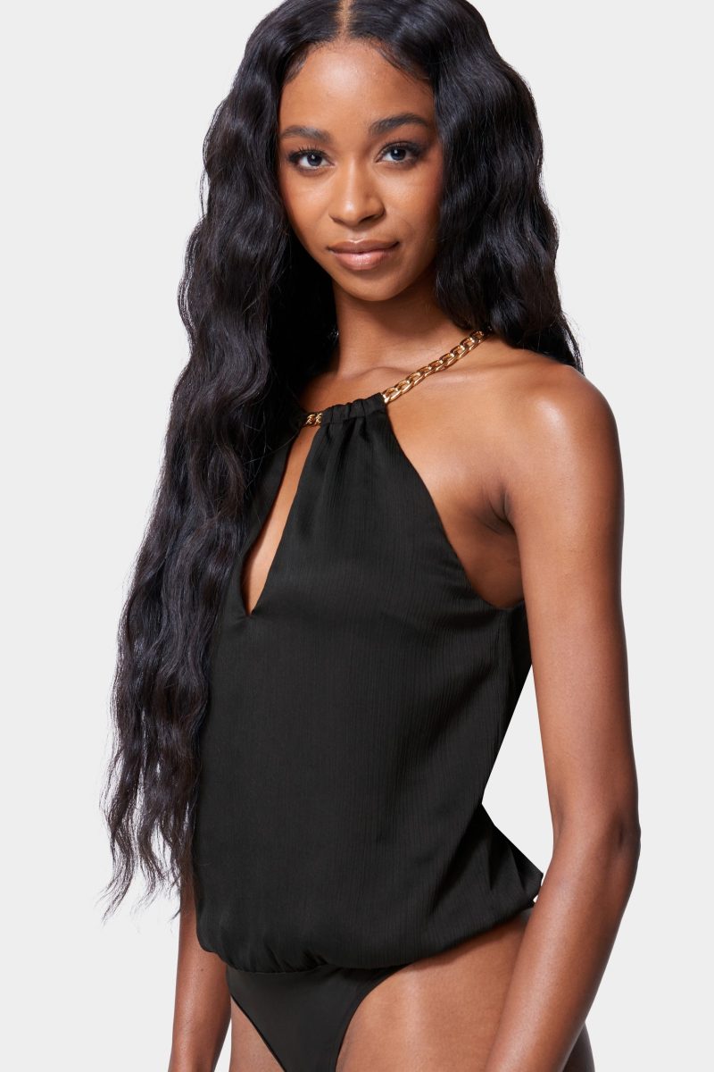 All eyes on you. This silky soft bodysuit features a sexy cutout halter design with chain detailing and a slightly billowy fit that pairs well with tailored pants or jeans.