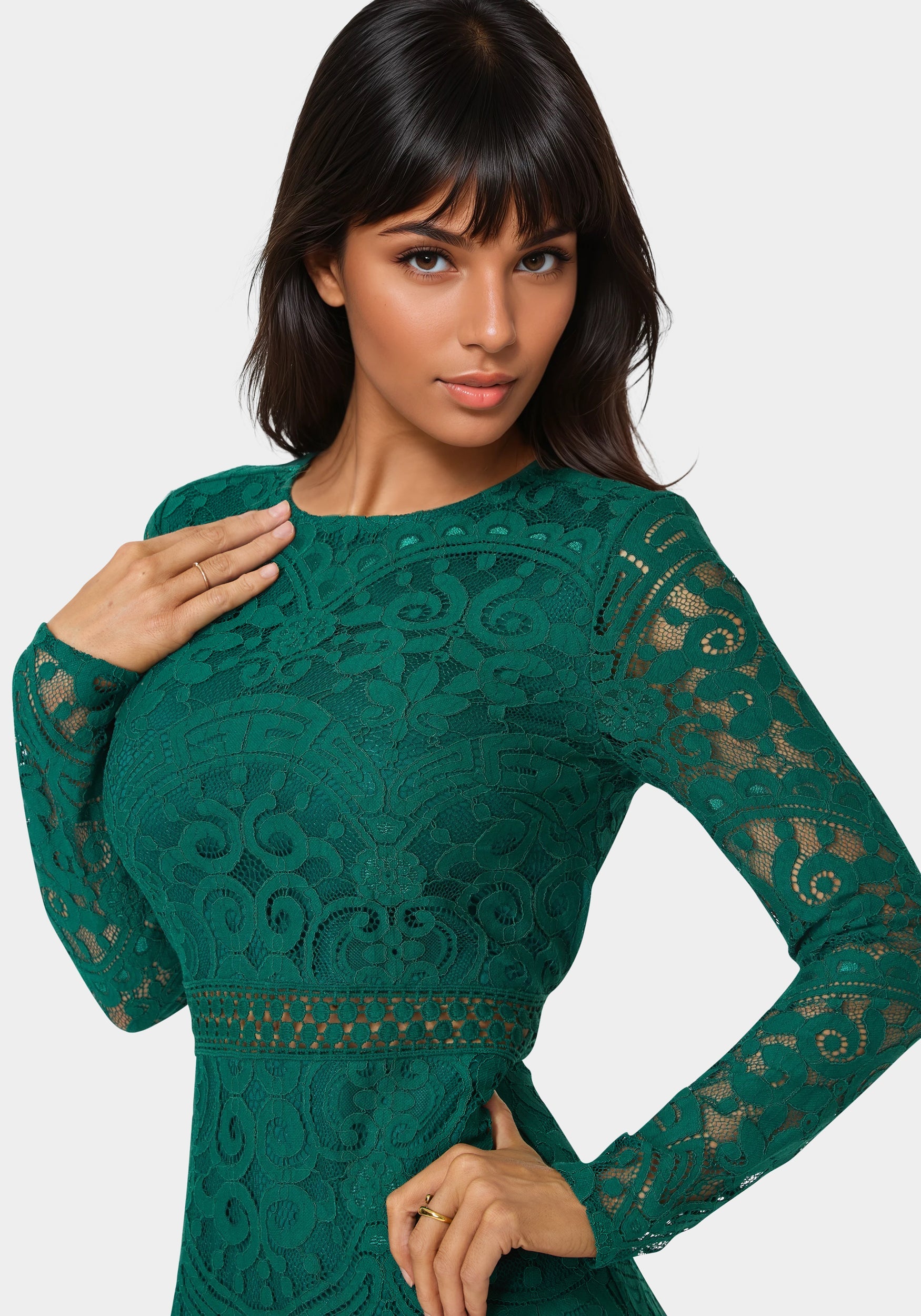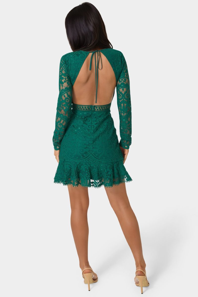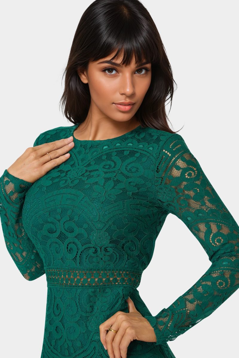 This mini-length lace dress features long sleeves and an eye-catching open back. Effortless for weddings. parties. or romantic evenings. it adds just enough drama to stand out.