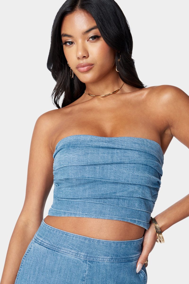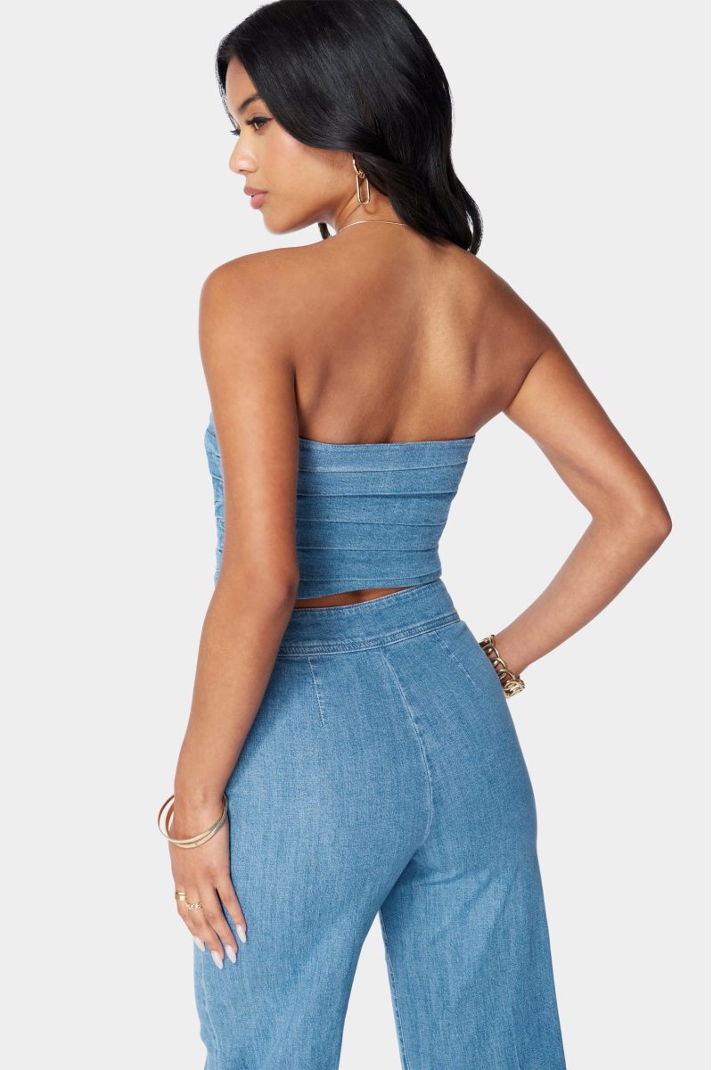 A denim top features a sleeveless bandeau cut and all-over denim pleated. Make it a sexy Canadian-tuxedo with bebe denim and strappy heels for a trendy night out look.