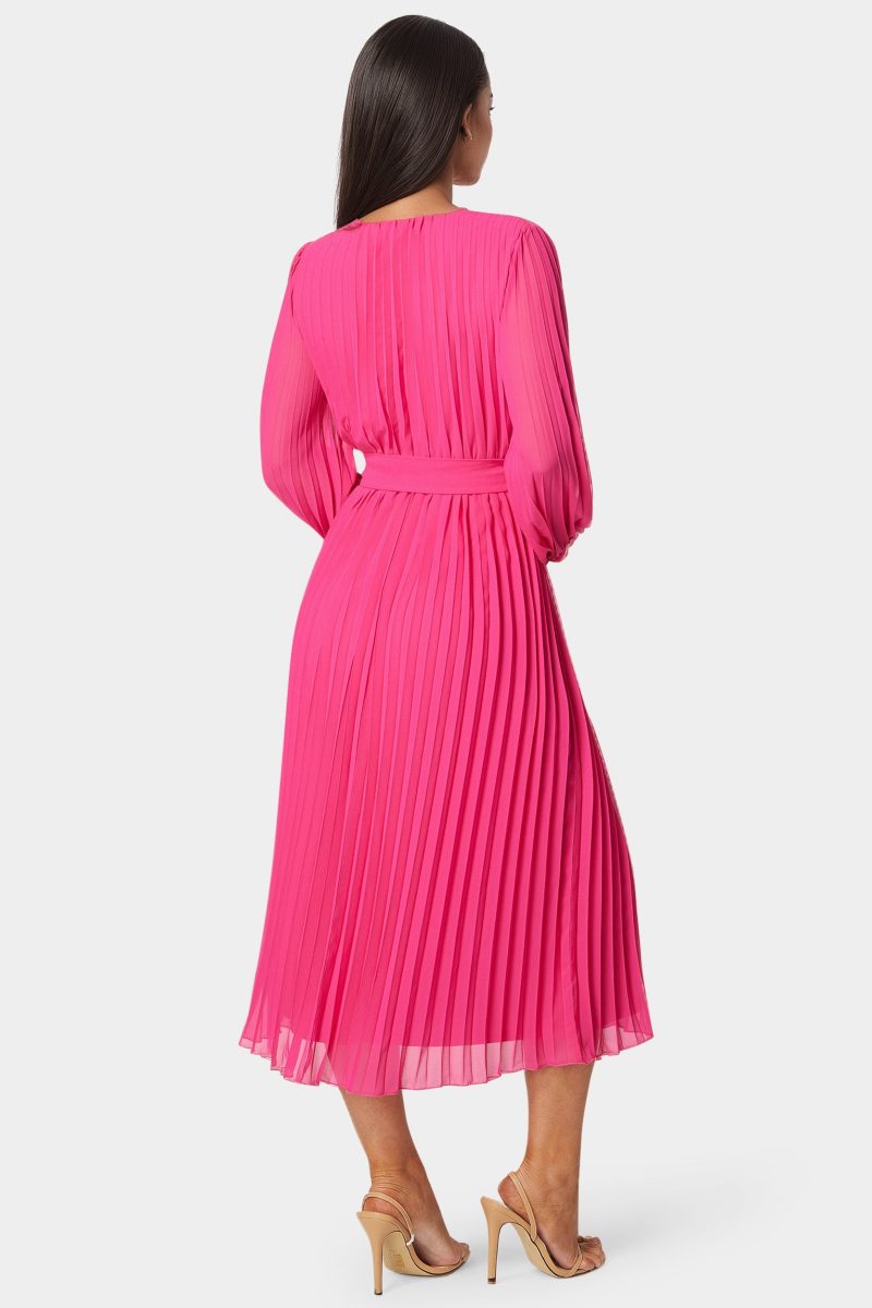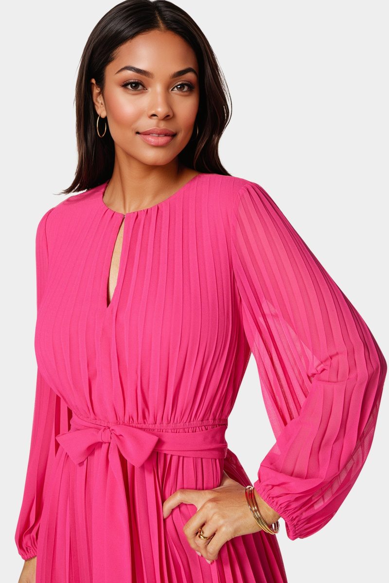 Own the room in this pleated gown with long sleeves and a self-tie belt. A keyhole neckline adds subtle intensity to its timeless. formal edge.
