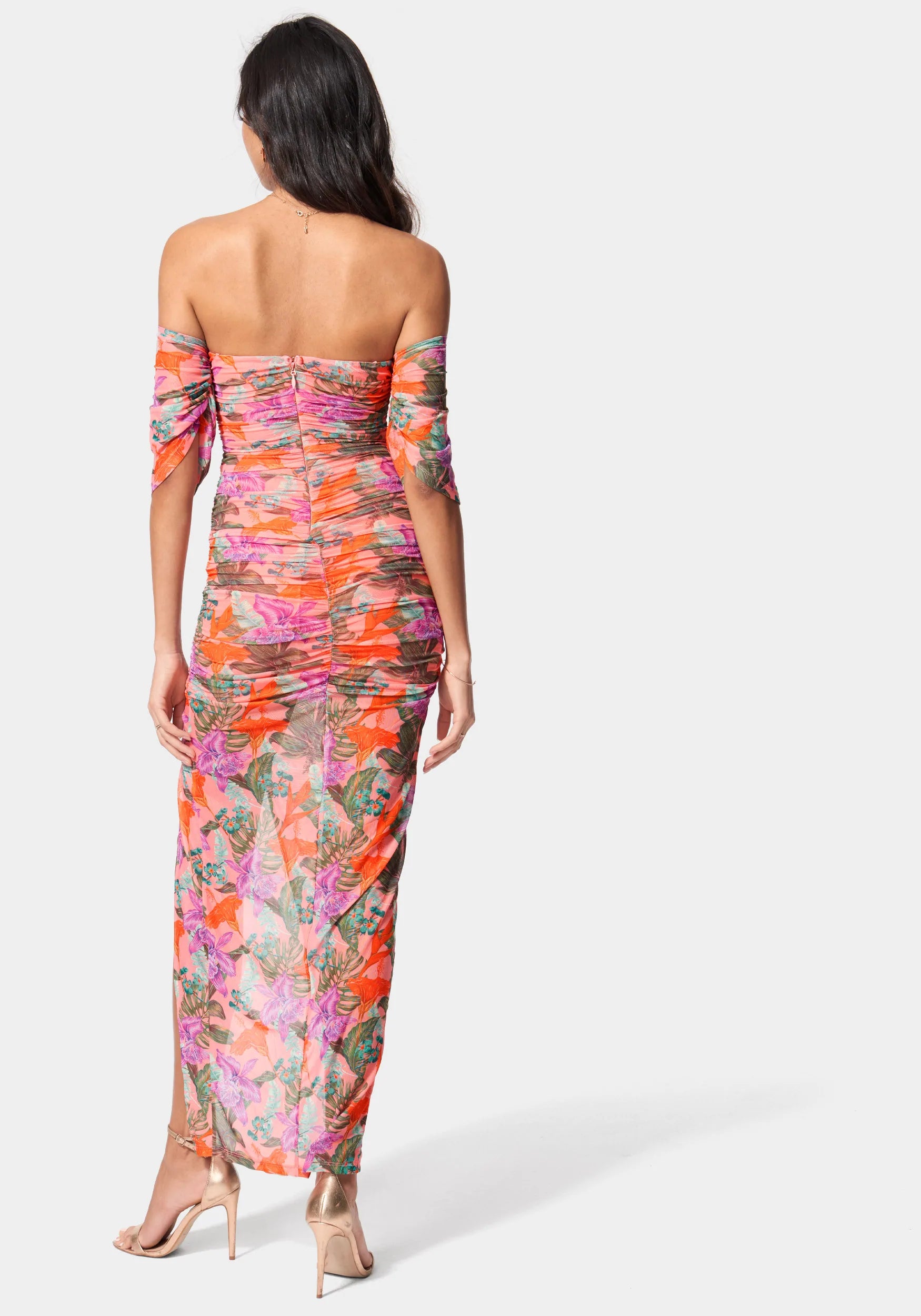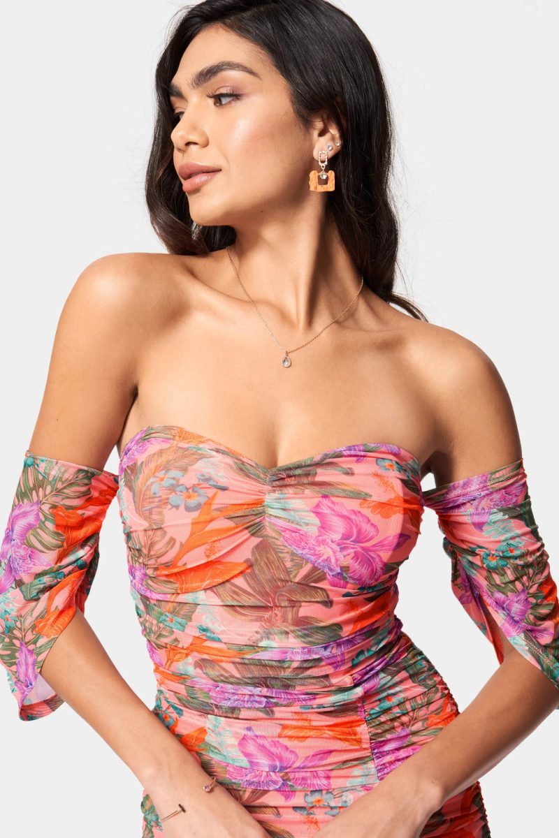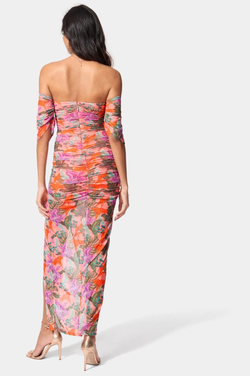 Printed Off Shoulder Mesh Gown