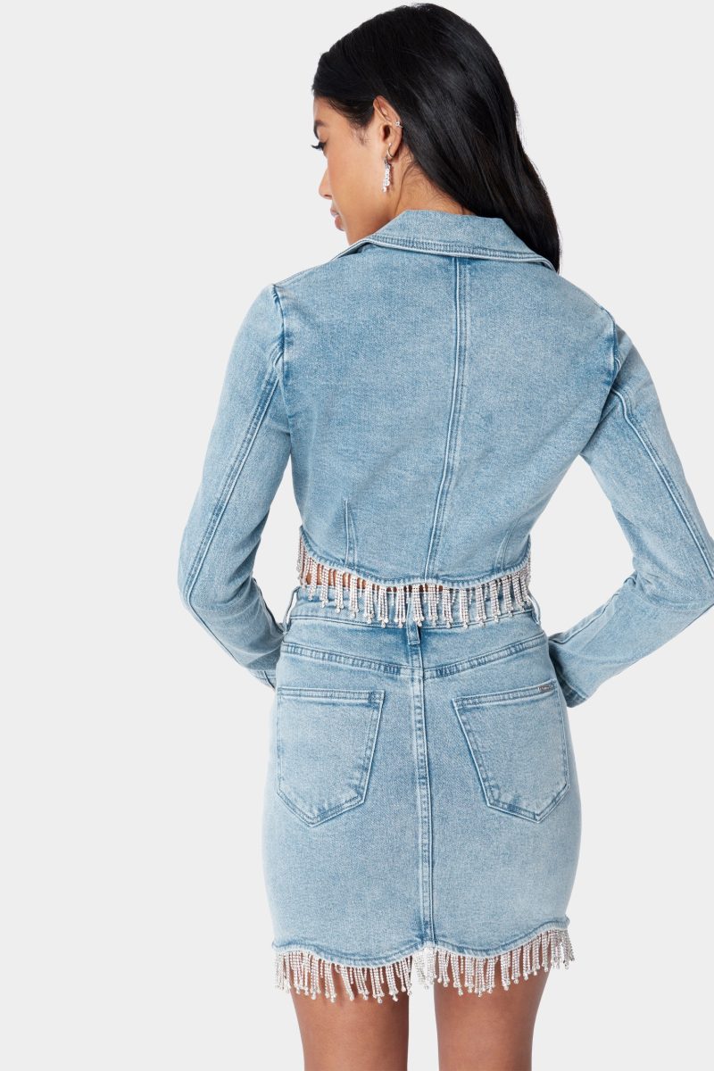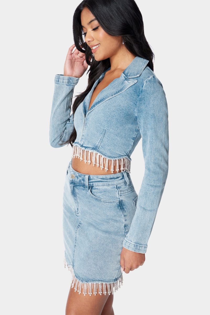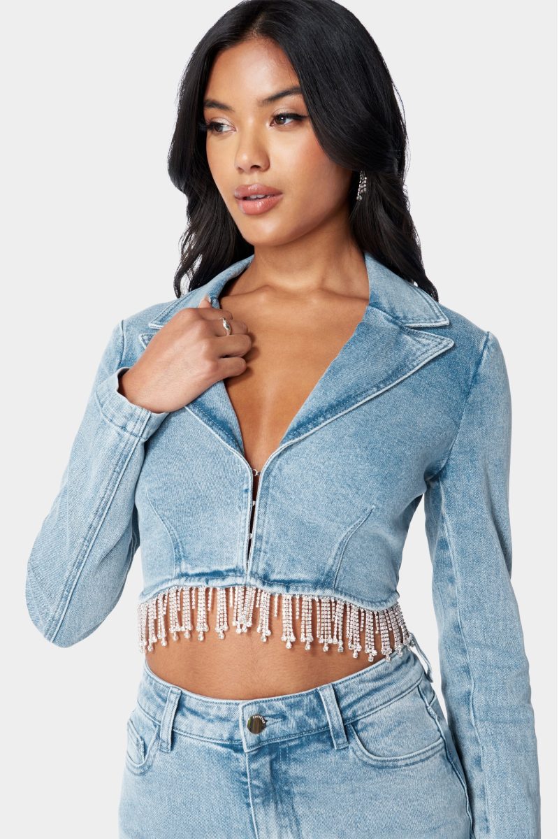 A tailored denim jacket features a cropped fit and on-trend rhinestone hem. Both the denim fabric and gems are durable. so you can dance the night away without a worry. Pair with matching denim skirt to complete the city-cowgirl set.