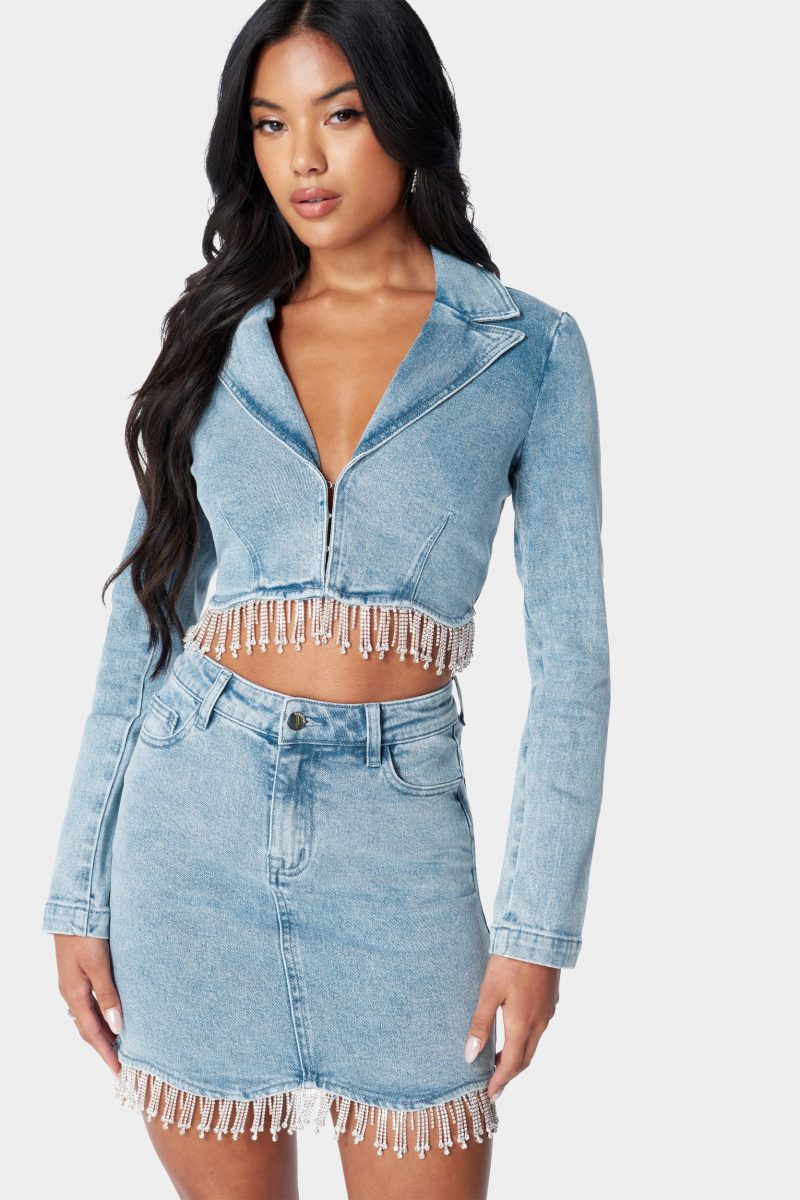 A tailored denim jacket features a cropped fit and on-trend rhinestone hem. Both the denim fabric and gems are durable. so you can dance the night away without a worry. Pair with matching denim skirt to complete the city-cowgirl set.