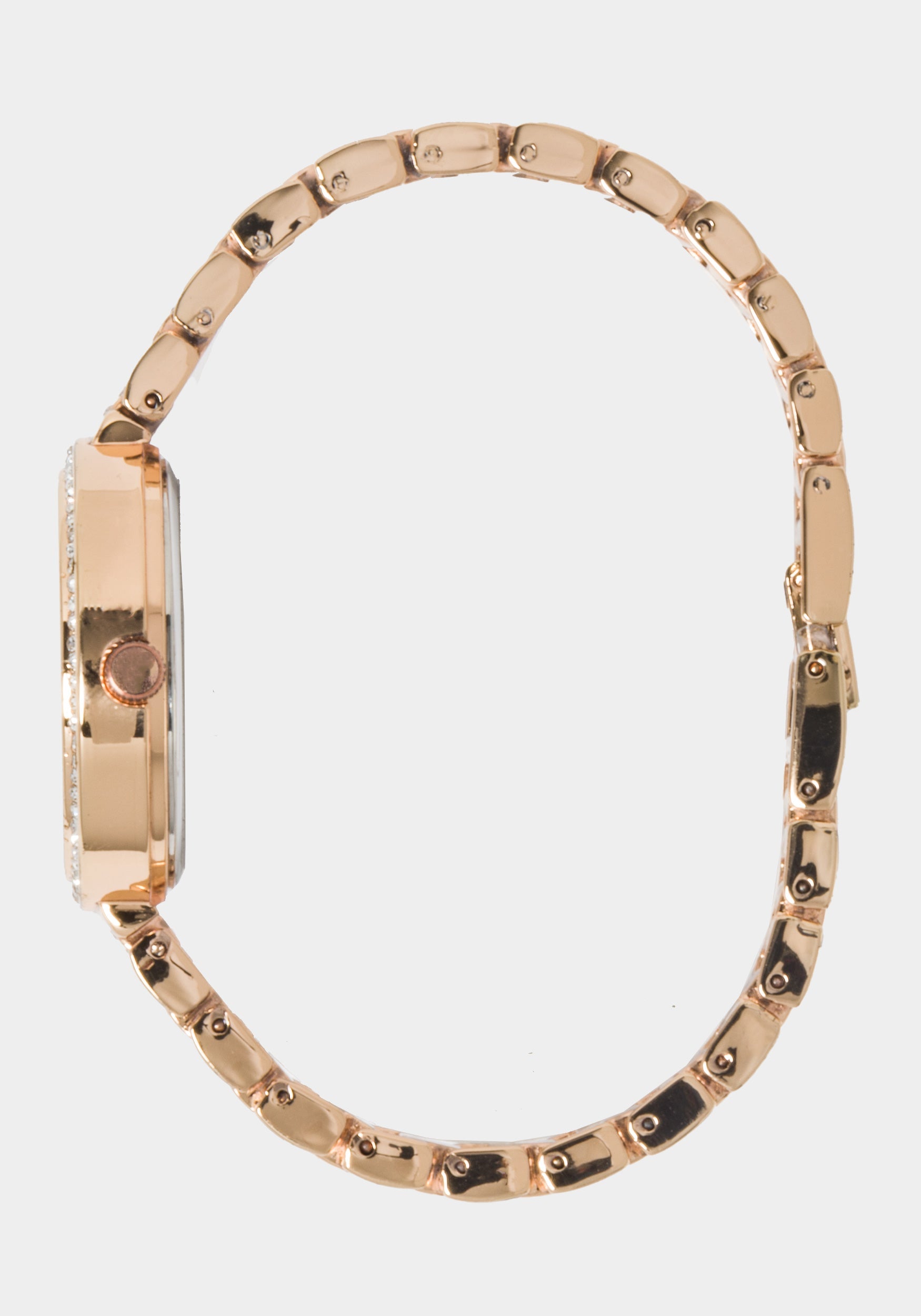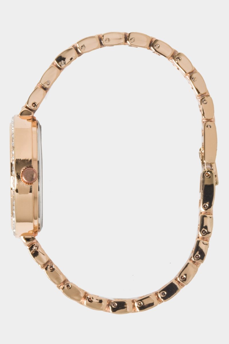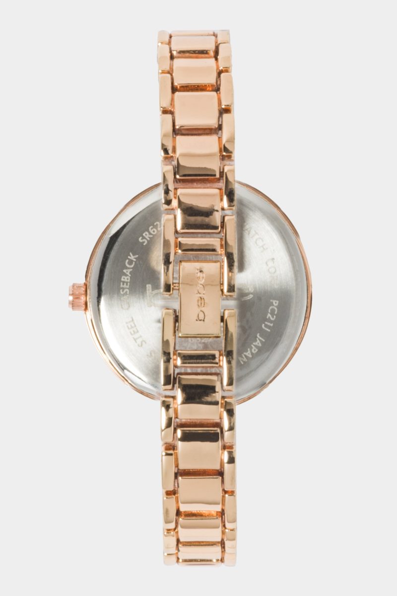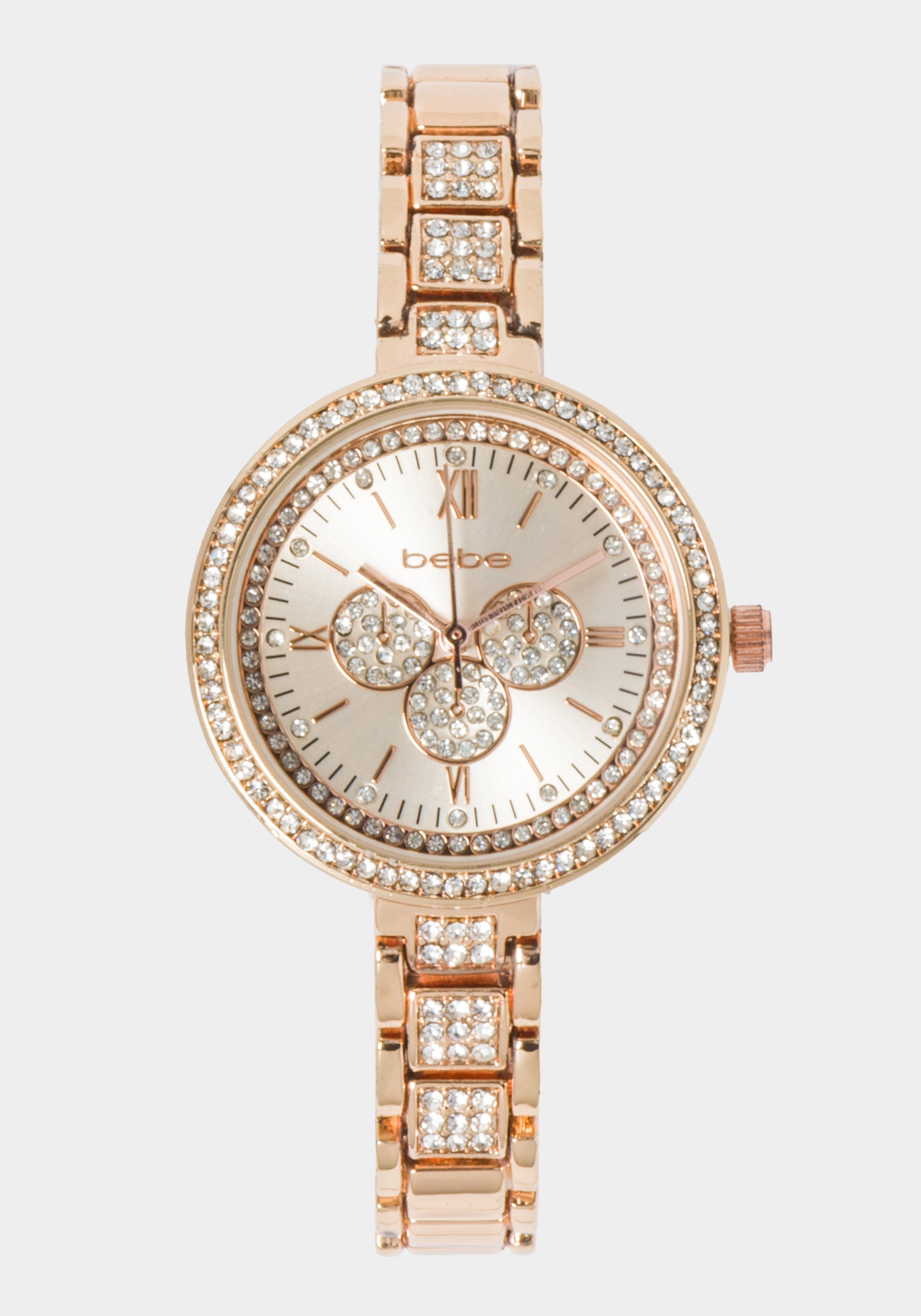A stylish choice for everyday wear. this rose gold tone bracelet design sparkles with crystals on the bezel and subdials. and clear pavé crystals on the dial.