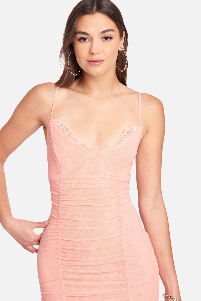 Revamp your closet in the Bebe Stretchy figure-hugging-shirred lace mini dress. The dress is lined in lace with a mesh overlay. scallop lace trim accent at the bust. princess seams. and a center-back invisible zipper.