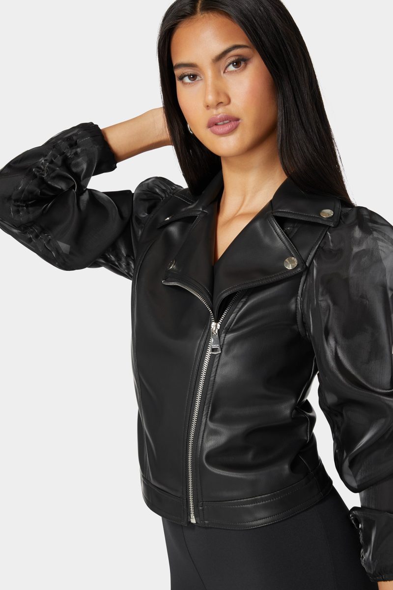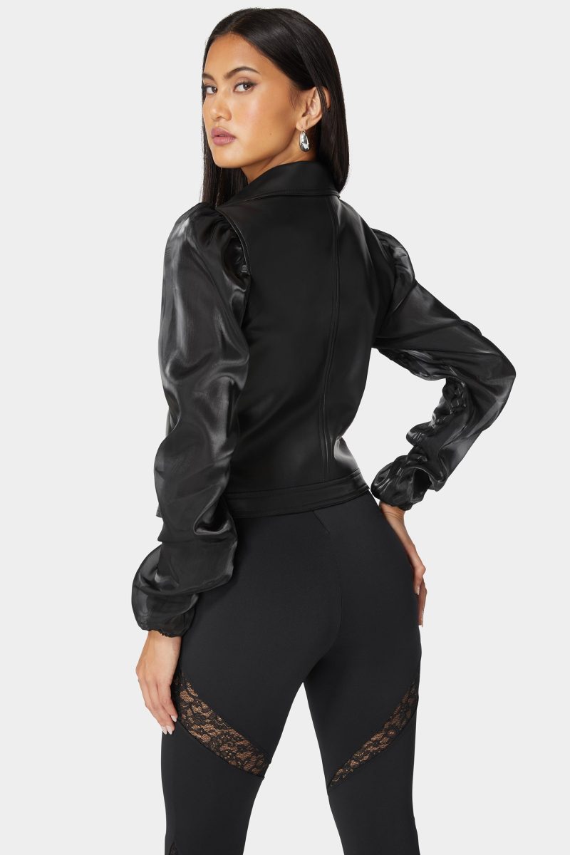 Revolutionize your wardrobe with the Ruched Organza Sleeve Vegan Leather Moto Jacket. This piece redefines edginess with its juxtaposition of rugged vegan leather and ethereal ruched organza sleeves. It’s a testament to contrasts. marrying strength with softness in a display of sartorial rebellion. Wear it as a declaration of your multifaceted personality. ready to conquer the world with poise and power.