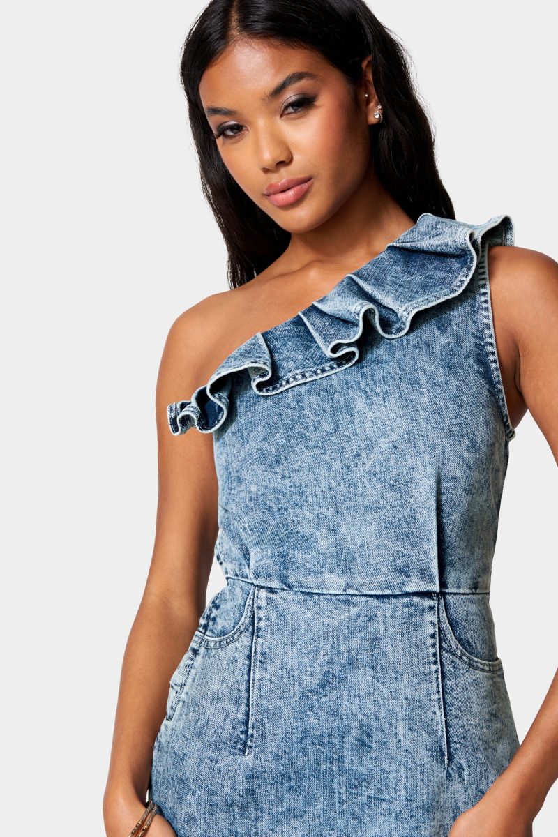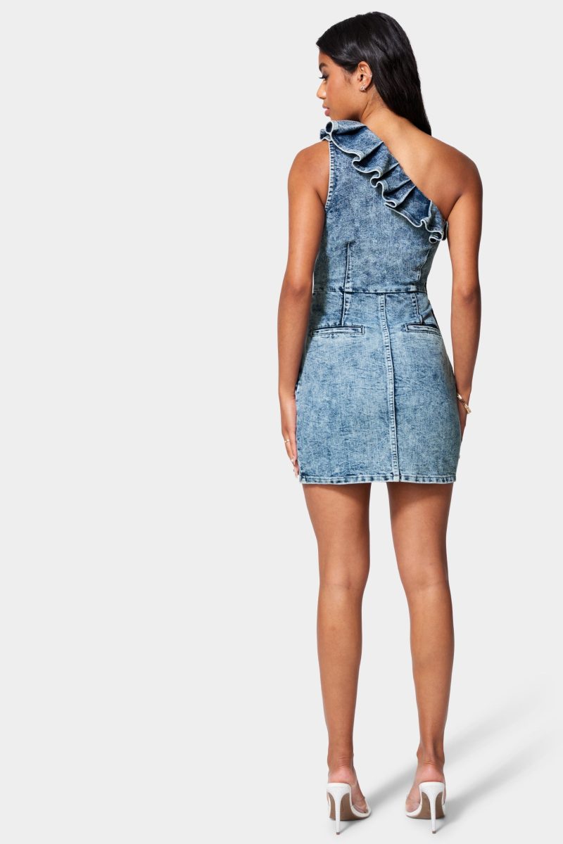Designed to be figure-flattering. this washed lurex denim mini dress features a ruffled one-shoulder design. seam-stitching throughout. and front slip pockets.