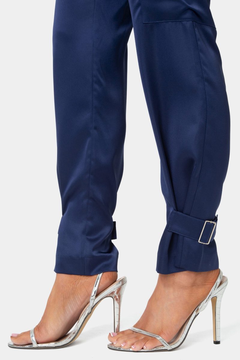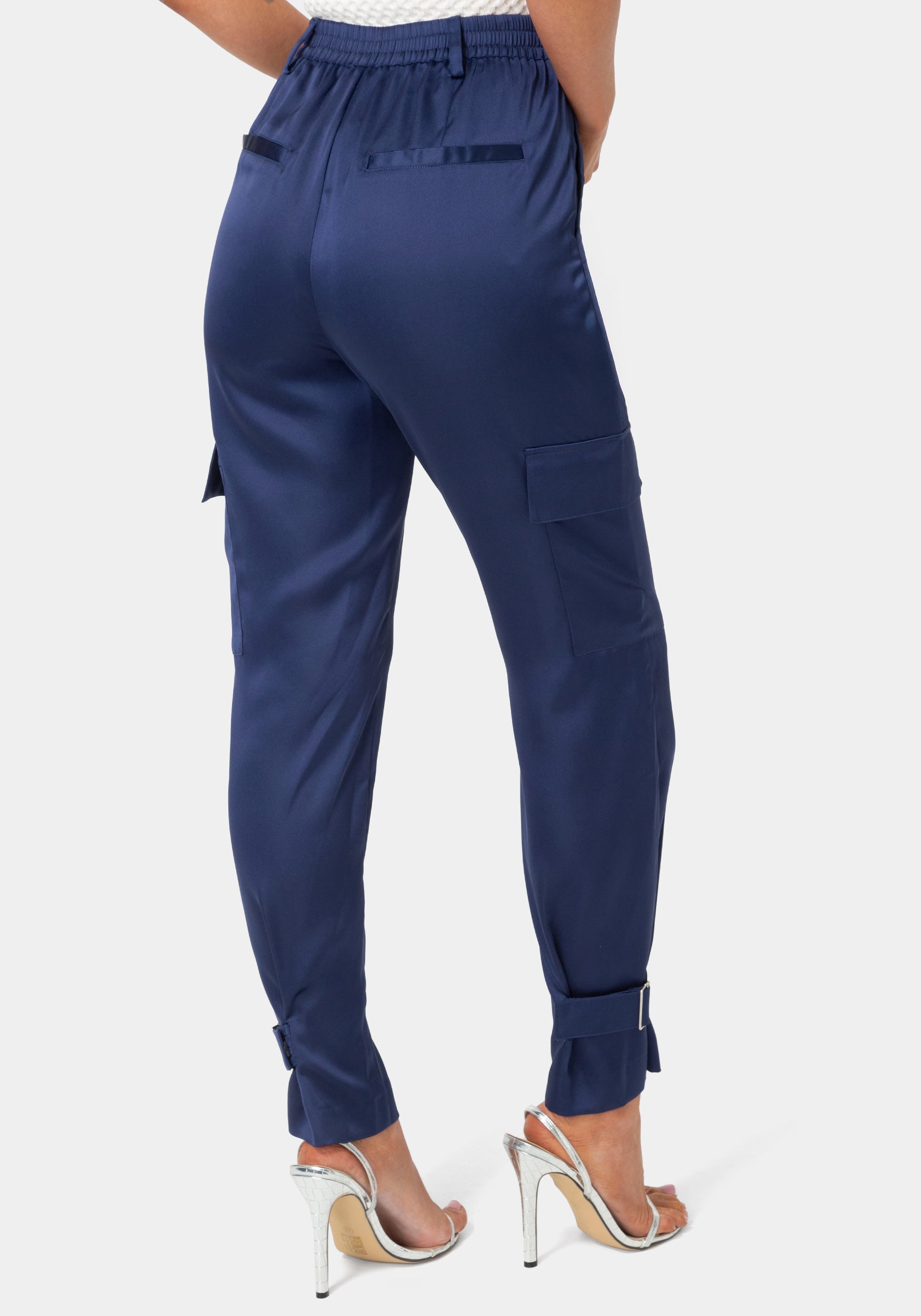 Combining comfort with style. these satin cargo joggers feature an adjustable hem and elasticated waistband for a perfect fit. Equipped with practical cargo pockets. they are ideal for casual outings or relaxed home wear.