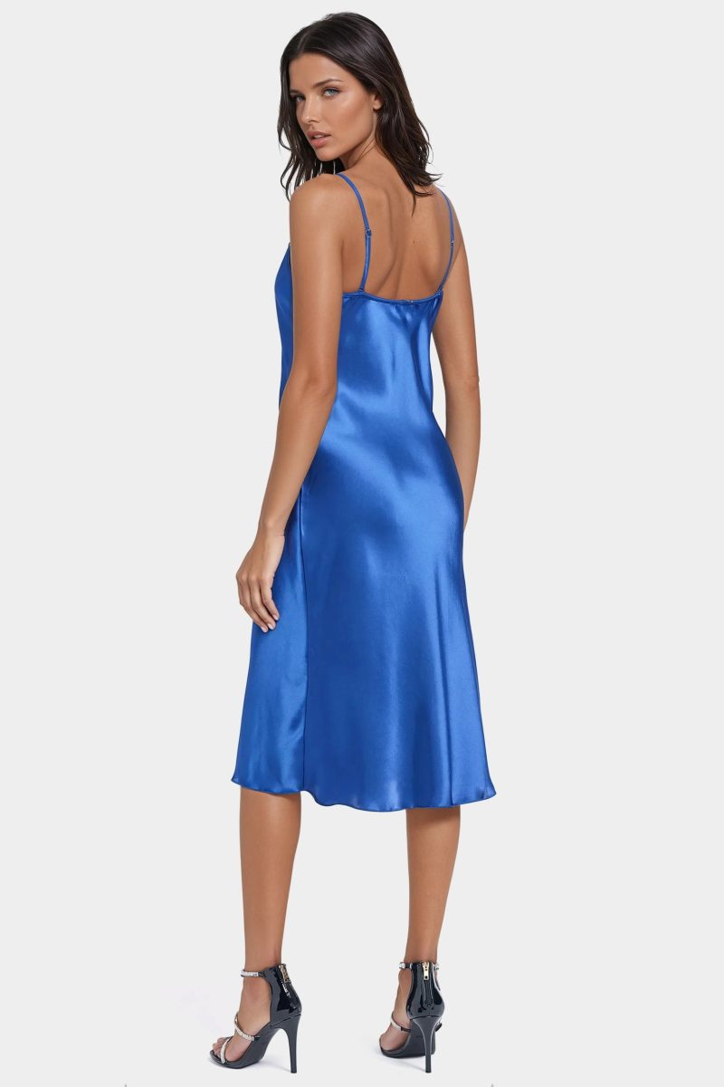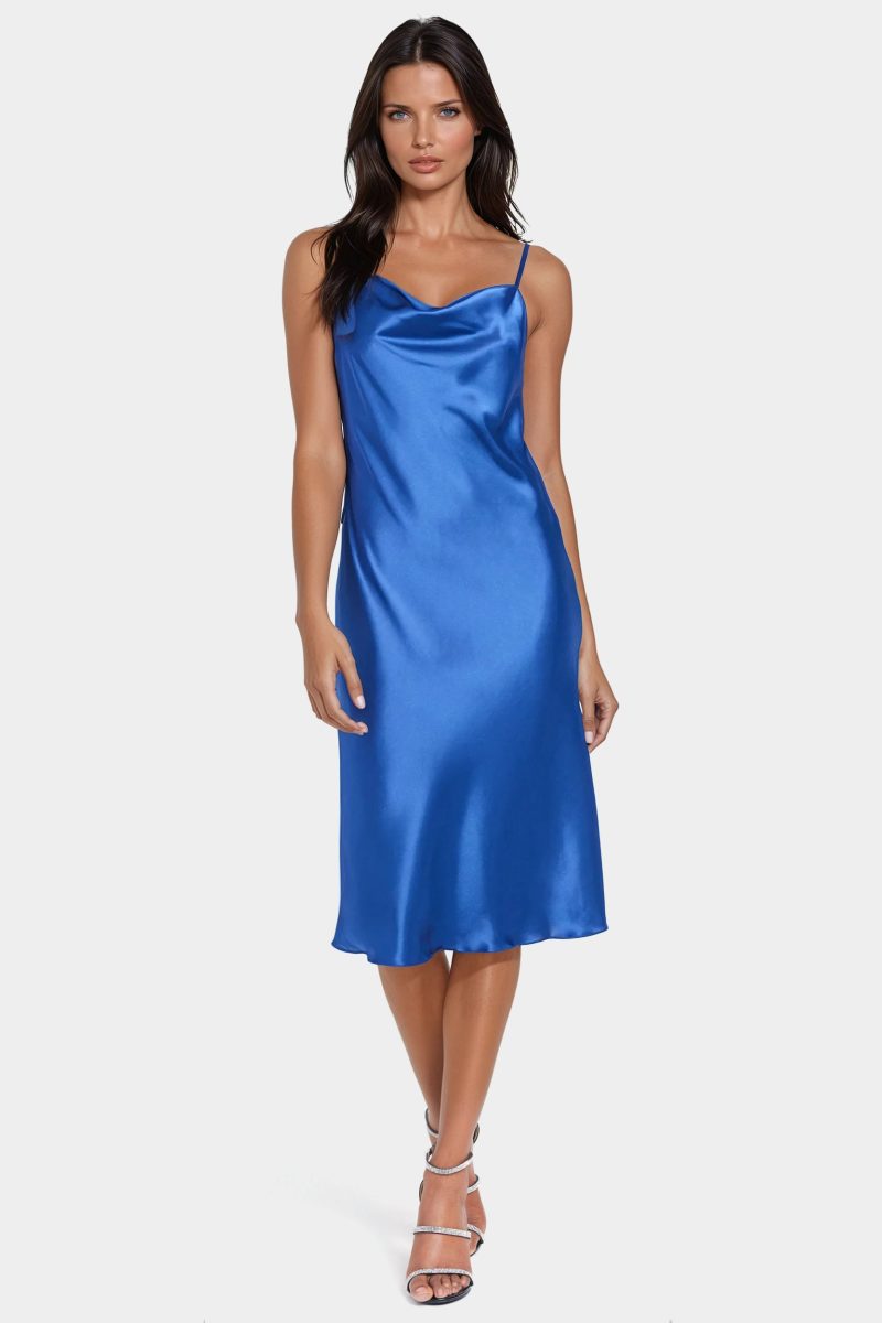The iconic satin slip dress makes a comeback. This cowl-neck midi style is a wardrobe staple.