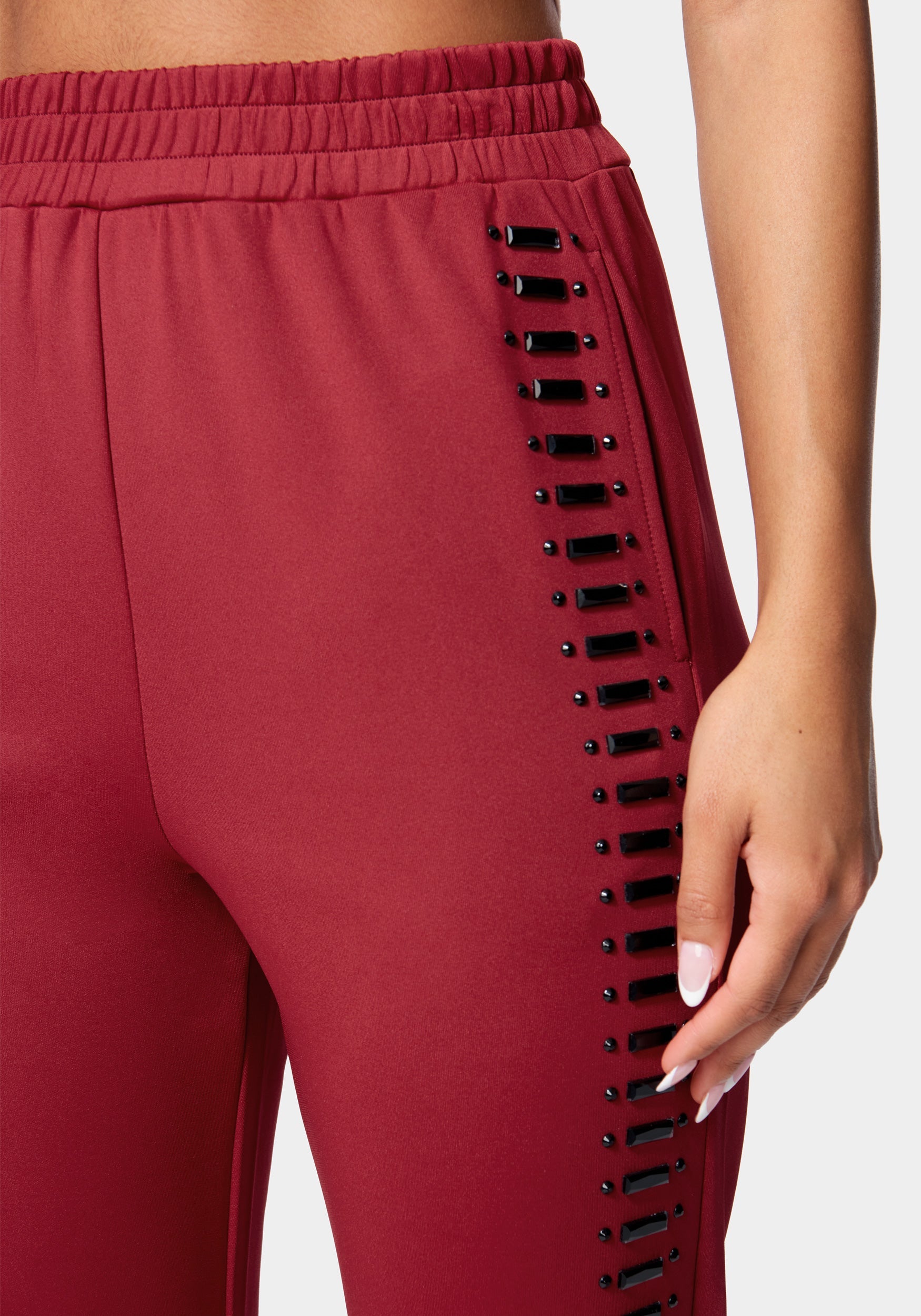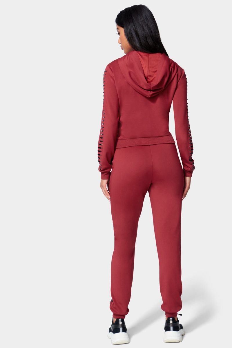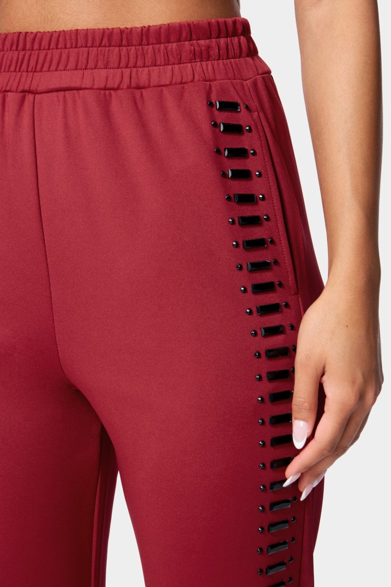 Work it out. This is a scuba knit jogger featuring gemstone embellishments. a drawstring waistband. and front slip pockets. Pairs perfectly with the Scuba Embellished Zip Up Hoodie.