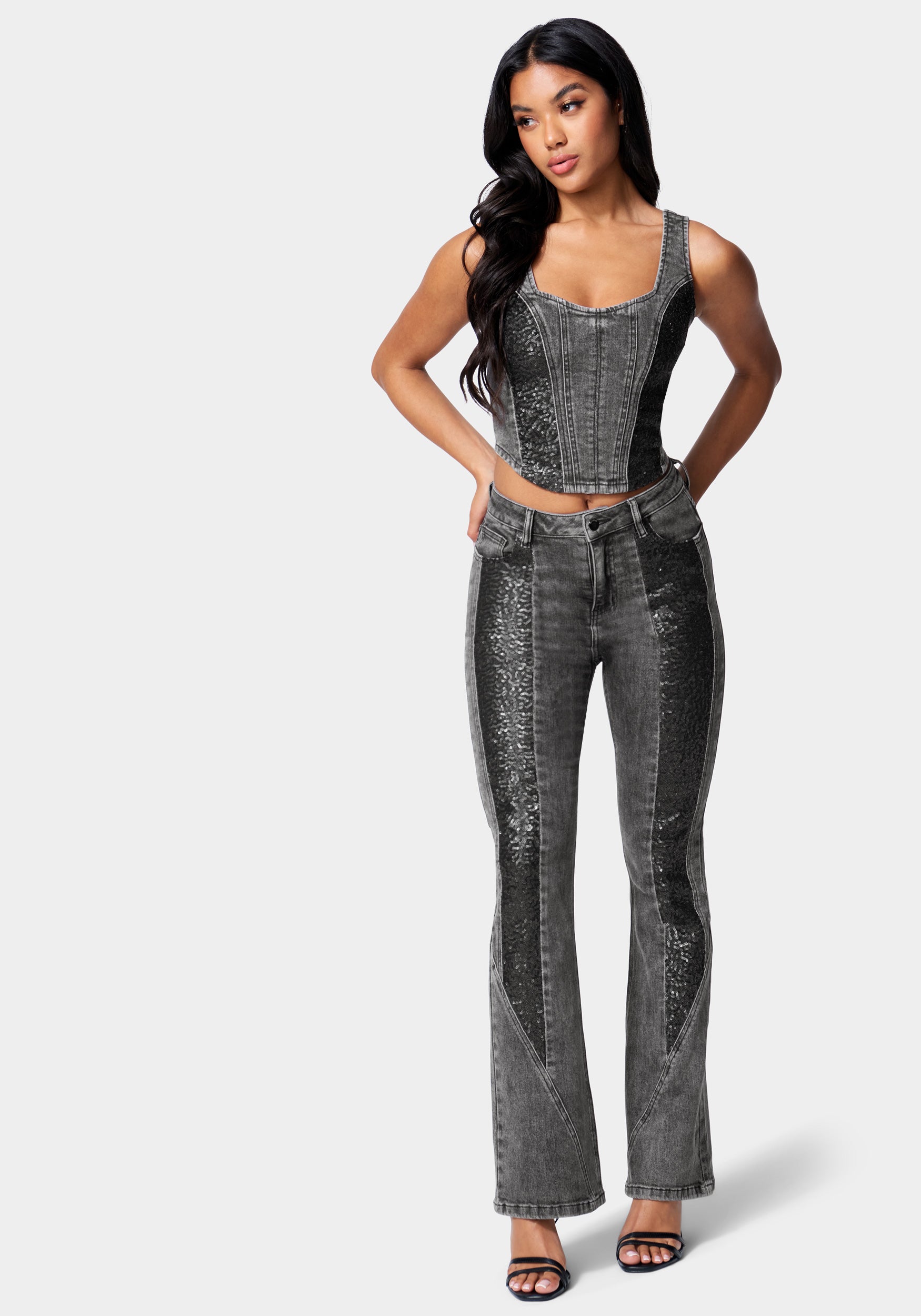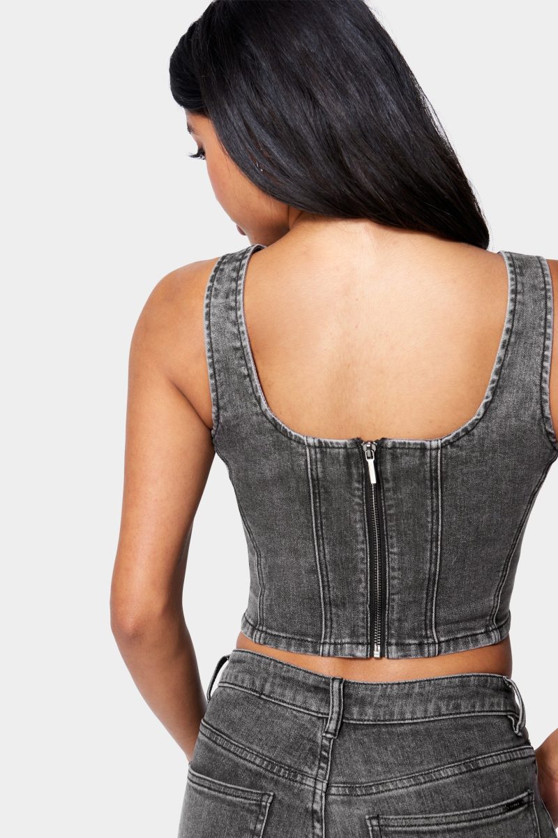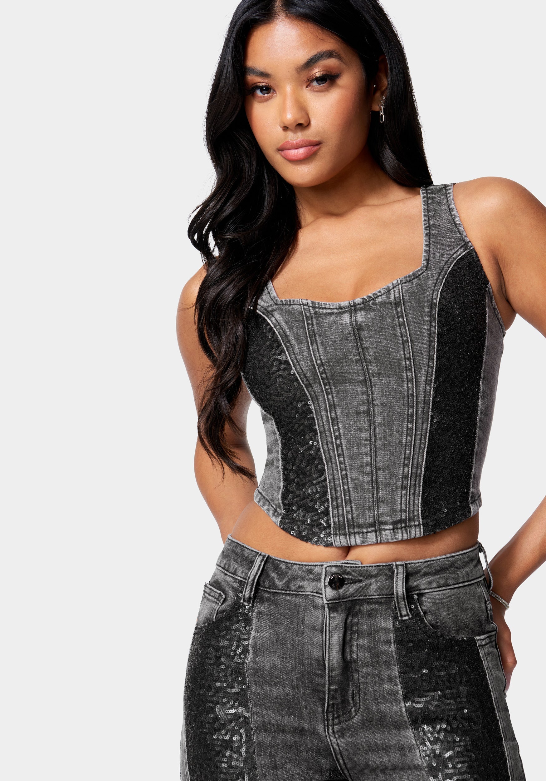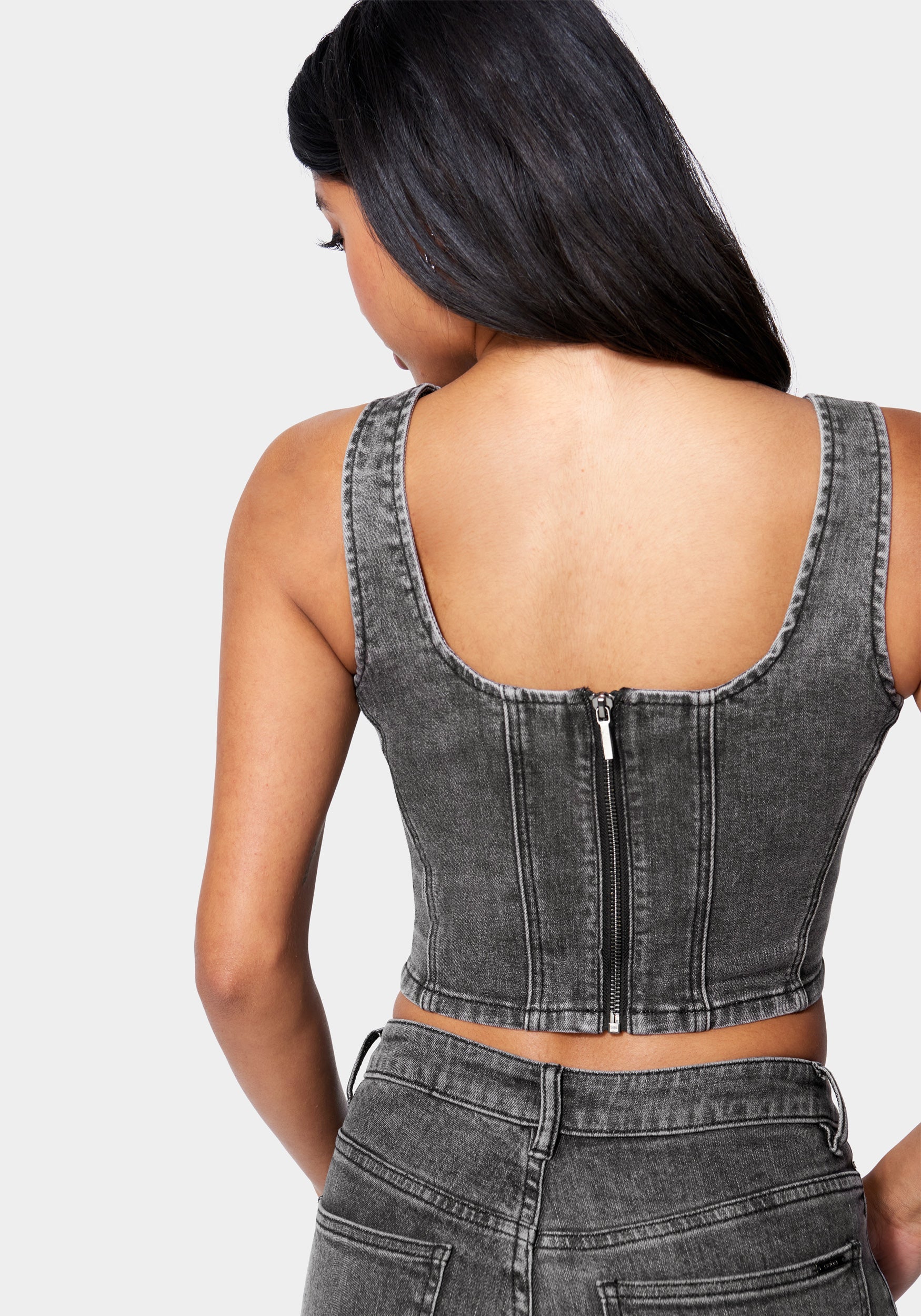 Crafted in a vintage stretch denim. this bustier features sequin inserts. corset stitching. and a back zipper for the perfect fit.