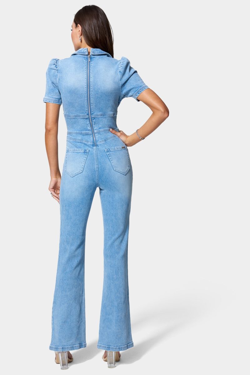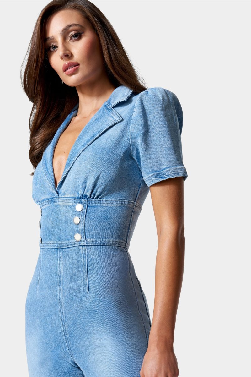 One and done denim. This is a short sleeve jumpsuit with a deep v neckline. featuring notched lapels. button detailed waist. back slip pockets. and a back zipper closure for a perfect fit.