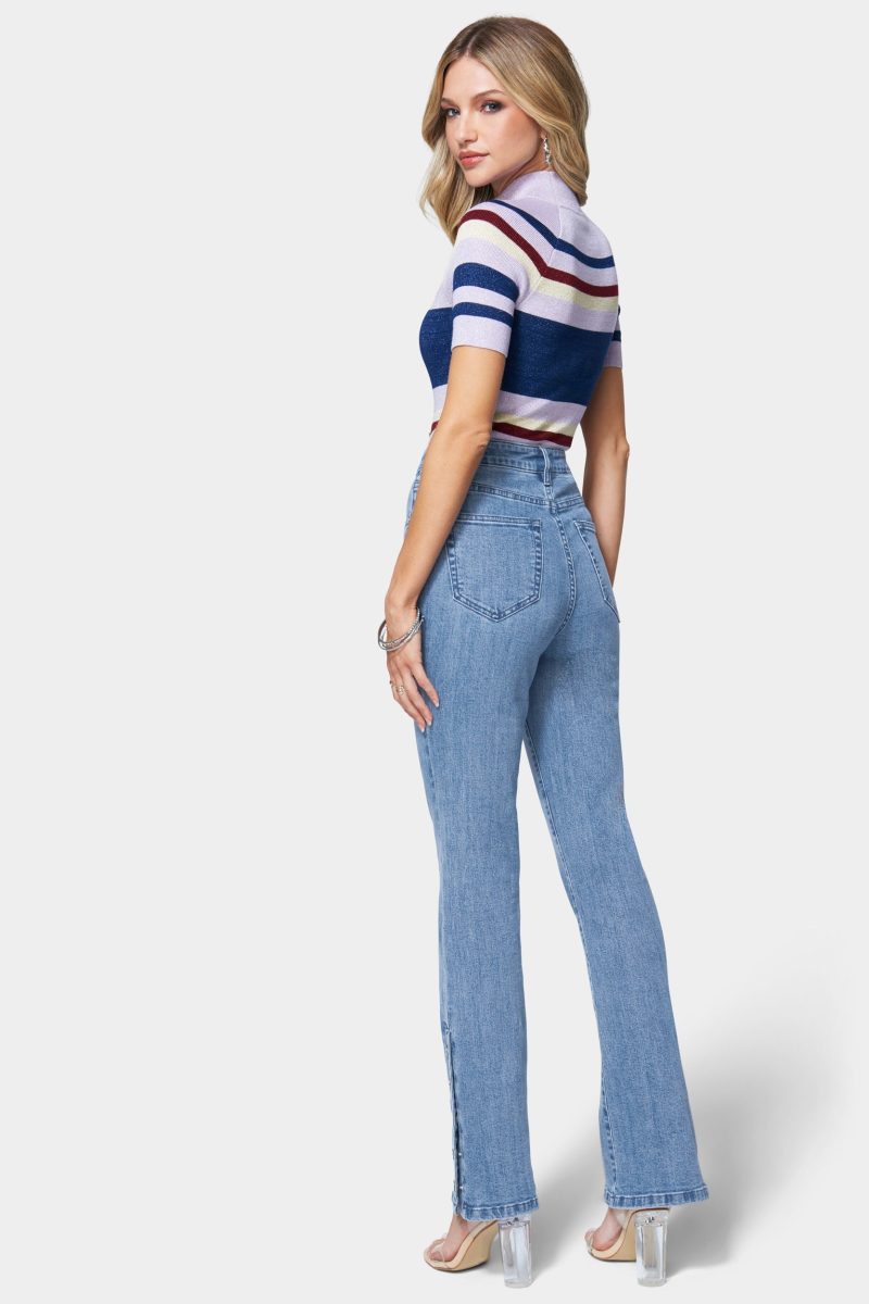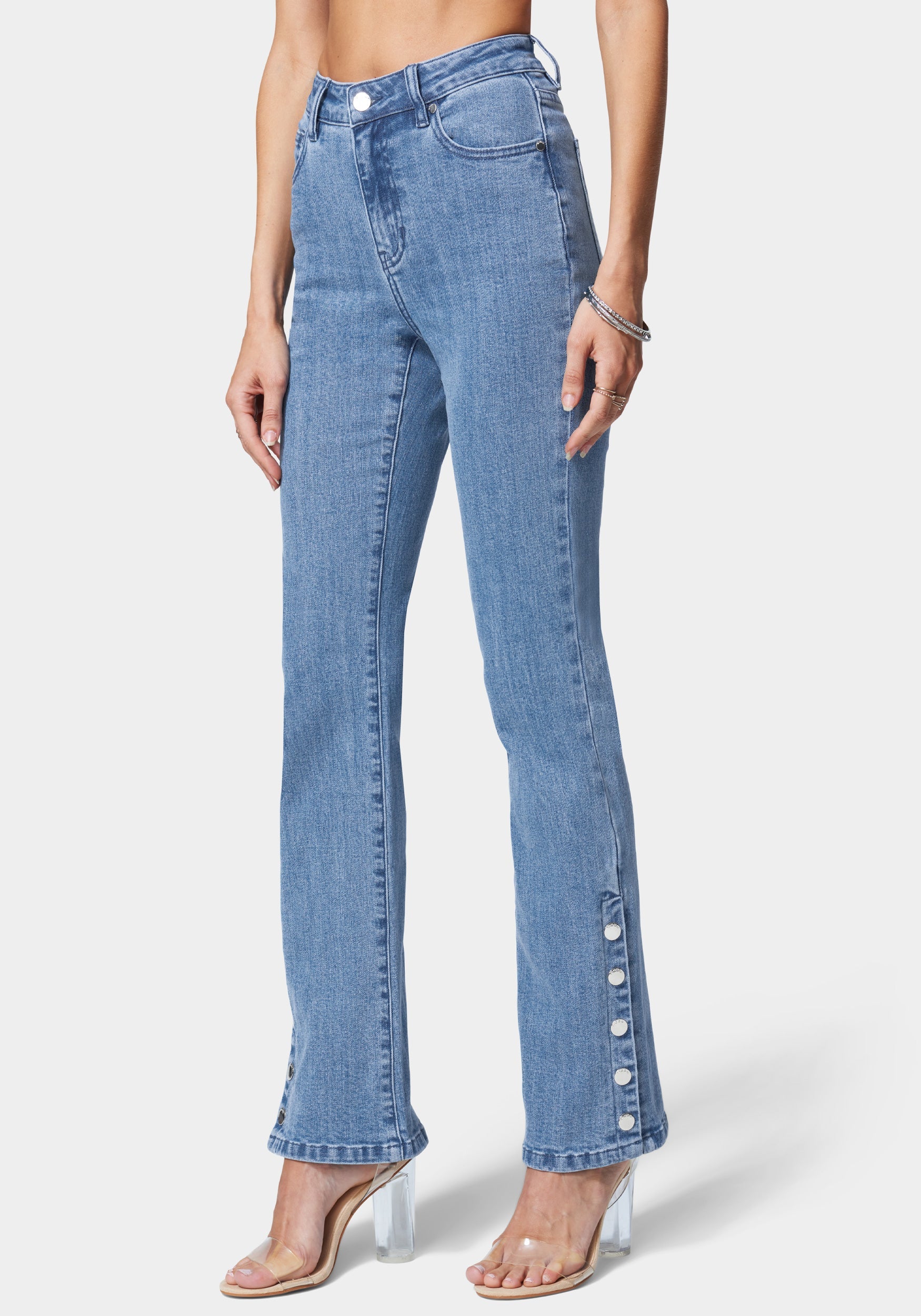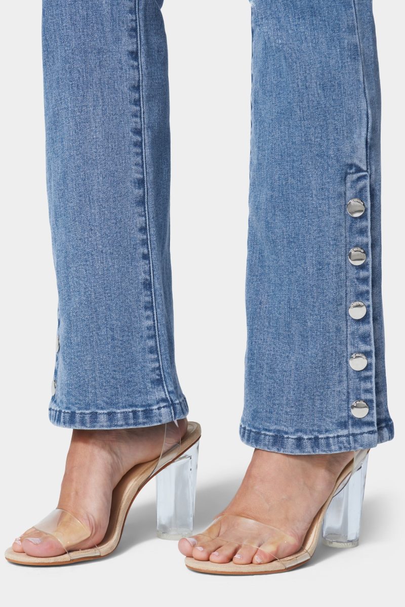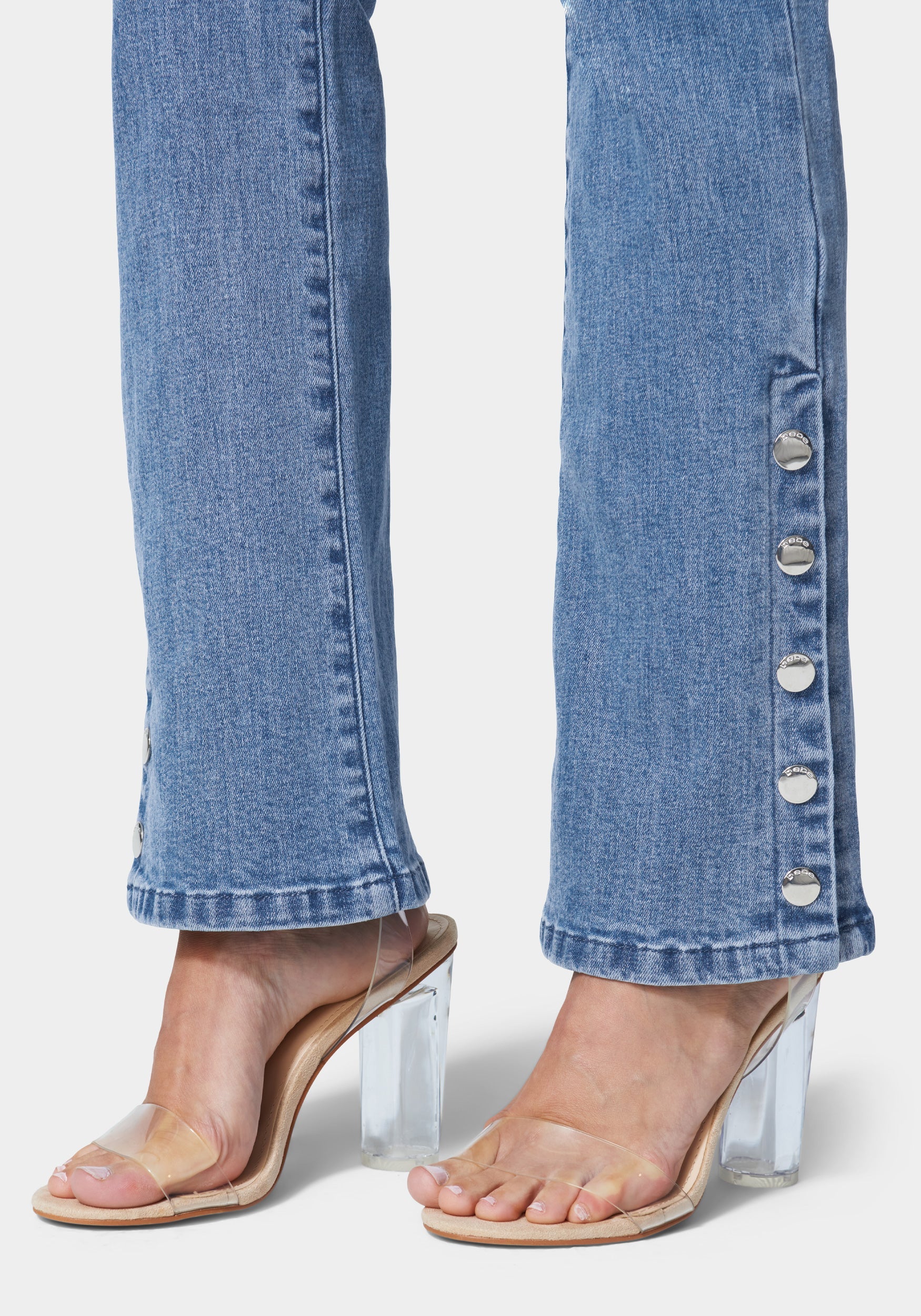 Vintage flare. These medium-washed jean sits high at the waist and flares through the leg. complete with side snap closures at the hem. and front and back slip pockets.